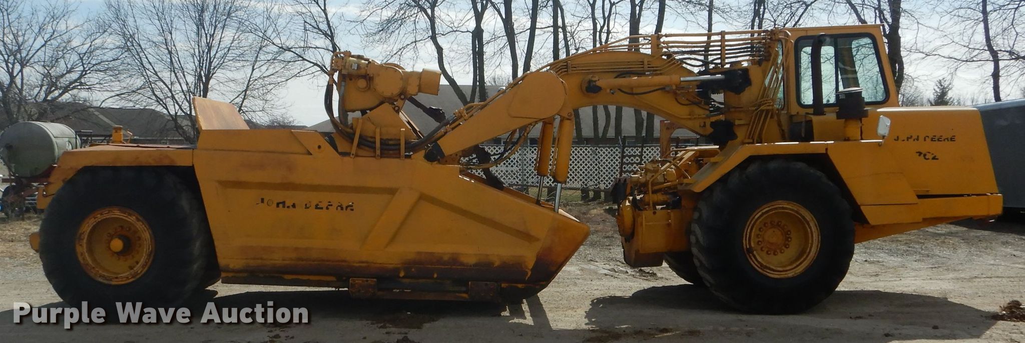 Purple Wave is selling a used Elevating Scraper in Iowa. This item is a 1977 John Deere 762 elevating scraper with the following: 6,540 hours on meter, John Deere six cylinder diesel engine, Serial 6619TT-01022344RG, Powershift transmission, 4F-1R gears, Enclosed cab, Lever scraper controls, Elevator reverse, Hydraulic lift, Hydraulic brakes, 23.5-25 tires, Serial 002144T