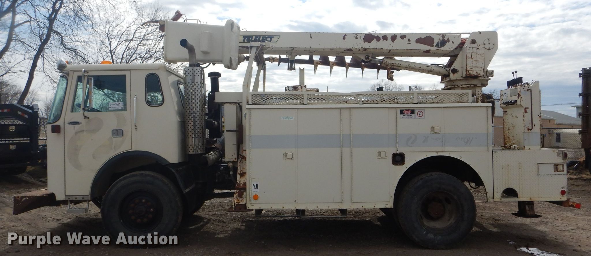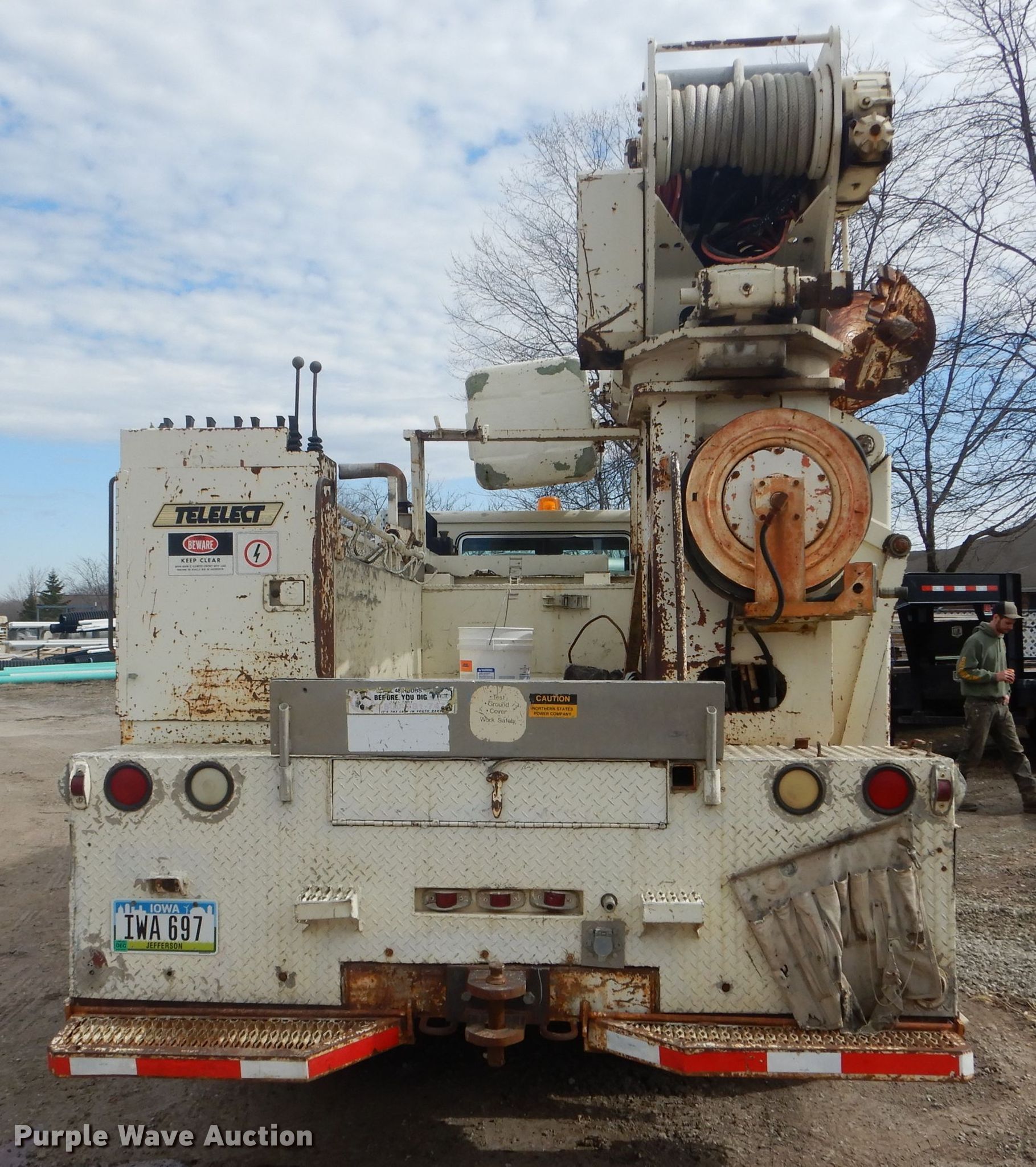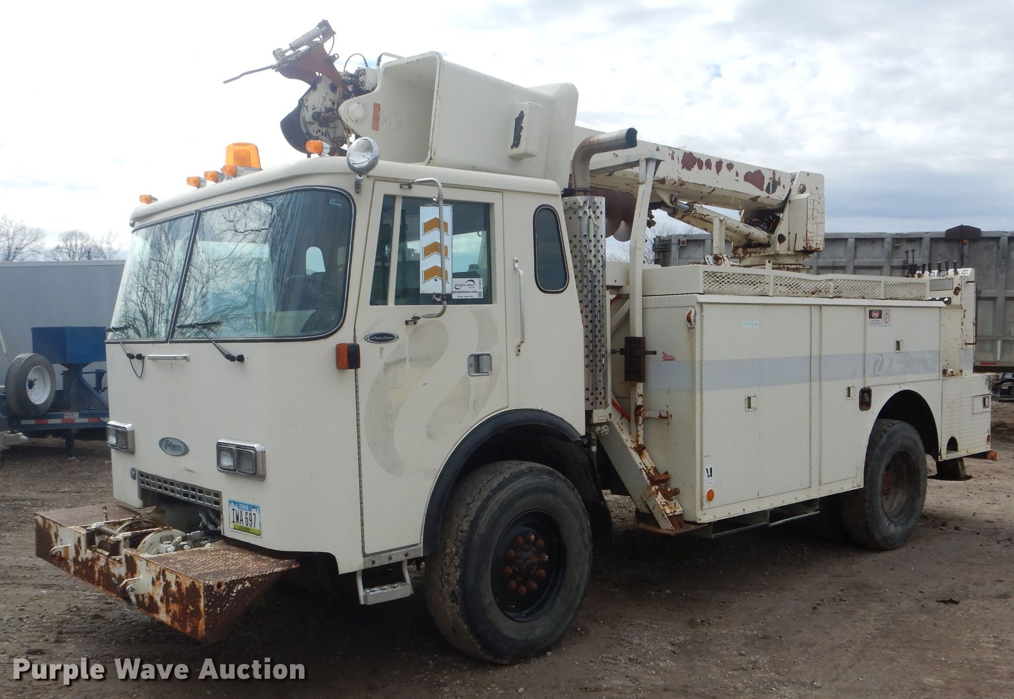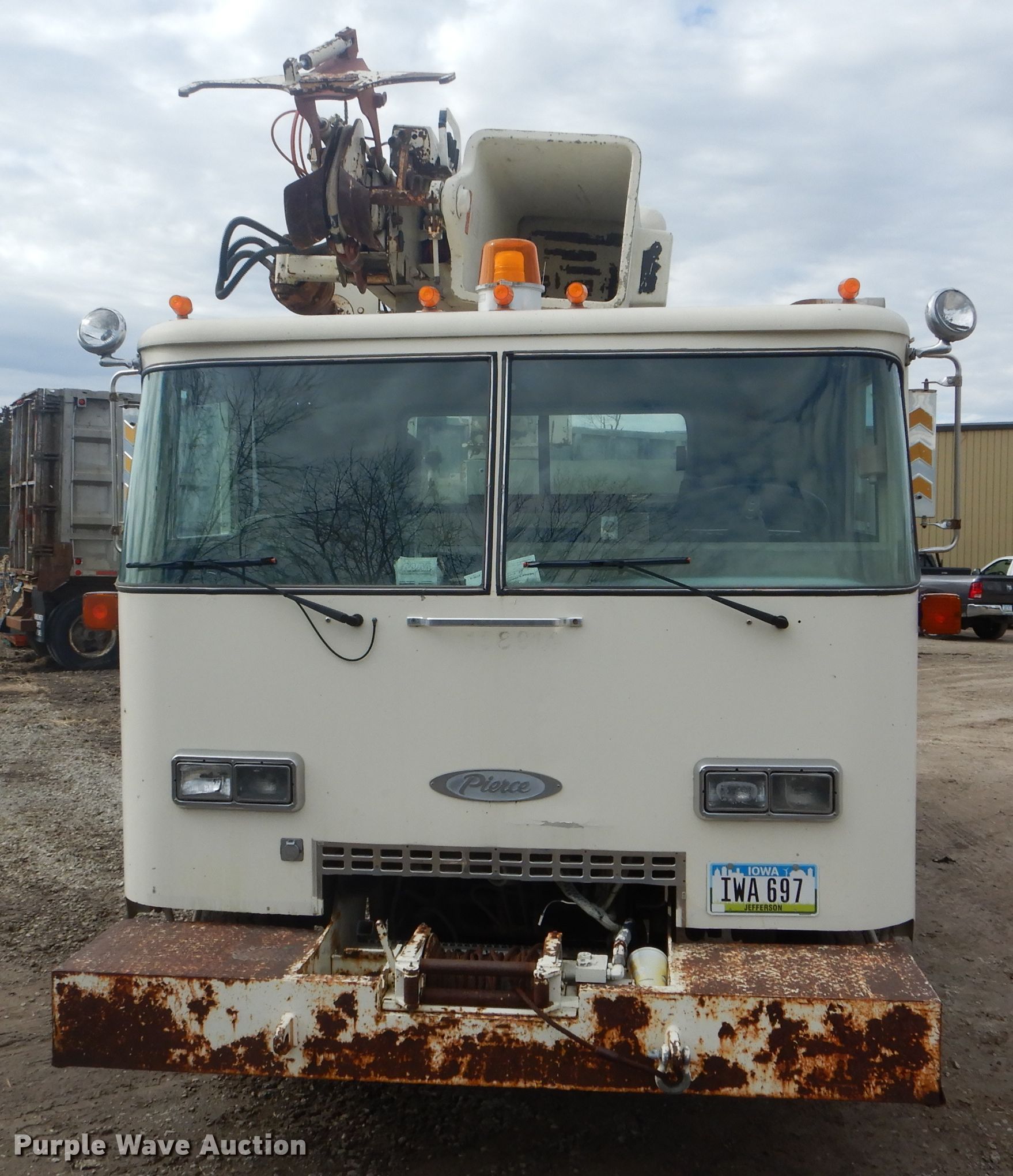 Purple Wave is selling a used Digger Derrick Truck in Iowa. This item is a 1988 Pierce digger derrick truck with the following: 75,480 miles on odometer, Caterpillar 3208 V8 diesel engine, Automatic transmission, Single axle, Four wheel drive, Heat, PTO, 11'L utility bed, Telect Commander 4500 telescopic boom, 14,350 lbs maximum lift capacity, 45' maximum lift height, Man basket, Platform and ground controls, Material handler, Pole guide, 20" diameter auger, 163" wheelbase, Spring suspension, Air brakes, 315/80R22.5 front tires, 12R22.5 rear tires, GVWR 36,400 lbs, Outrigger leak