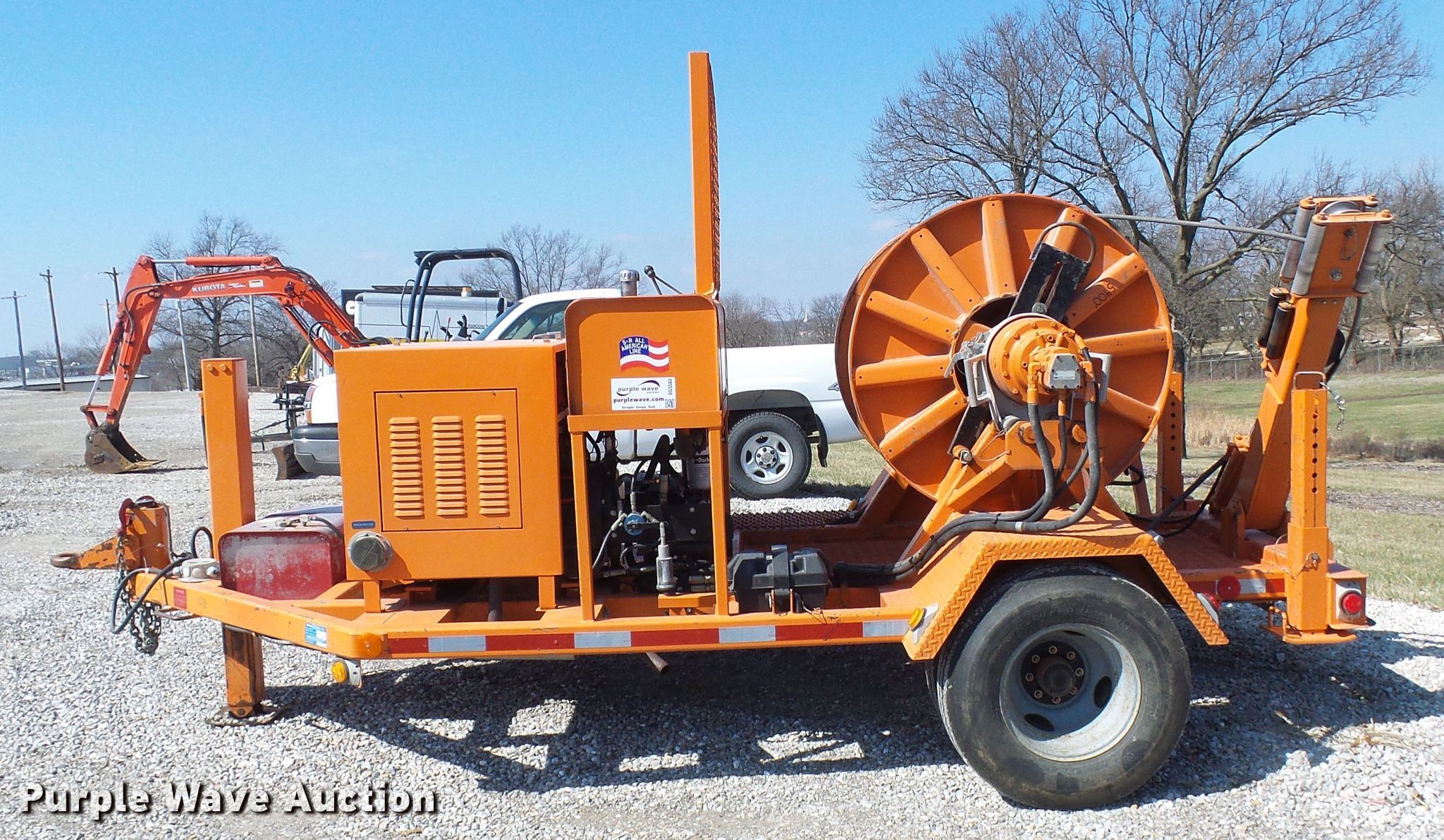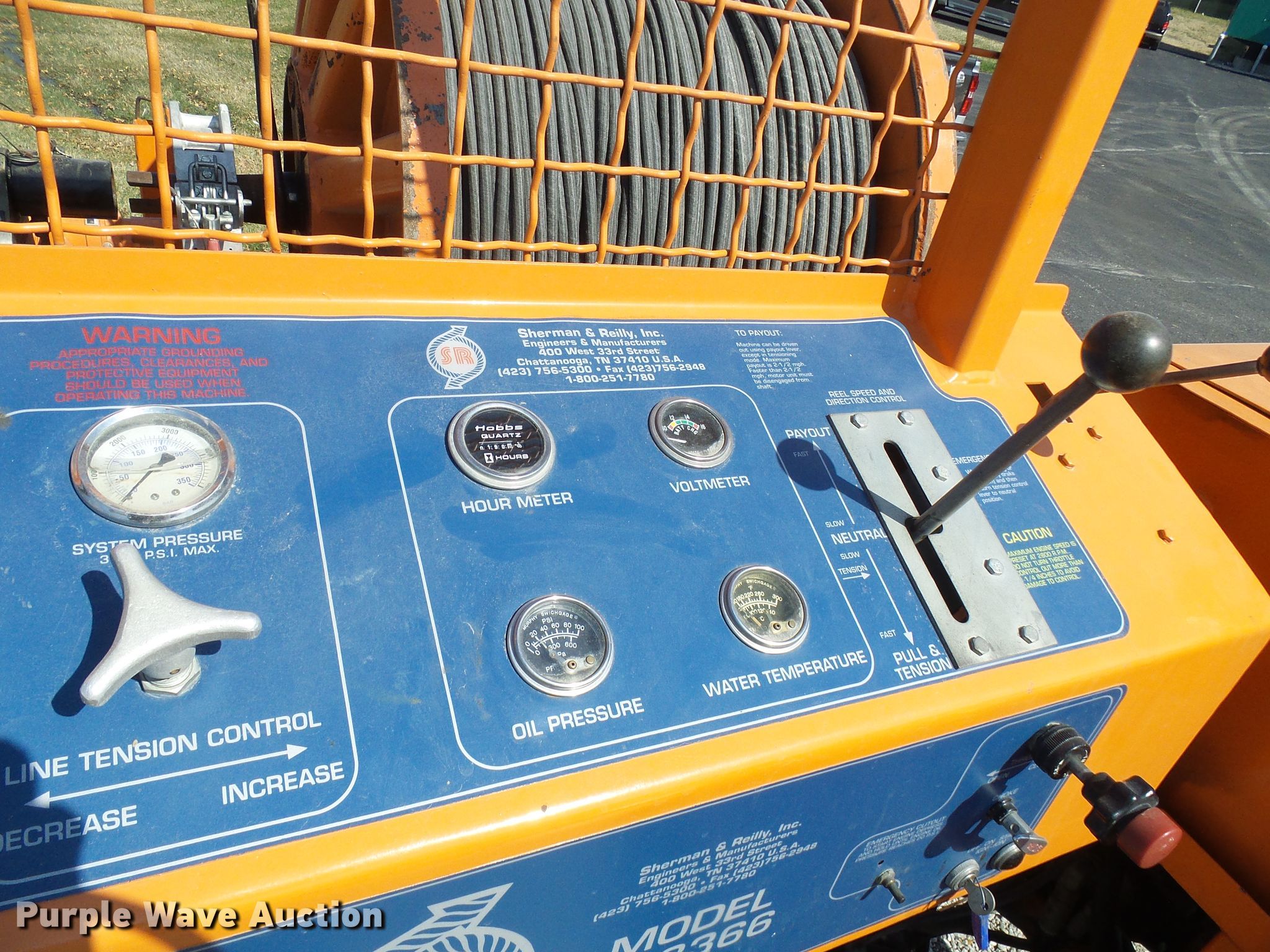 Purple Wave is selling a used Reel Trailer in Missouri. This item is a Sherman & Reilly PT-3366 cable tensioner trailer with the following: 1,900 hours on meter, Ford three cylinder gas engine, Hydrostatic drive, Hydraulic fairlead, Variable tension controller, Integrated fuel tank, Single axle, 7.50-16LT tires