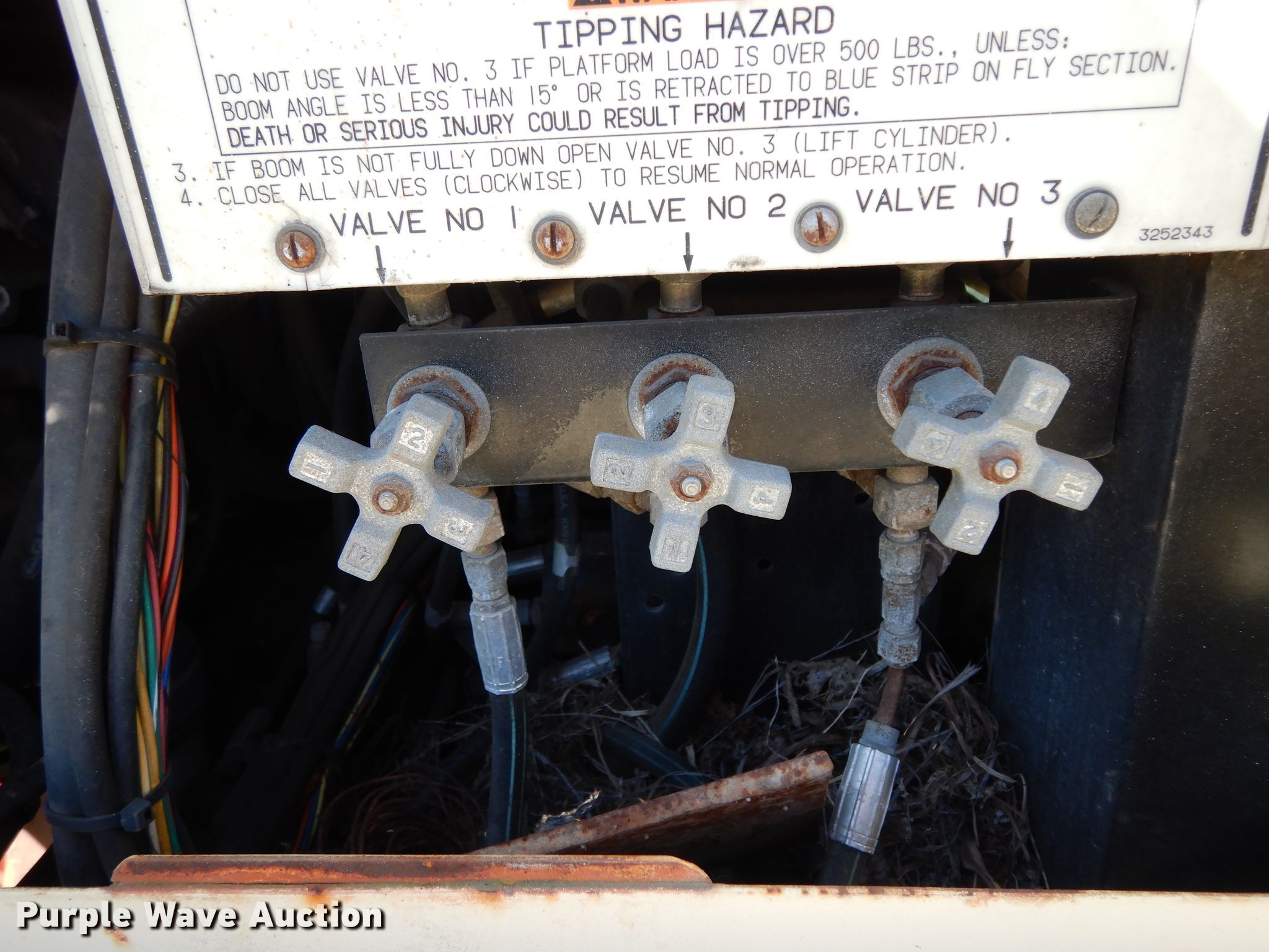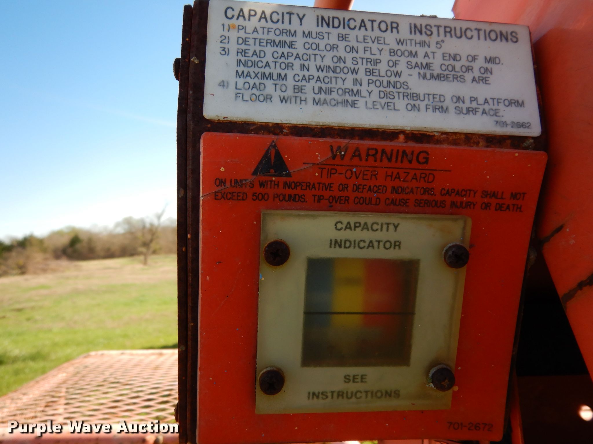 JLG 40H boom lift. 1,248 hours on meter, Duetz four cylinder diesel engine, 40' maximum lift height, 5'L x 11'W platform Platform and ground controls, Hydraulic platform rotation, 12.5L-15SL tires, Lift cylinder leak, Pin stuck, Non-operational unit. Ellis-McGinnis Construction Company. 2895 Eddy Gatesville Parkway. Eddy, TX 76524