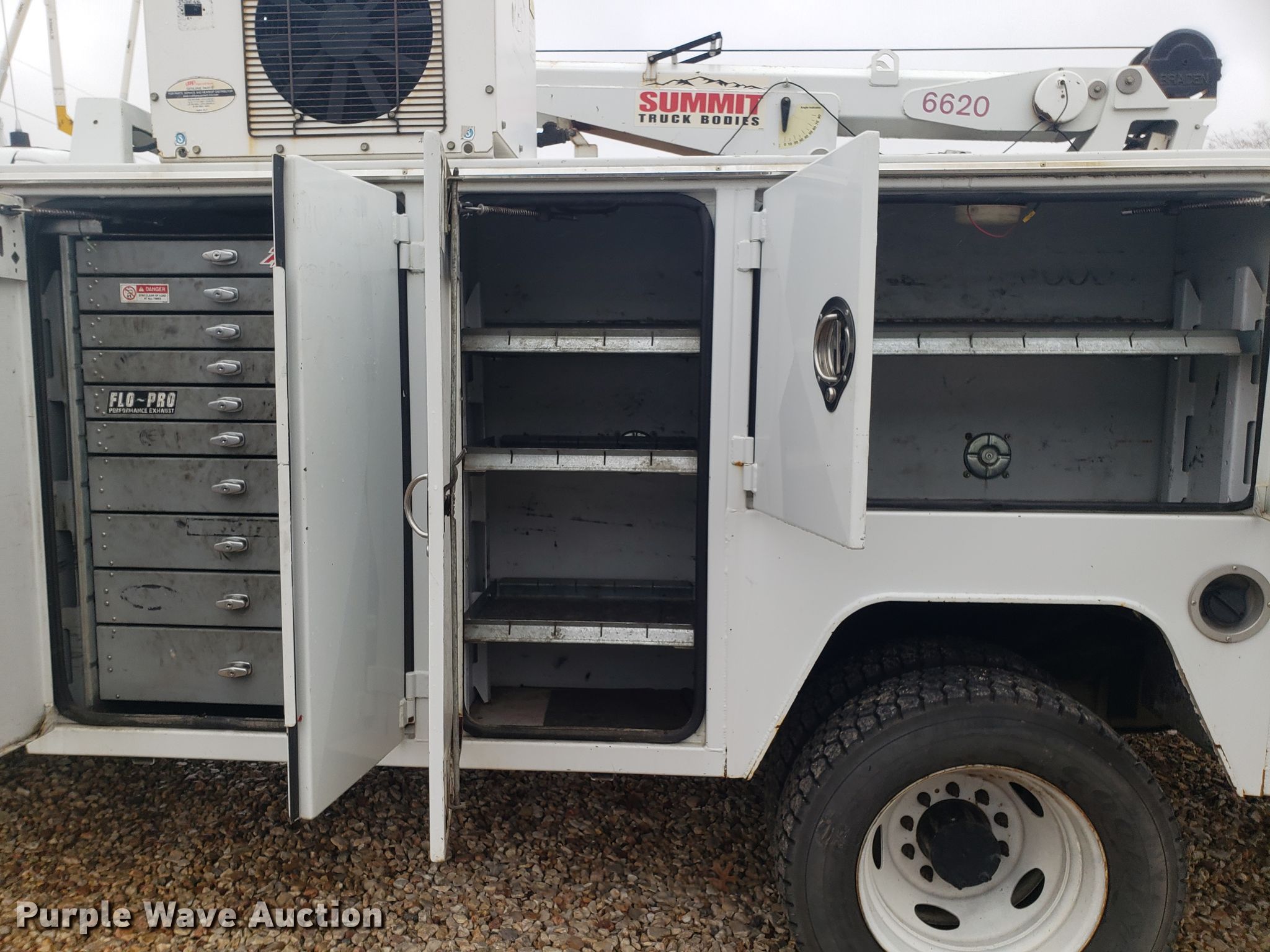 Purple Wave is selling a used Service Truck in Missouri. This item is a 2007 Ford F550 Super Duty service truck with the following: 243,697 miles on odometer, 6.0L V8 OHV 32V diesel engine, Automatic transmission, Single axle, AC and heat, PTO, 11'L utility bed, Ingersoll Rand VHP40RMH air compressor, Summit 6630 crane, 6,000 lbs max lift capacity, Wireless remote, Spring suspension, Hydraulic brakes, 245/70R19.5 tires