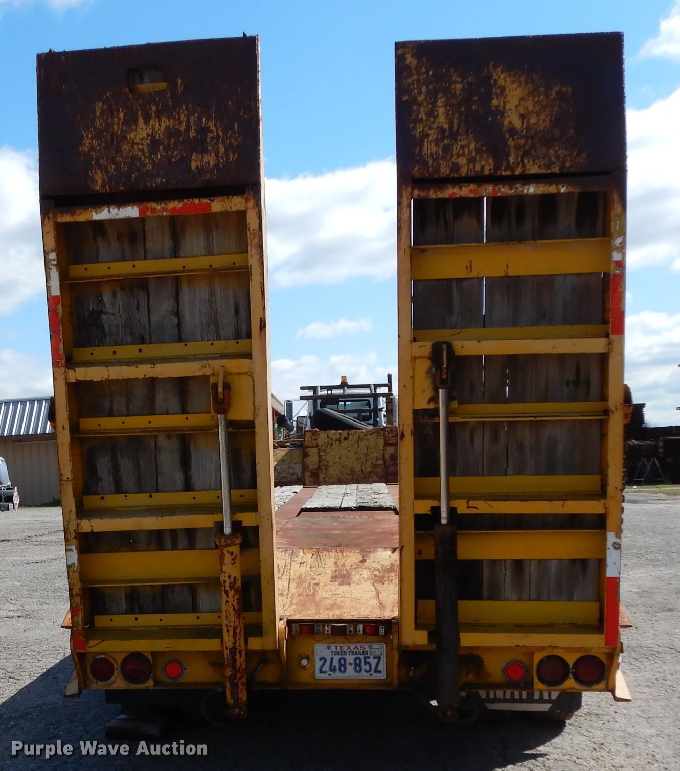 Purple Wave is selling a used Equip. Trailer in Texas. This item is a 1980 Hercules equipment trailer with the following: 38'L x 8'W overall, 25'L wood main deck, 8' 2.5"L top teck, 36" tail length, 8'L hydraulic ramps, Self-contained hydraulics, 11" swing-out outriggers, Dual leg landing gear, Spring suspension, Air brakes, Tandem axle, Steel wheels, 10.00R15 tires
