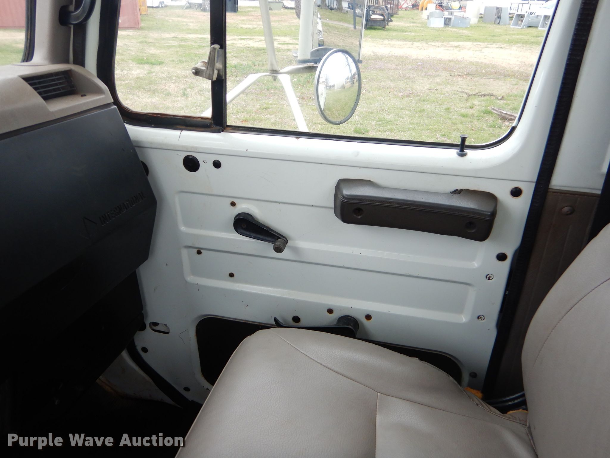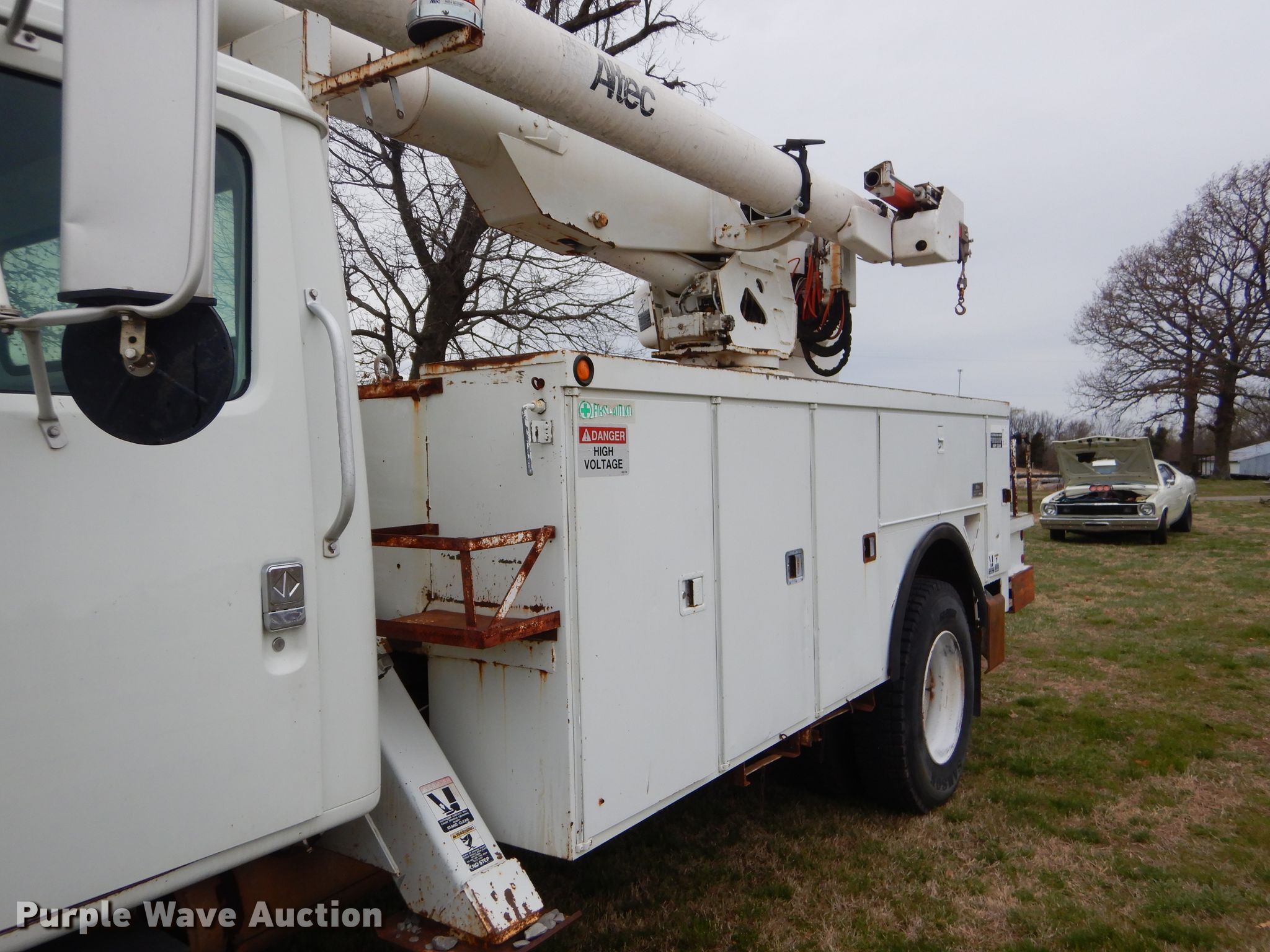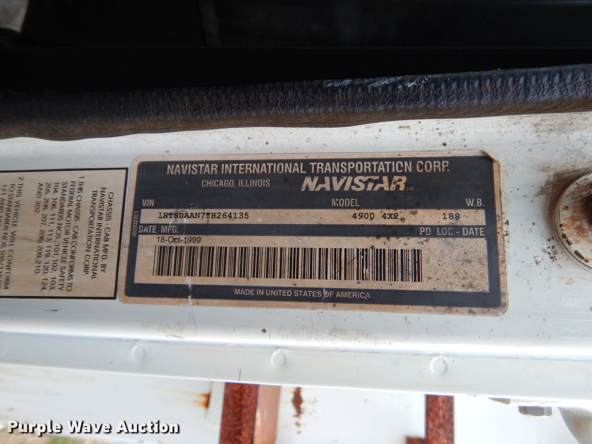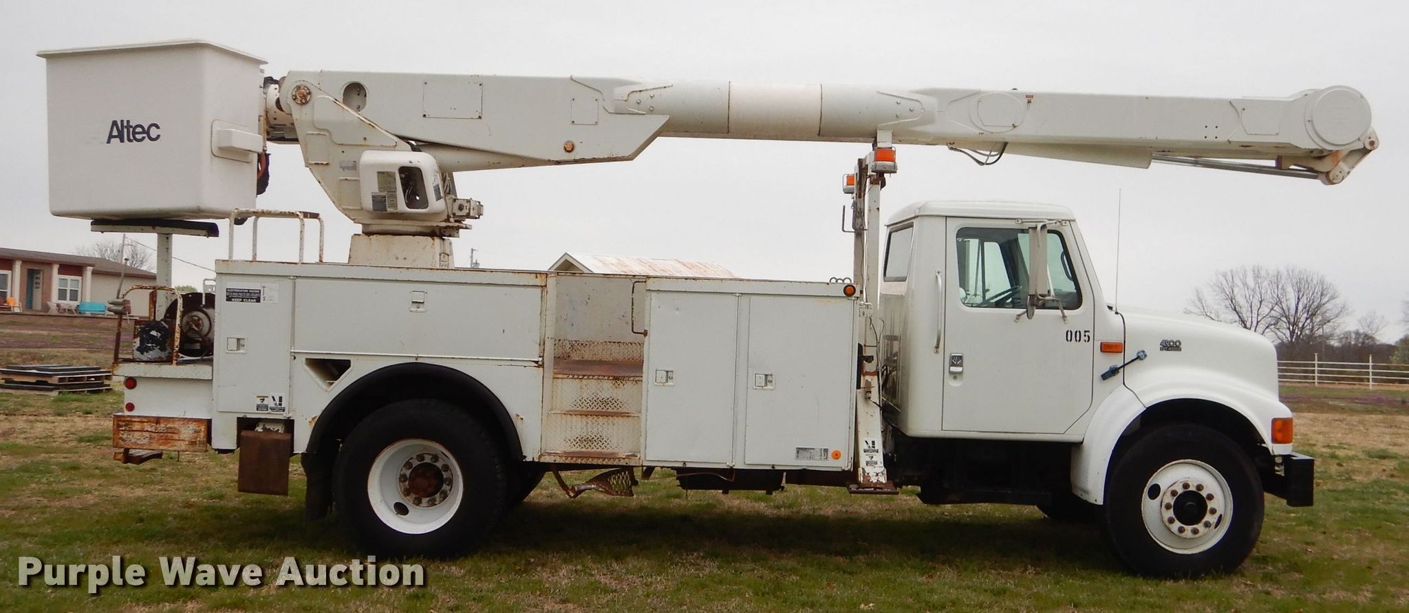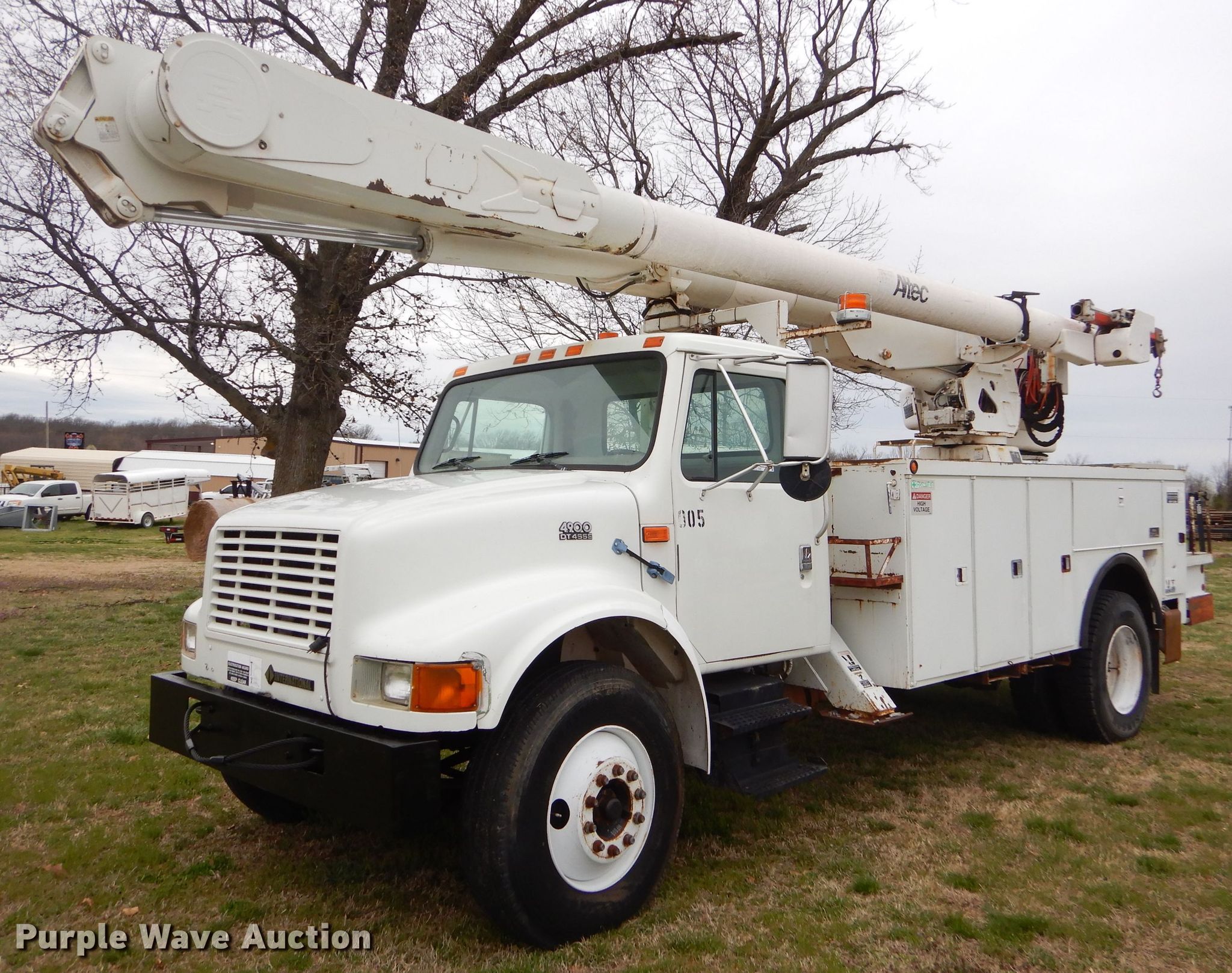 Purple Wave is selling a used Bucket Truck in Oklahoma. This item is a 2000 International 4900 bucket truck with the following: 101,054 miles on odometer, 7,108 hours on meter, International DT466E 7.6L L6 diesel engine, Allison automatic transmission, Single axle, AC and heat, PTO, Altec utility bed, 2000 Altec AM4855 insulated, telescopic boom, 700 lbs maximum lift capacity, 55' maximum lift height, Man basket, Platform and ground controls, Serial 37-62043, 188" wheelbase, Spring suspension, Air brakes, 11R22.5 tires