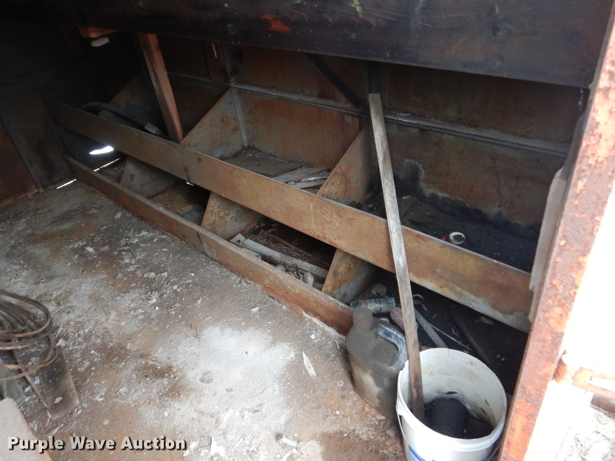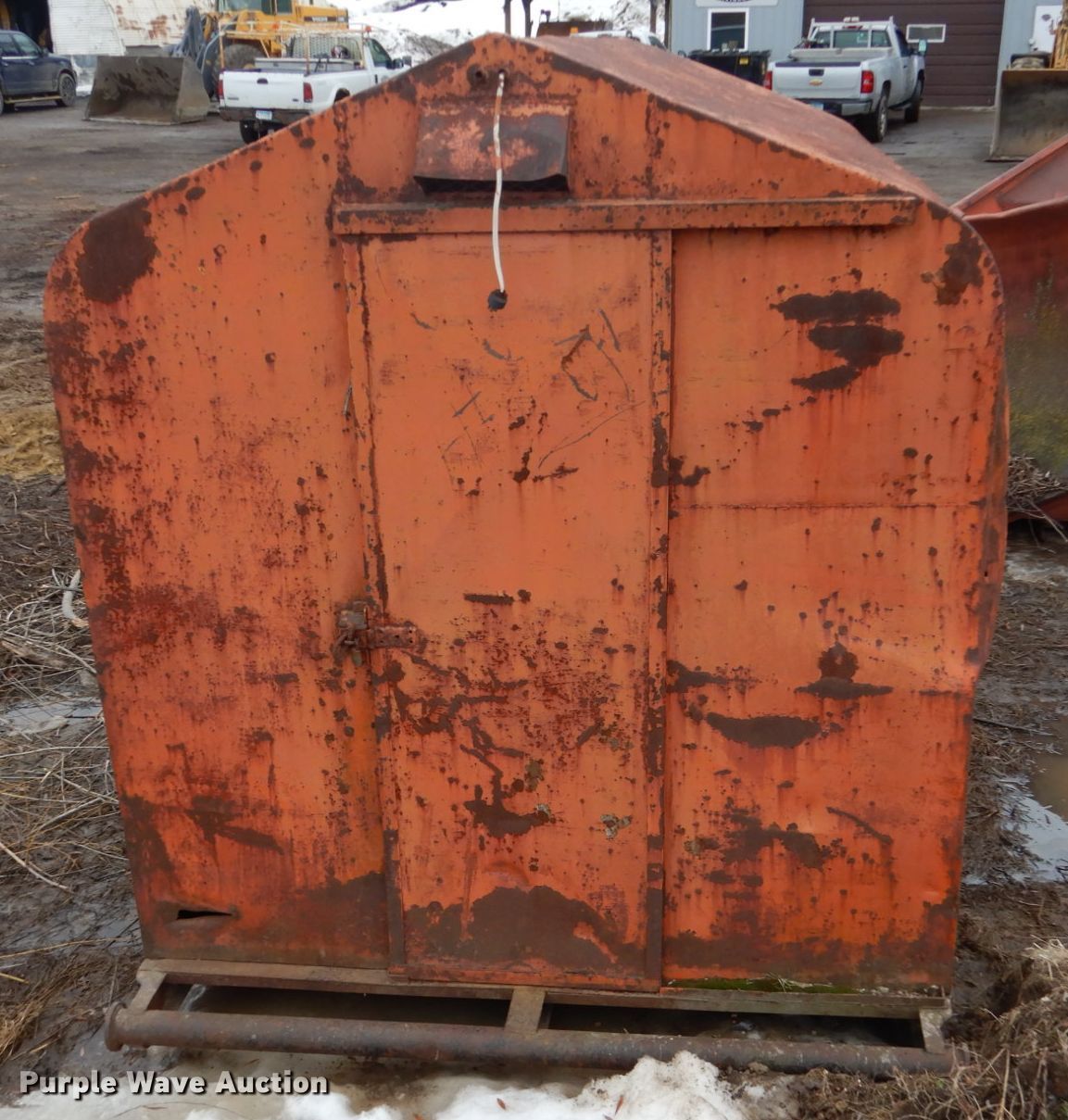 Steel shed. 12'L x 70"W x 90"H, Work station, Shelves, Front and rear sliding doors, Skid mounted. Aslaksons Services. 1555 Bench St. Red Wing, MN 55066