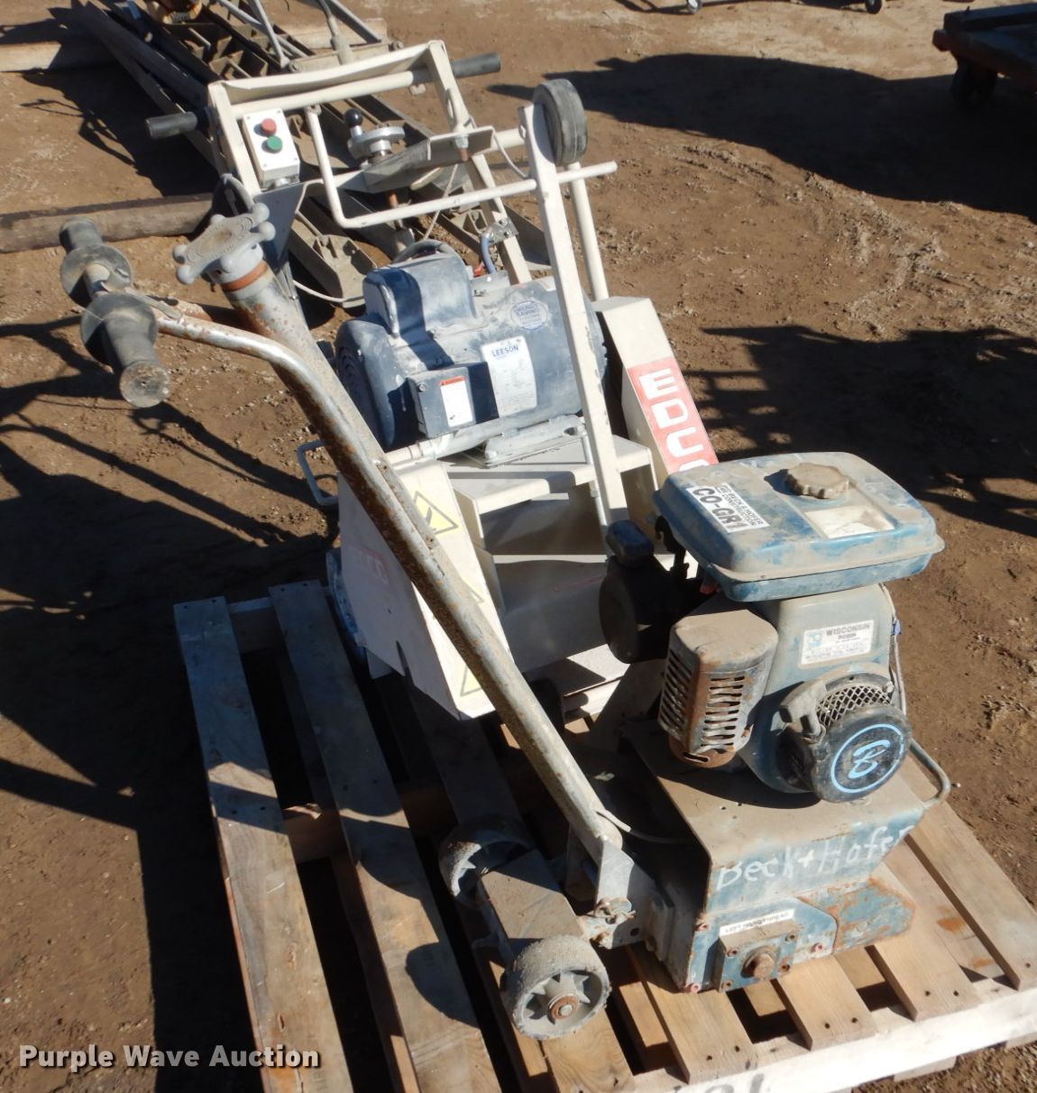 Concrete equipment. Edco DS18-13H concrete saw Electric motor 5 HP, Serial 100610004, Bartell bump grinder Wisconsin single cylinder gas engine, 10" cutting width. Beck & Hofer Construction. 618 E Maple St. Sioux Falls, SD 57104