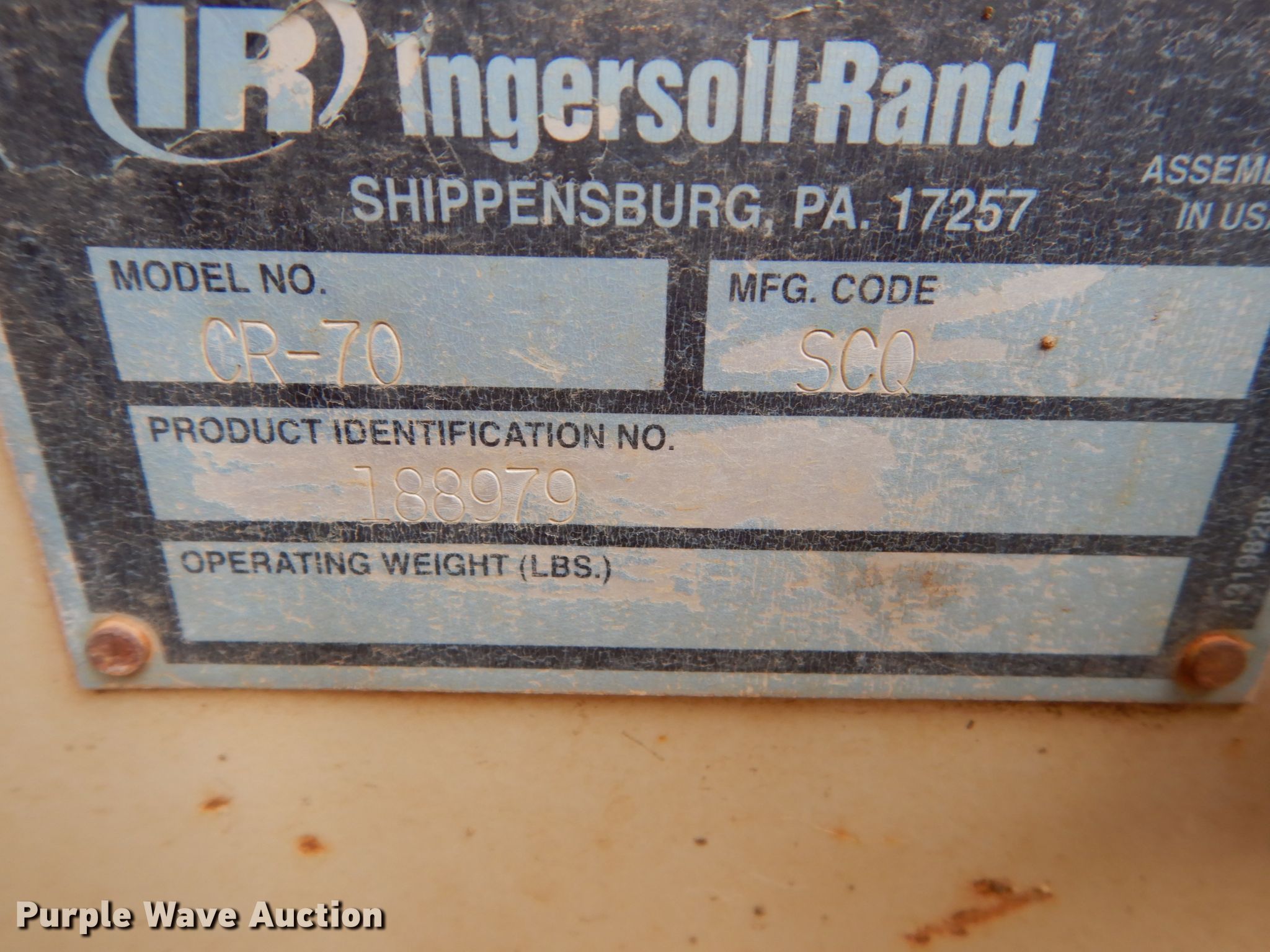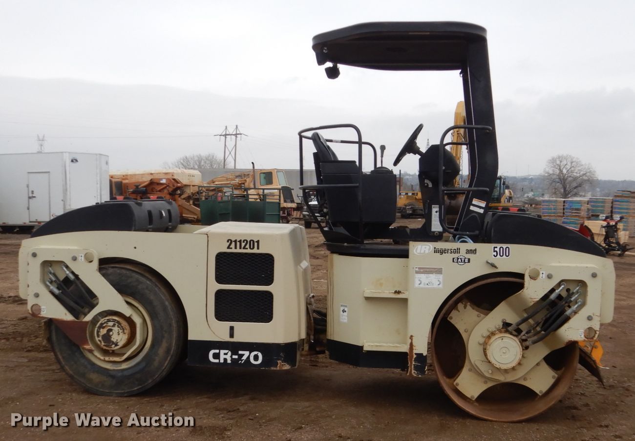 Purple Wave is selling a used Pneumatic Roller in South Dakota. This item is a Ingersoll Rand CR-70 vibratory combination roller with the following: 1,655 hours on meter, Four cylinder diesel engine, Hydrostatic transmission, OROPS, Vandal cover, 57"W x 39.5" diameter smooth drums, Single two speed vibratory system, Front and rear drum scrapers, Front water application, (4) 9.00-20 tires, Serial 188979