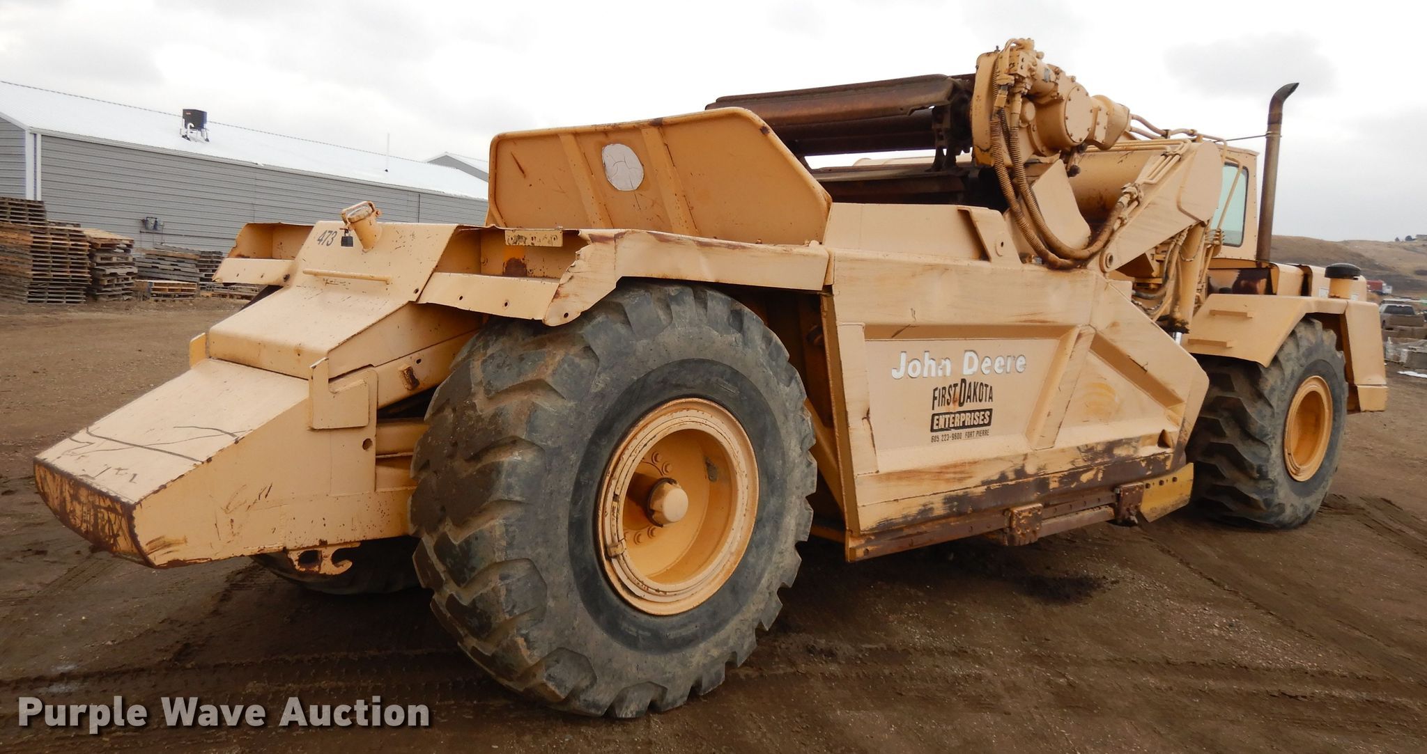 Purple Wave is selling a used Elevating Scraper in South Dakota. This item is a 1980 John Deere 762 elevating scraper with the following: 8,611 hours on meter, Six cylinder diesel engine, Powershift transmission, 5F-1R gears, Enclosed cab, Three lever scraper controls, 11 cu.yd. bowl capacity, Reversible cutting edge, Elevator revers, Hydraulic lift, Hydraulic brakes, 23.5-25 tires, Serial JD762003647T, Unit# 473