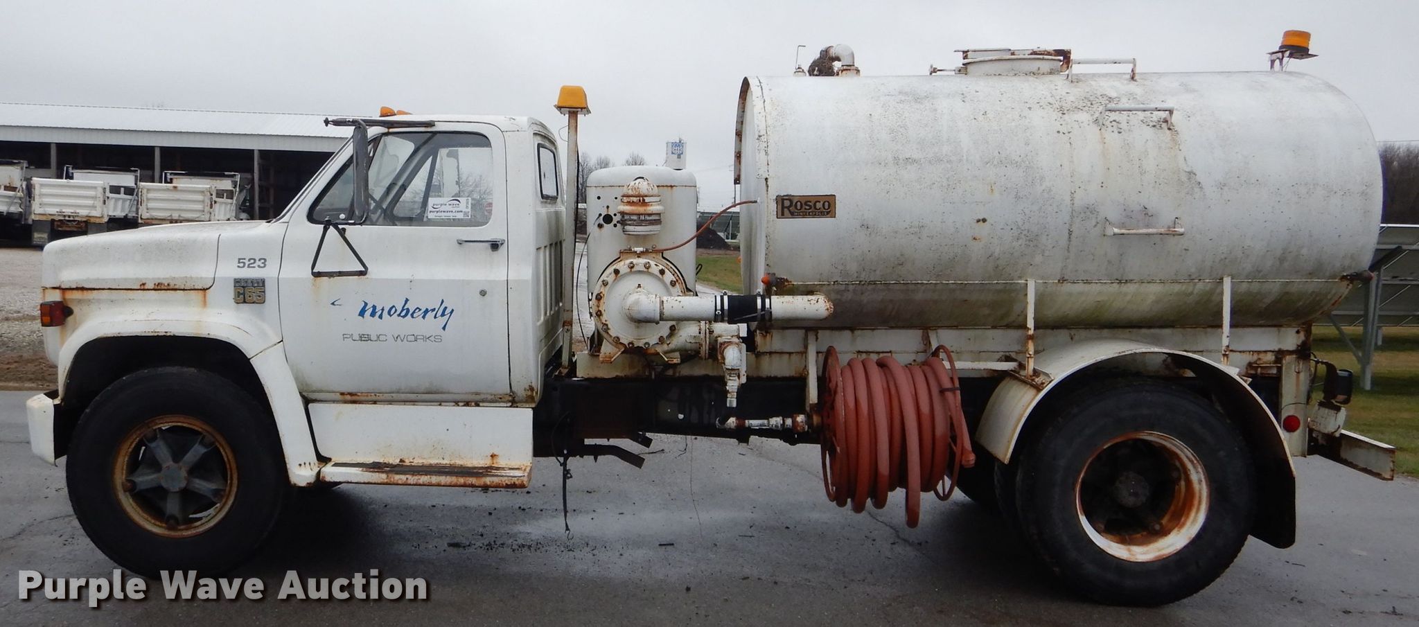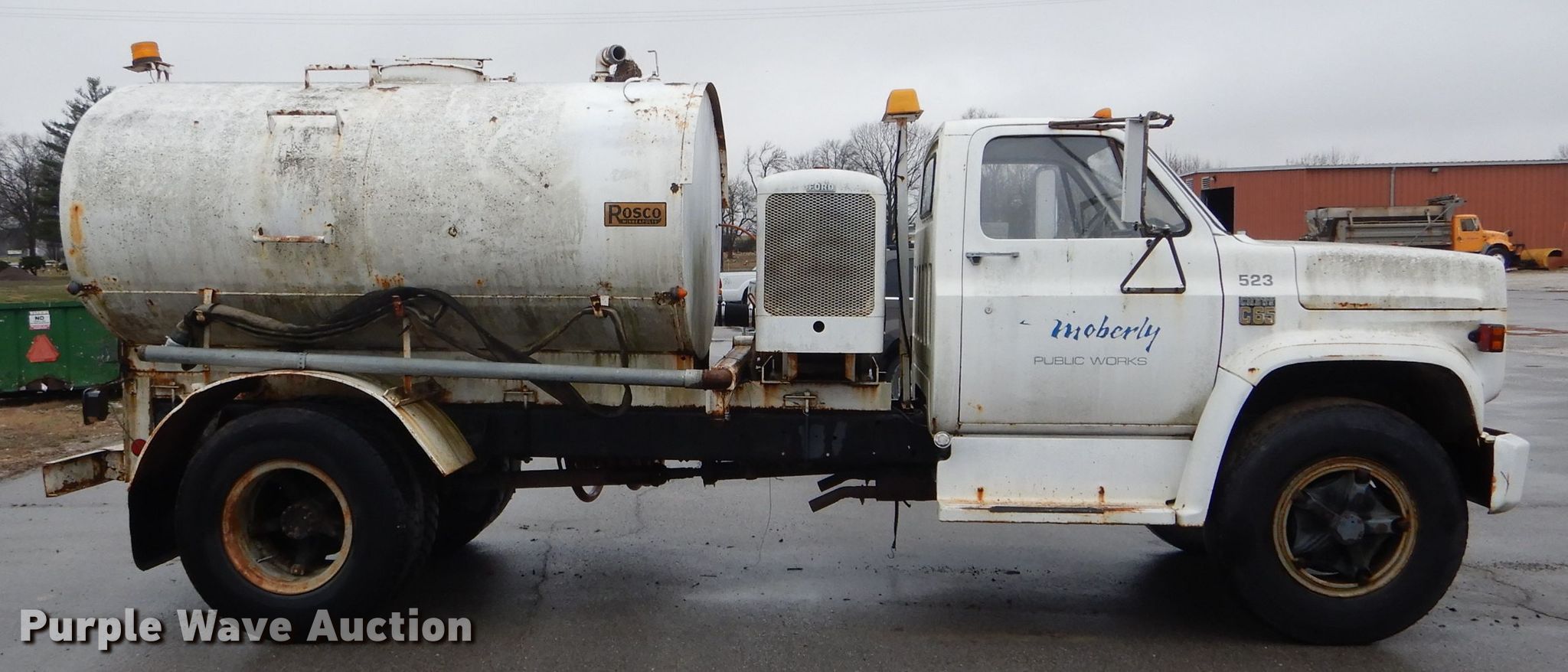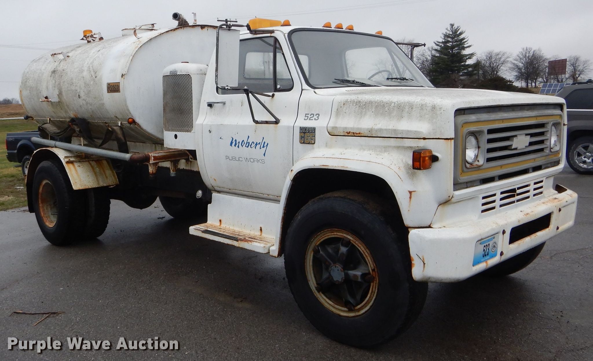 Purple Wave is selling a used Tank Truck or Water Truck in Missouri. This item is a 1975 Chevrolet C65 water truck with the following: 16,794 miles on odometer, Eight cylinder gas engine, Six speed manual transmission, Two speed rear end, Single axle, Heat, Rosco 9'L tank, Hose reel, Top fill, Six cylinder gas pump engine, 175" wheelbase, Spring suspension, Hydraulic brakes, 10.00R20 tires, GVWR 25,500 lbs, Unknown operating condition of pump engine, Non-operational brakes