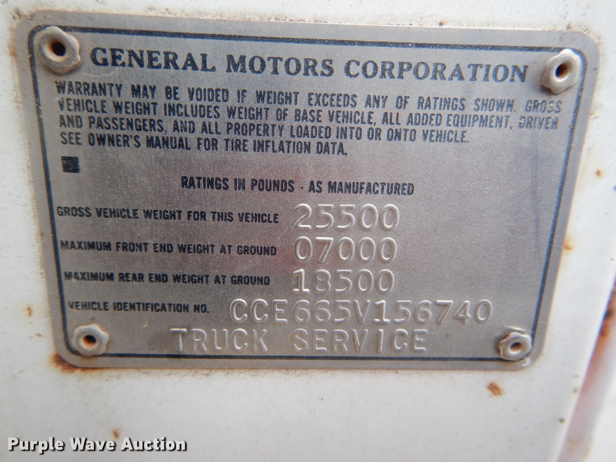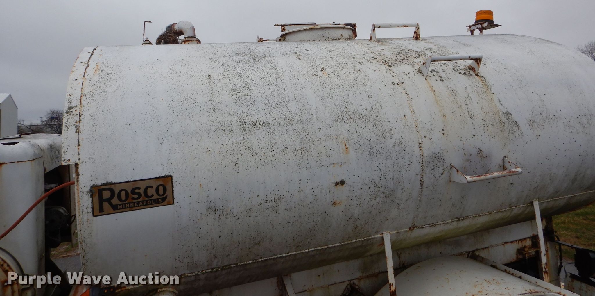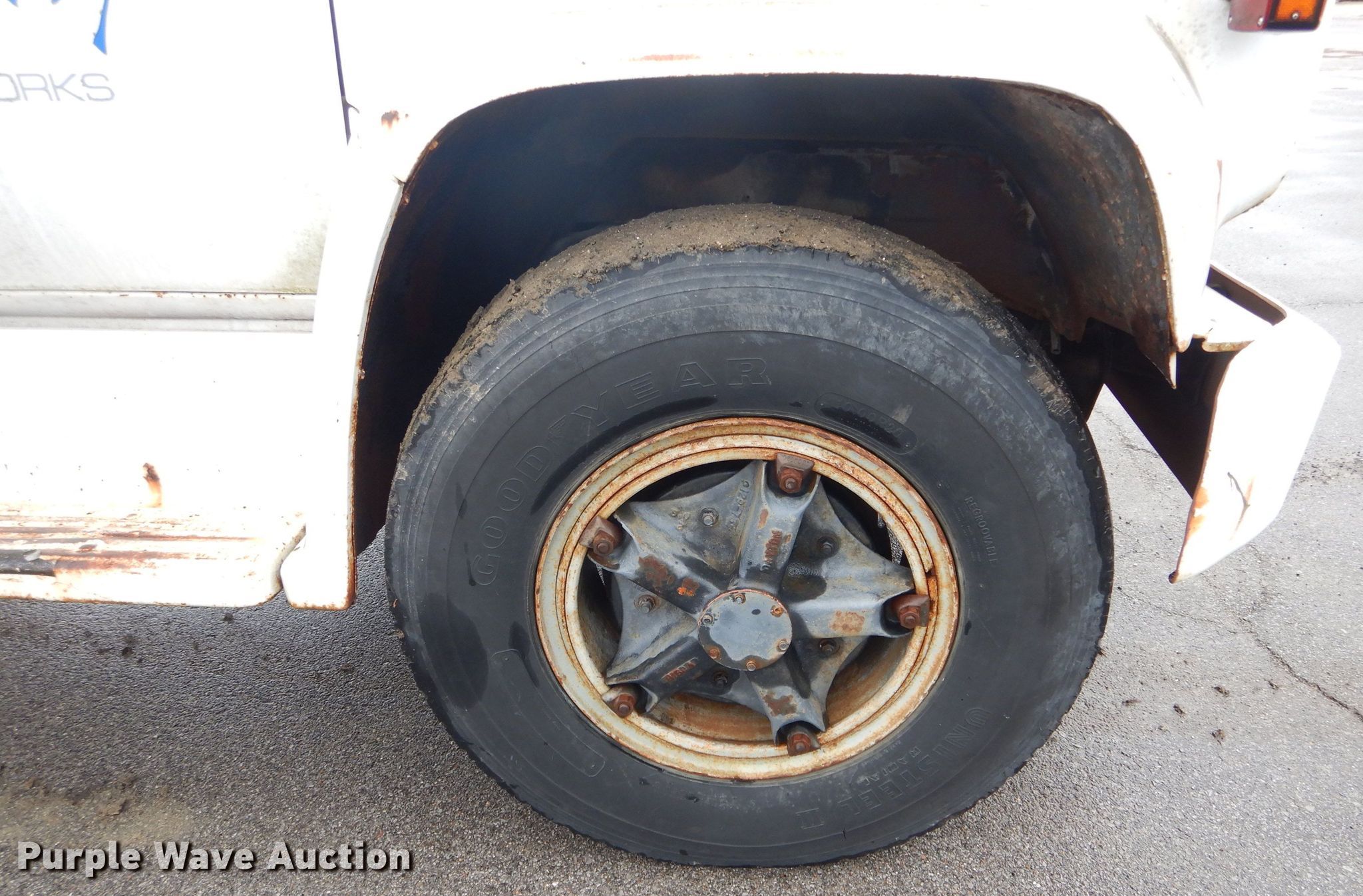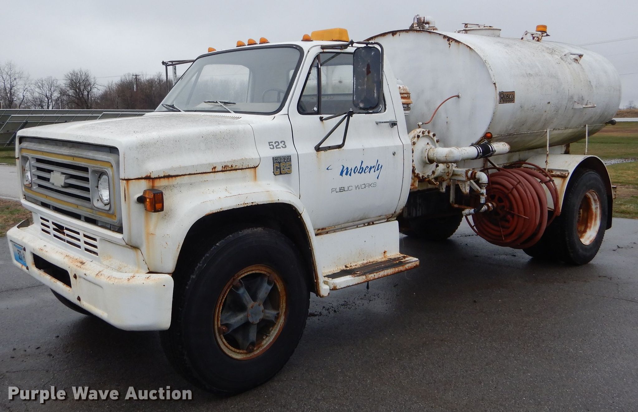 Purple Wave is selling a used Tank Truck or Water Truck in Missouri. This item is a 1975 Chevrolet C65 water truck with the following: 16,794 miles on odometer, Eight cylinder gas engine, Six speed manual transmission, Two speed rear end, Single axle, Heat, Rosco 9'L tank, Hose reel, Top fill, Six cylinder gas pump engine, 175" wheelbase, Spring suspension, Hydraulic brakes, 10.00R20 tires, GVWR 25,500 lbs, Unknown operating condition of pump engine, Non-operational brakes