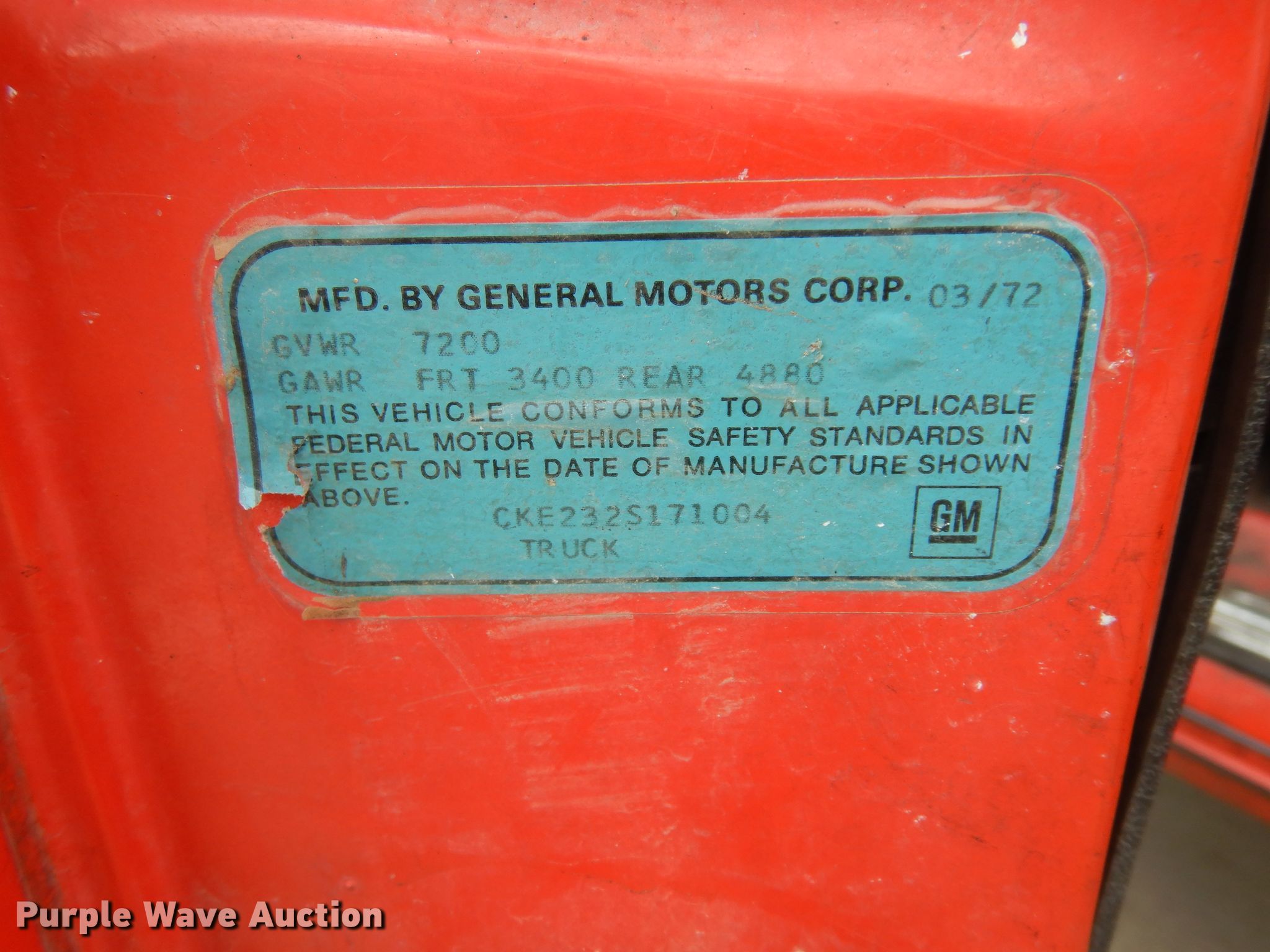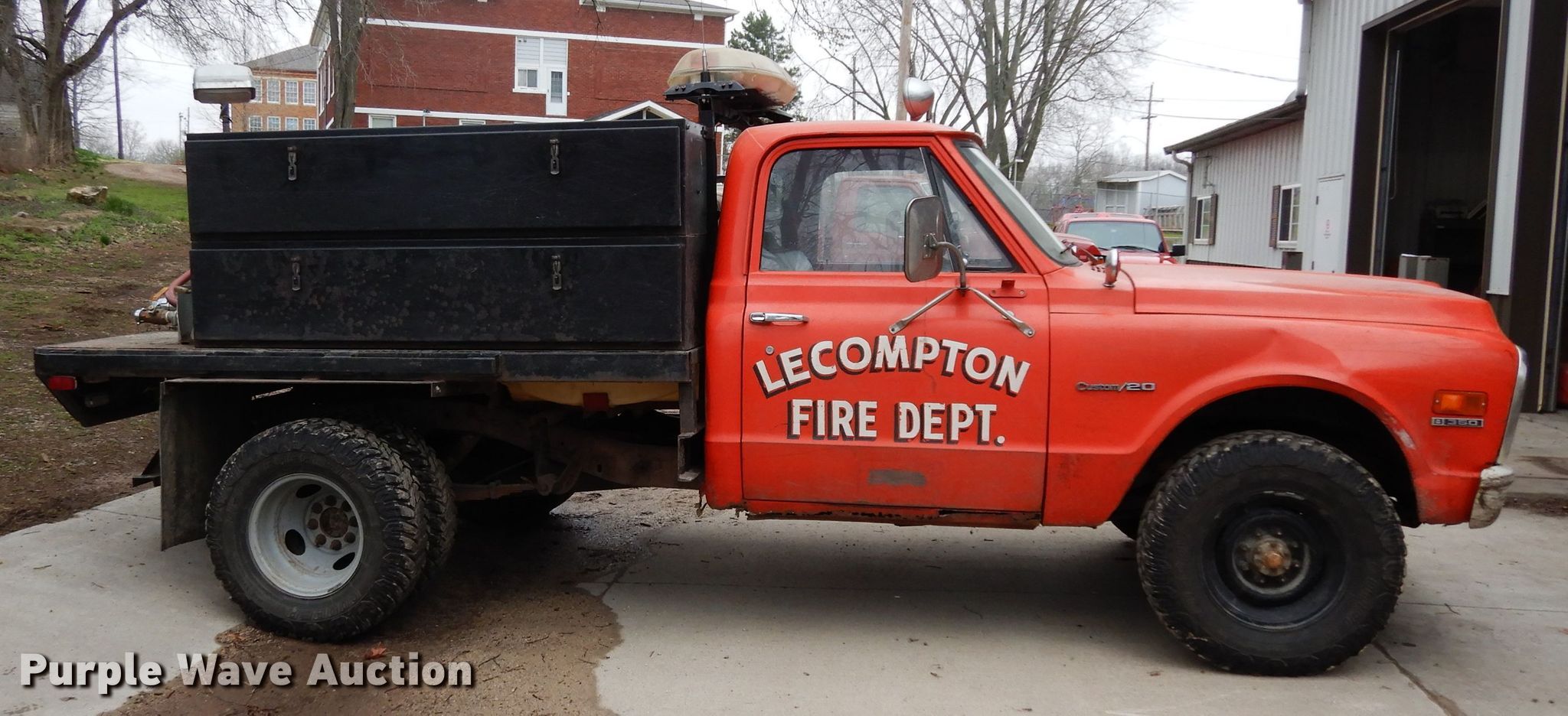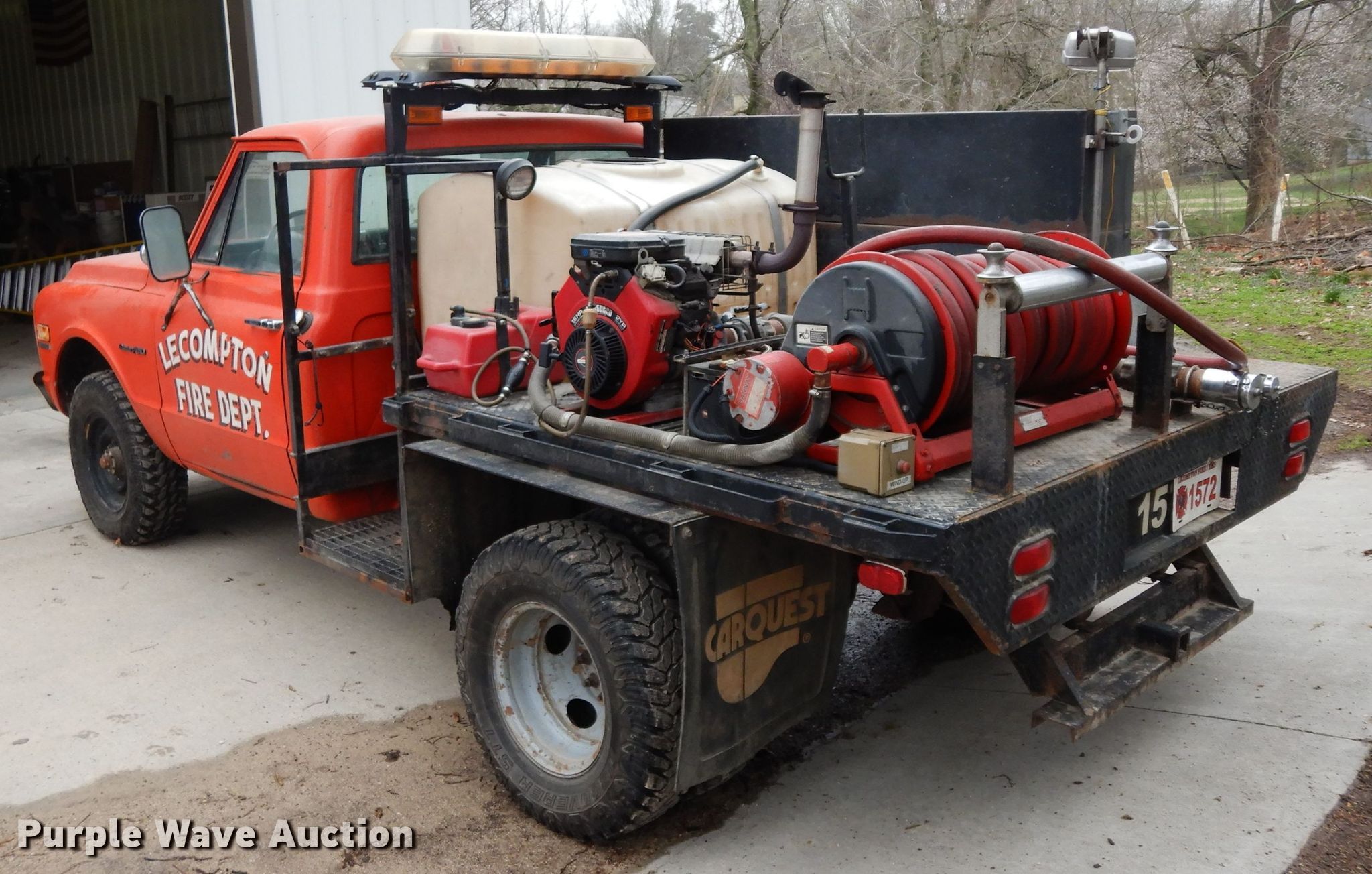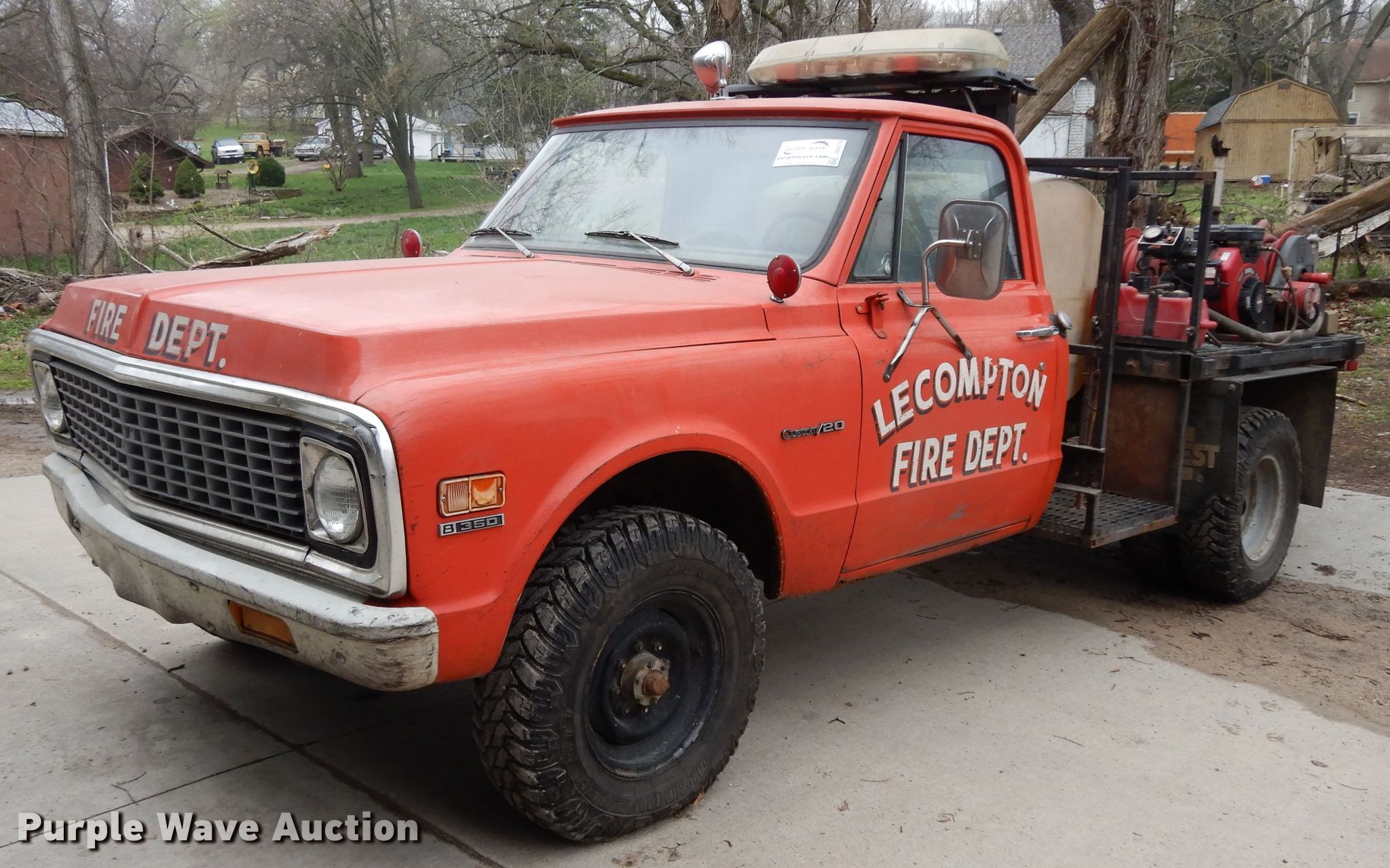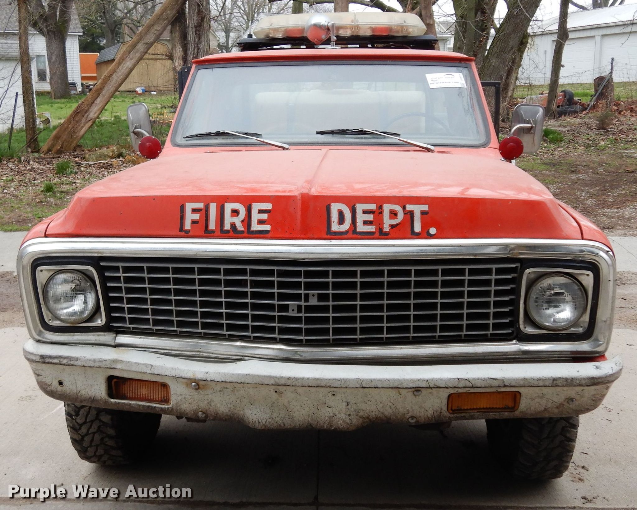 Purple Wave is selling a used Fire Truck or Emergency Vehicle in Kansas. This item is a 1972 Chevrolet Custom 20 brush fire truck with the following: 29,728 miles on odometer, Gas engine, Four speed manual transmission, Four wheel drive, Heat, 8'L x 7'W flatbed, 200 gallon water tank, Hannay hose reel, 100'L hose, Waterous pump, Briggs & Stratton 18 HP gas engine,, 235/85R16 tires
