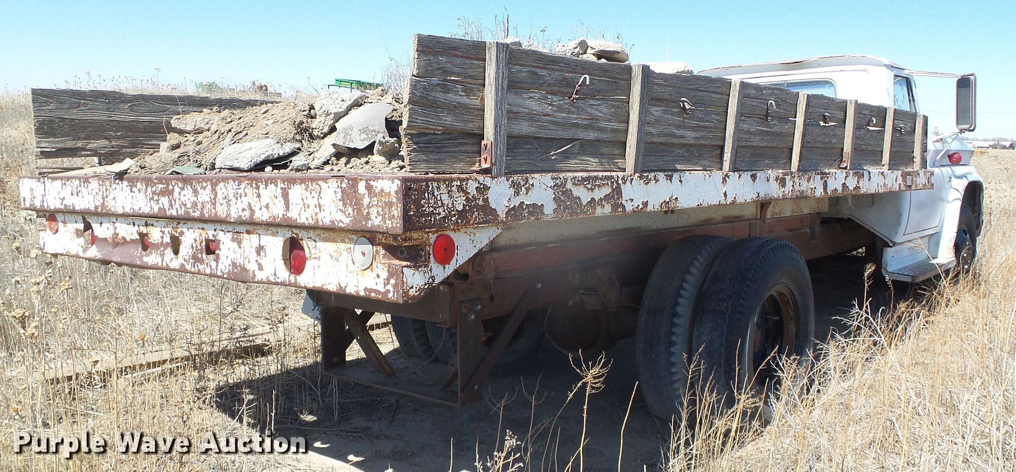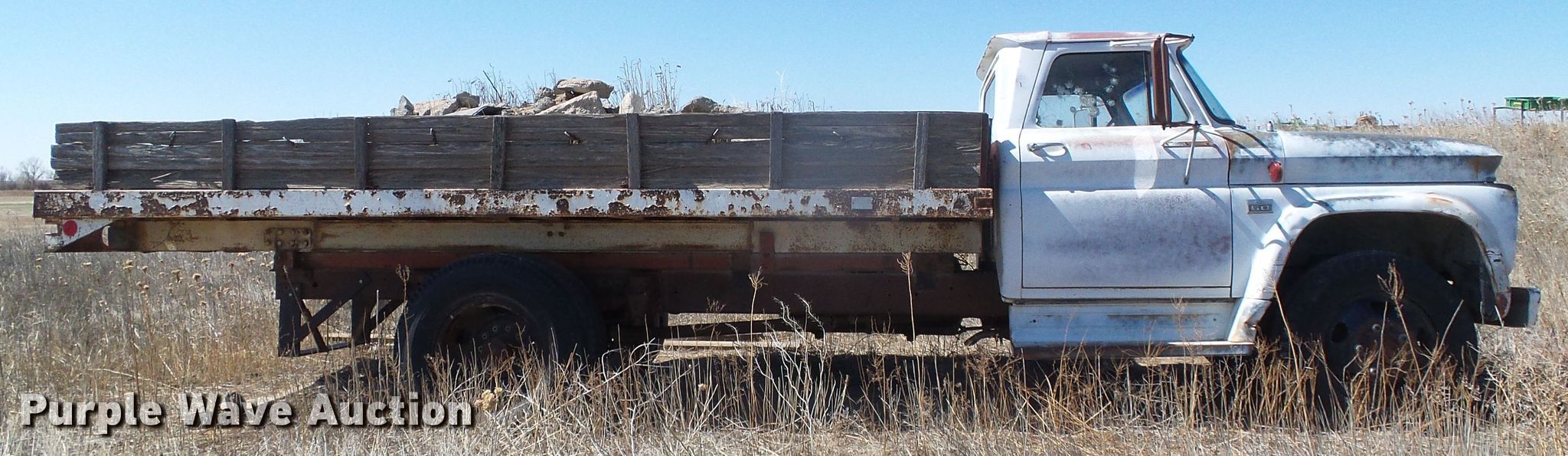 Purple Wave is selling a used Grain Truck in Kansas. This item is a 1960 Chevrolet C60 flat dump bed truck with the following: 91,022 miles on odometer, Six cylinder gas engine, Four speed manual transmission, Single axle, PTO, 16'L x 94"W flat dump bed, Single ram hoist, Spring suspension, Hydraulic brakes, 8.25-20 front tires, 9.00-20 rear tires, GVWR 19,500 lbs, Cracked windshield, Non-operational unit