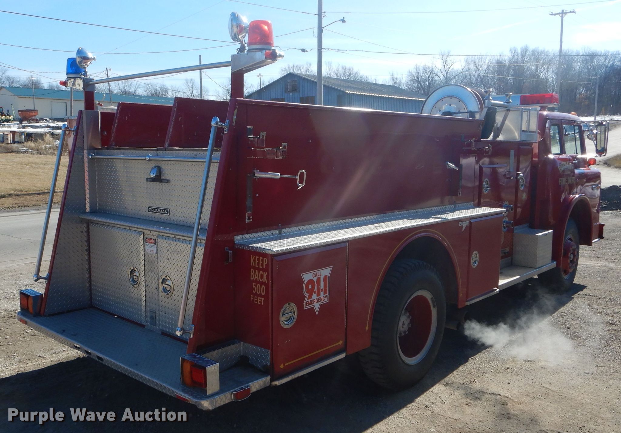 Purple Wave is selling a used Fire Truck or Emergency Vehicle in Missouri. This item is a 1981 Grumman Tiger Cat pumper fire truck with the following: 32,582 miles on odometer, 7.0L V8 OHV 16V gas engine, Five speed manual transmission, Single axle, Heat, 750 gallon per minute pump, Hose, 750 gallon tank capacity, 152" wheelbase, Spring suspension, Hydraulic brakes, 10.00-20 tires