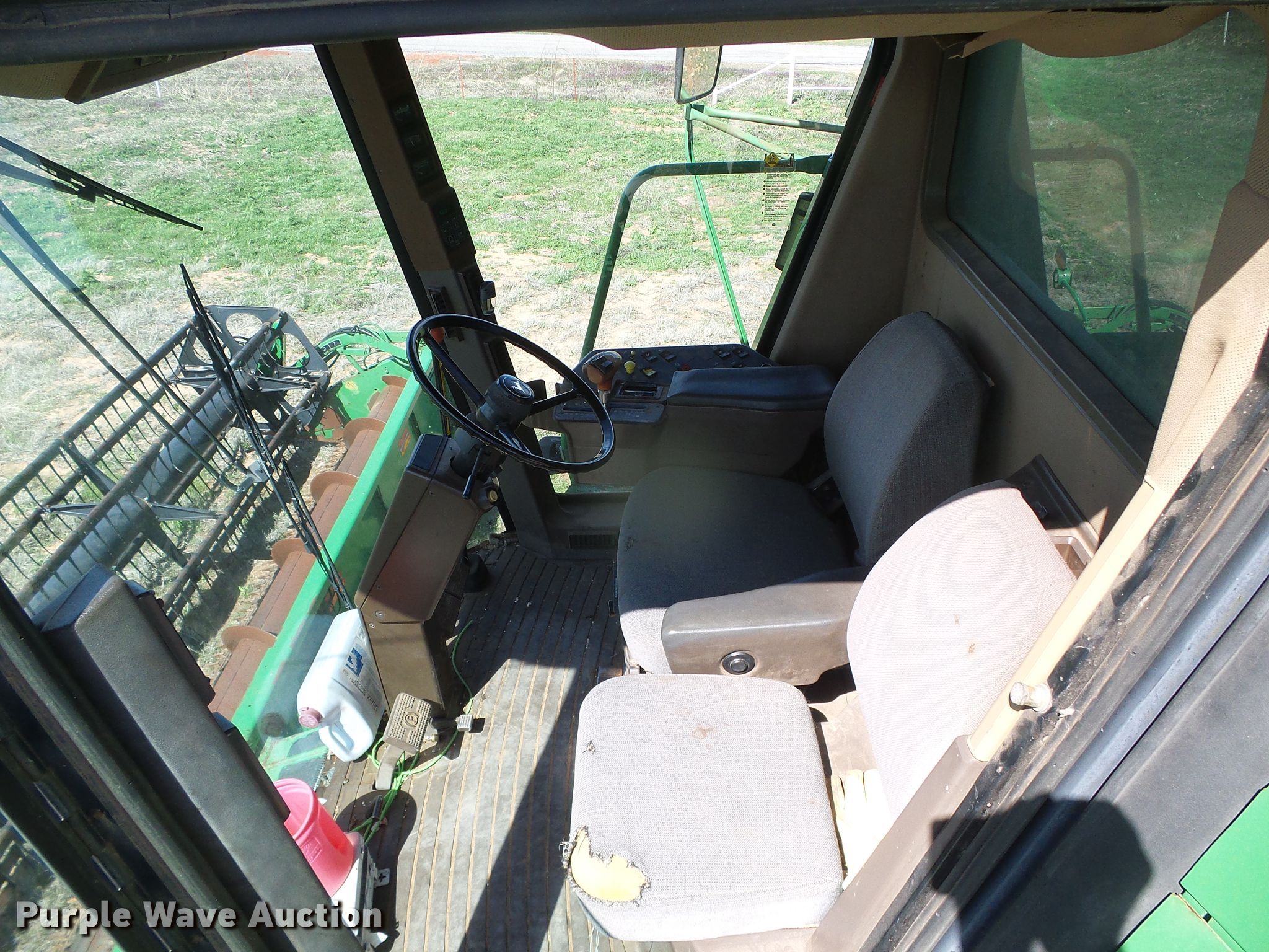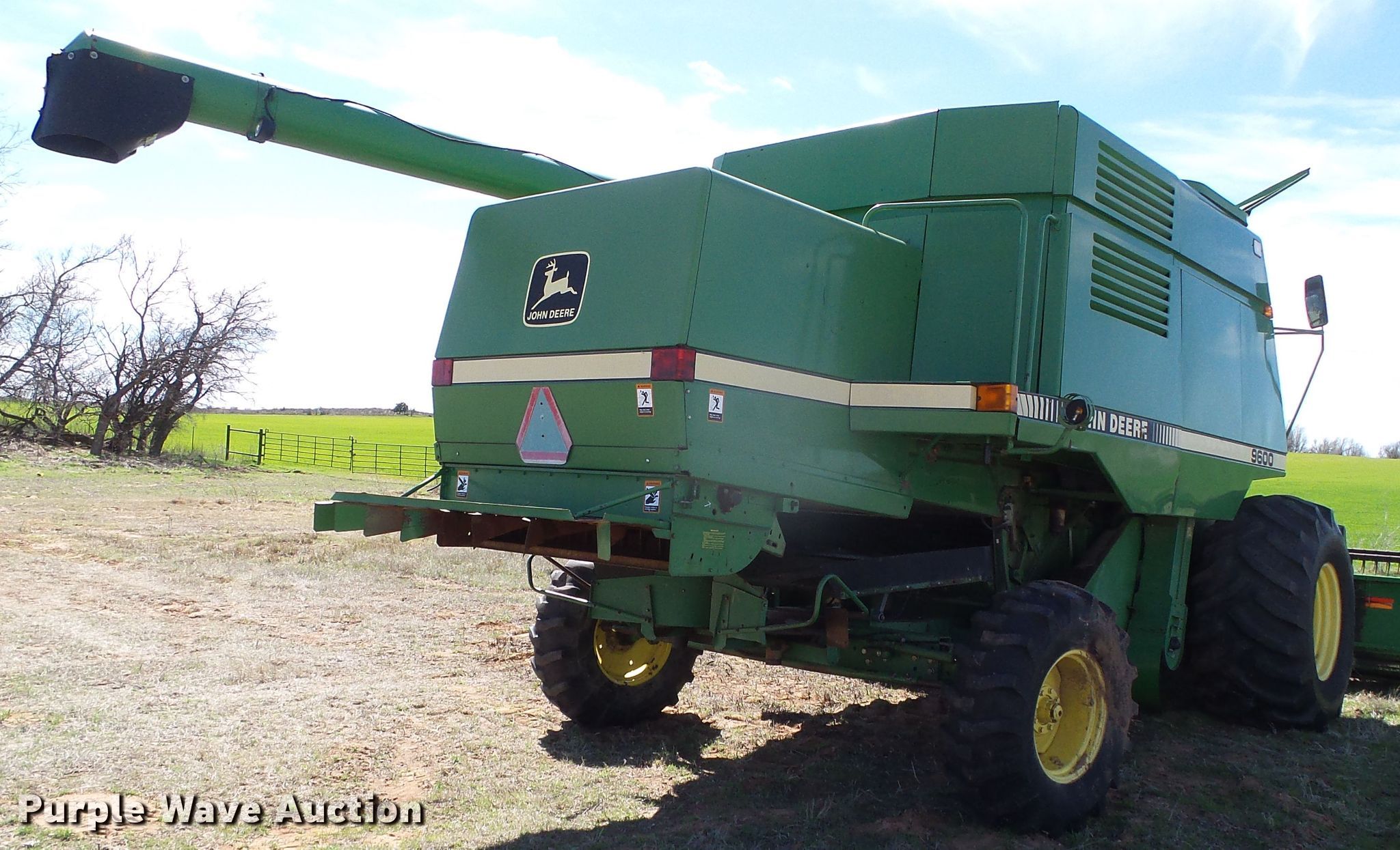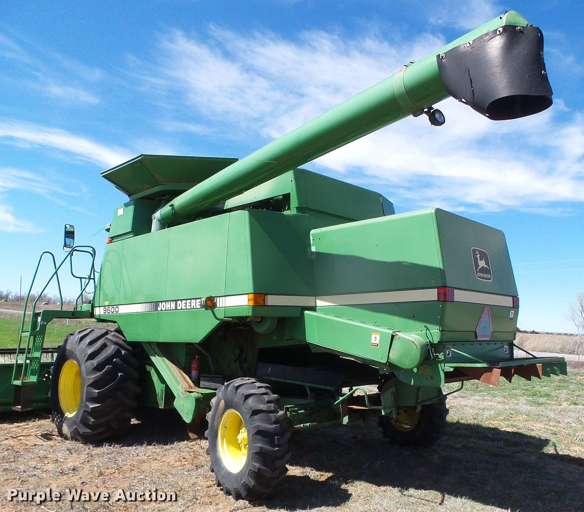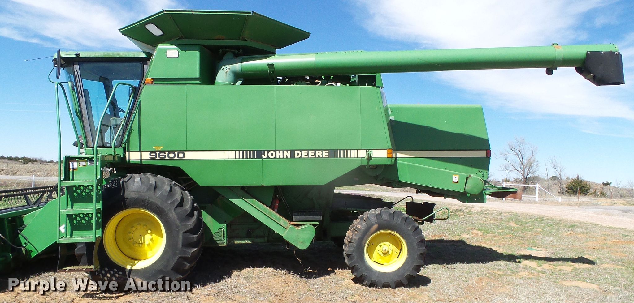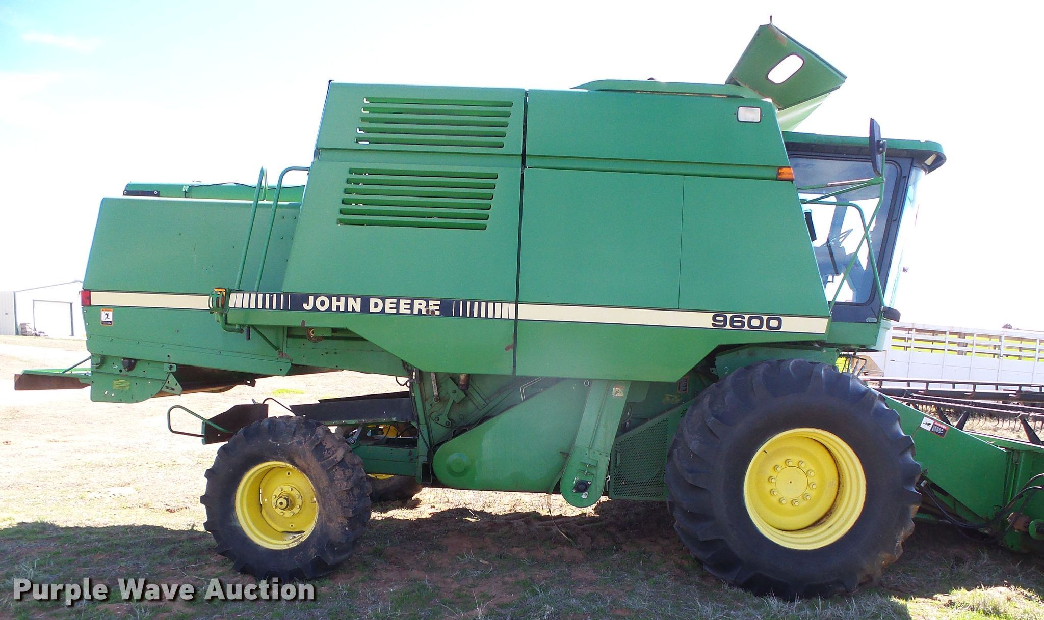Purple Wave is selling a used Combine in Oklahoma. This item is a 1995 John Deere 9600 combine with the following: 5,195 engine hours on meter, 3,642 separator hours on meter, John Deere 6076 six cylinder diesel engine, Serial RG6076H549611, Hydrostatic transmission, 3F-3R gears, Feederhouse, Variable speed, Reverser, AC and heat, Straw chopper, Bin extensions, 30.5L-32 front tires, 16.9-24 rear tires, Operator manual, Serial H09600X661881