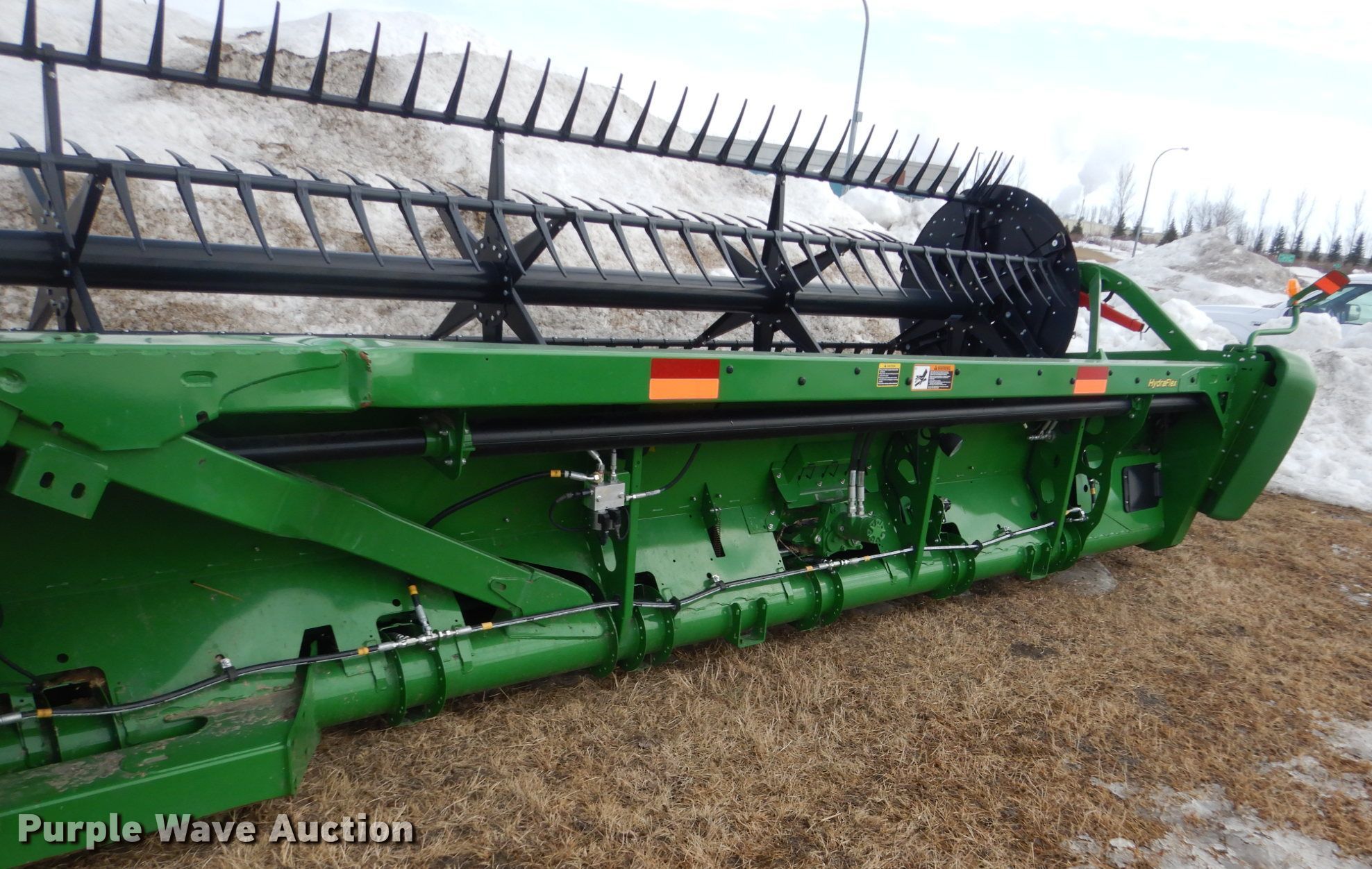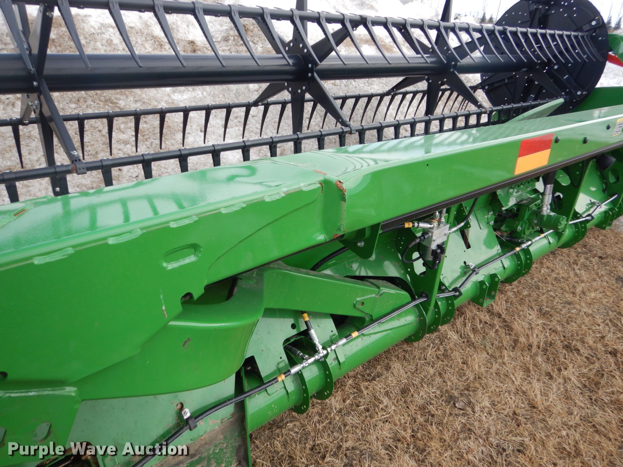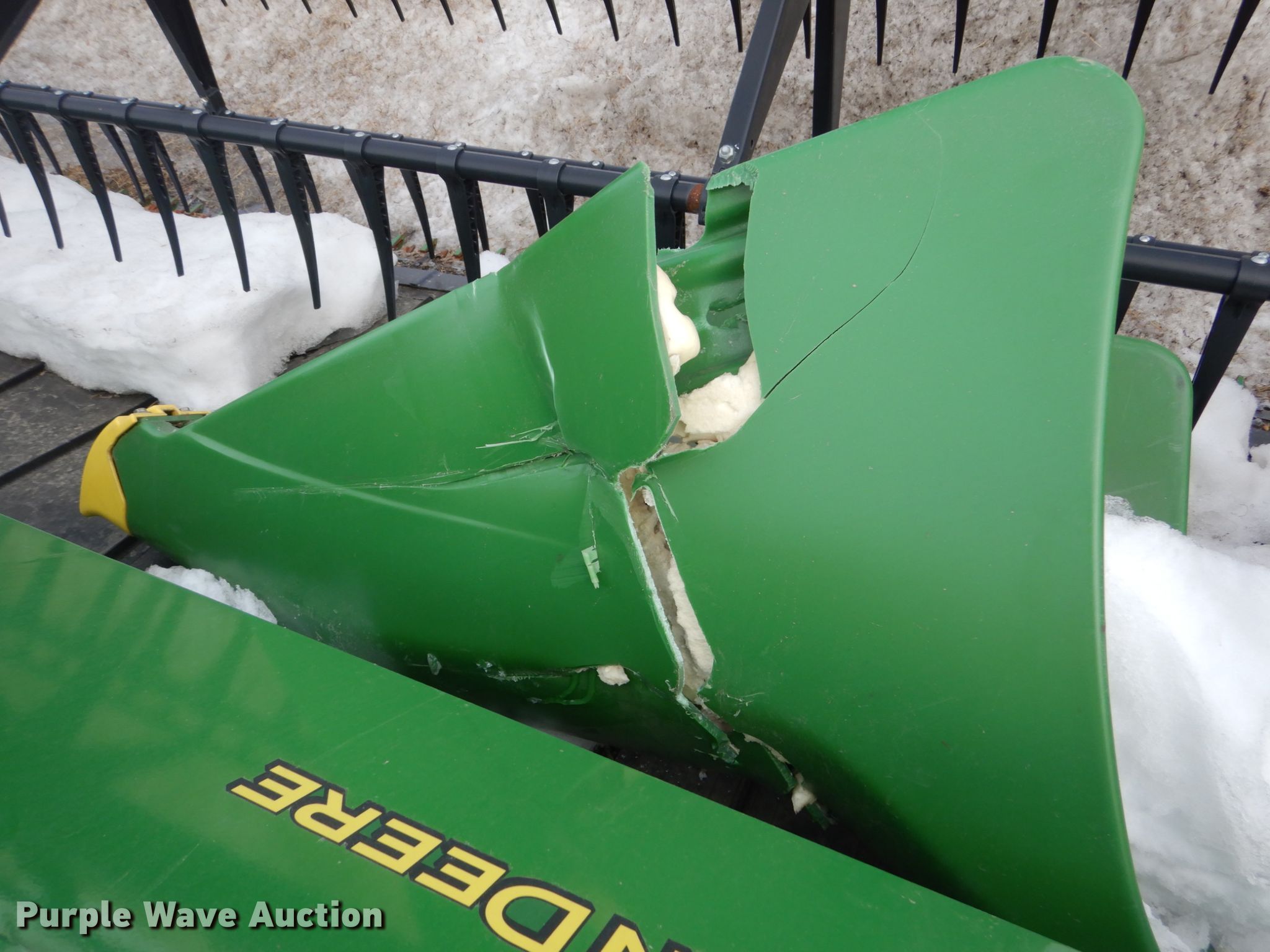 Purple Wave is selling a used Platform or Stripper Head in Minnesota. This item is a 2018 John Deere 640FD draper head with the following: Finger reel, Flip-over reel kit, Hydraulic fore/aft, Hydraulic reel height control, Dual knife drive, Poly skid plated, Single driveline, Single point coupler, Wrecked, Serial 1H0640FDPJ0800688