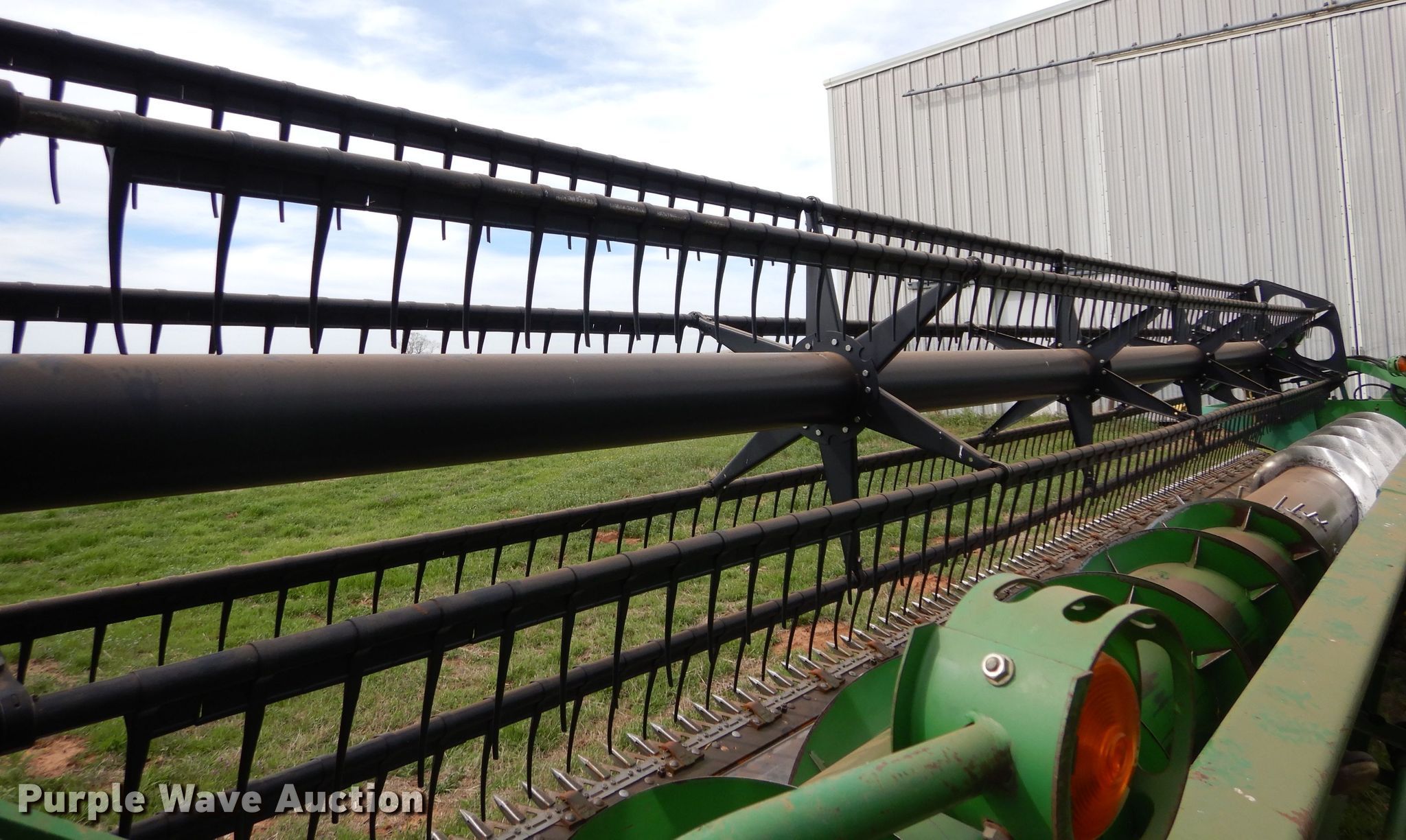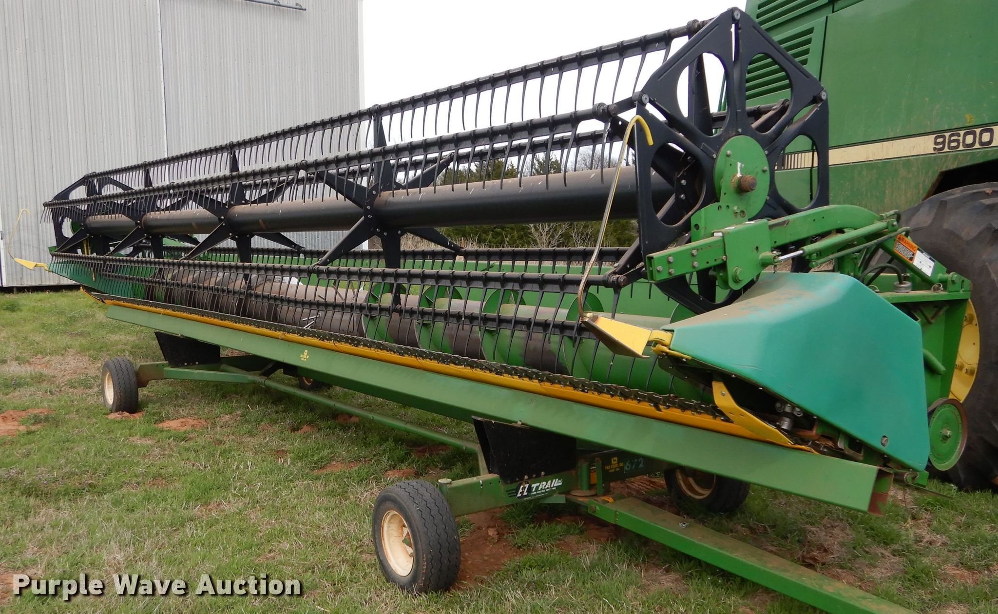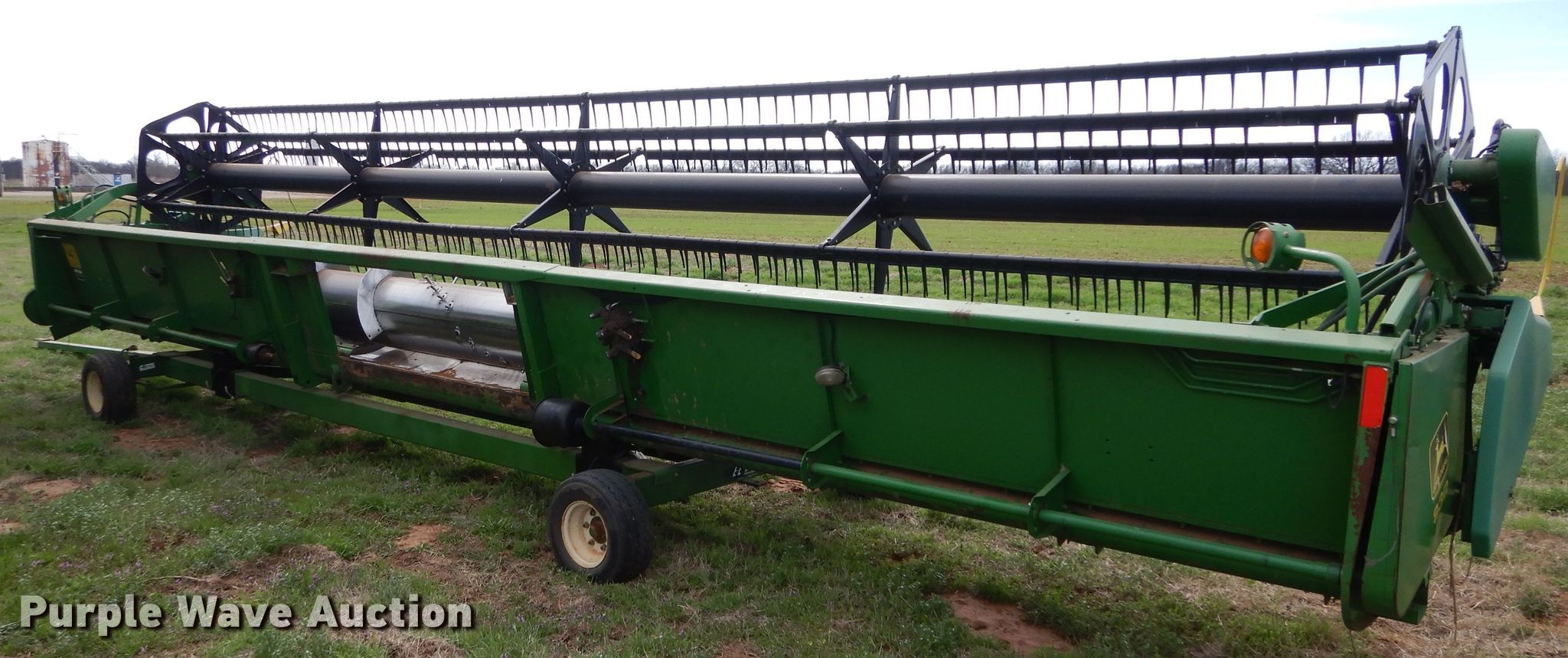 Purple Wave is selling a used Platform or Stripper Head in Oklahoma. This item is a 1996 John Deere 930 flex head with the following: 30'W, Finger reel, Poly skid plates, Dual drivelines, Transport package, 20.5-80-10 tires, Serial H00930E666230