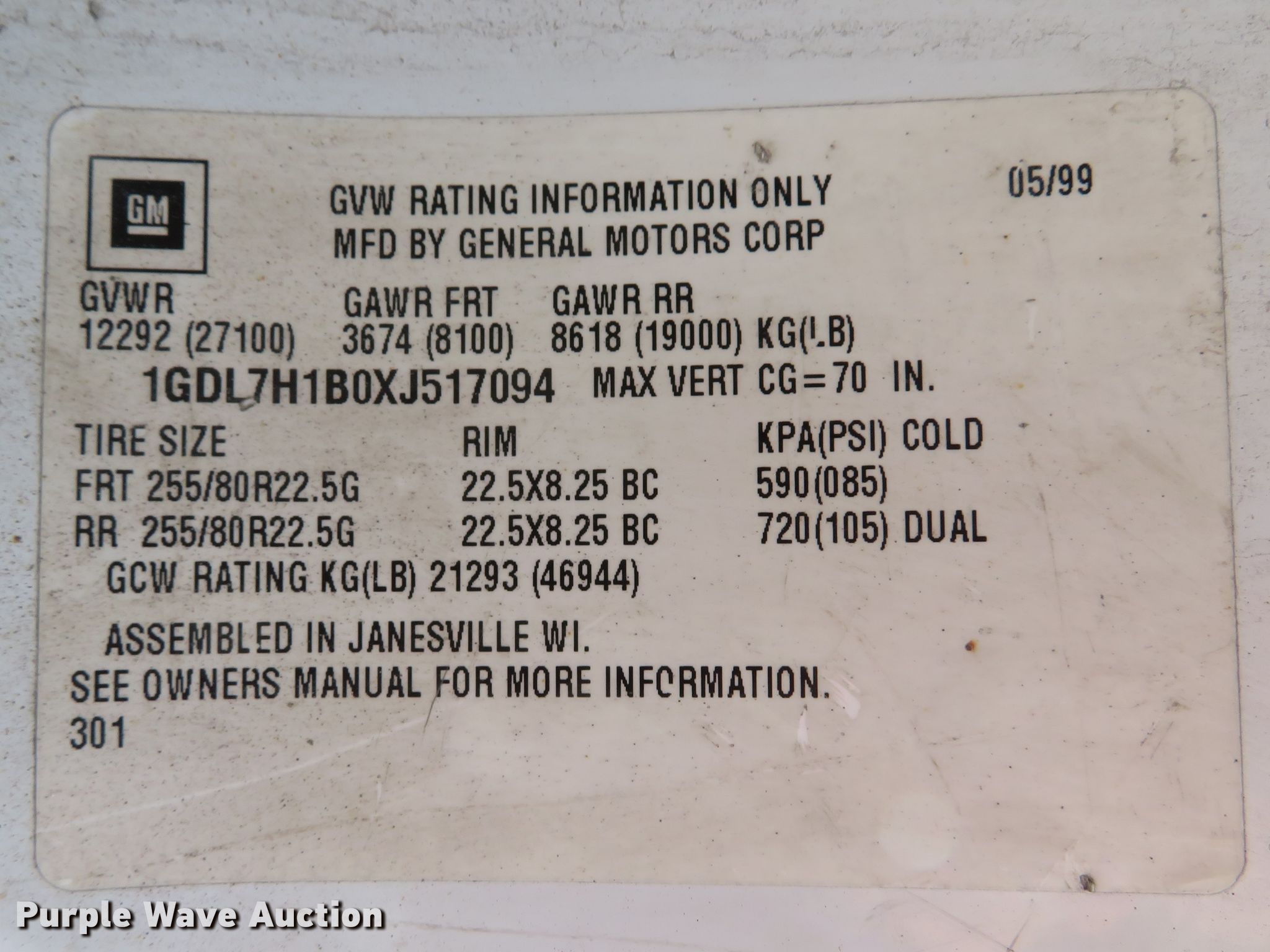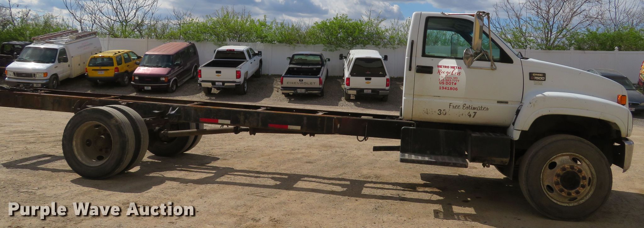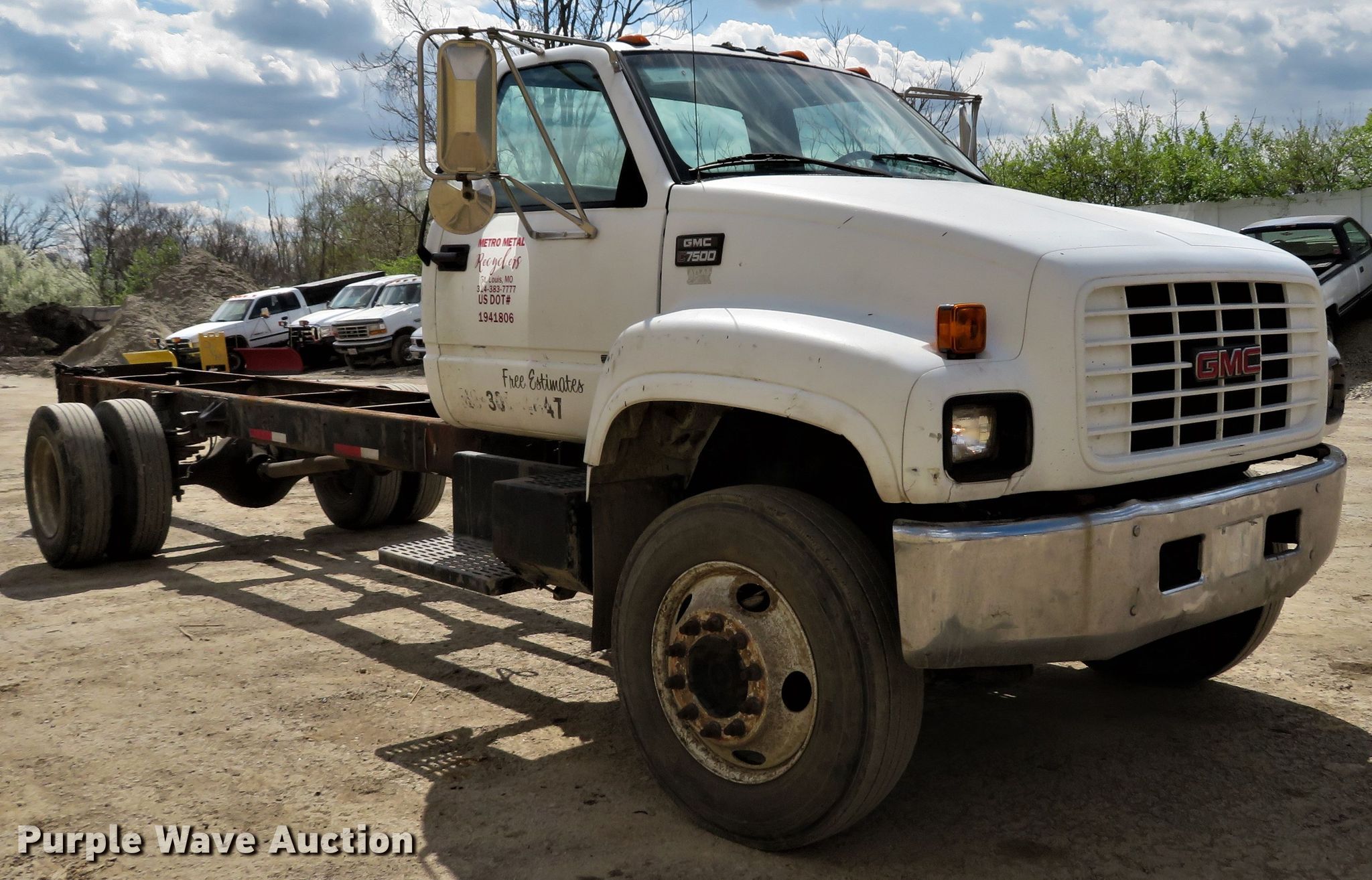 Purple Wave is selling a used Truck Chassis in Missouri. This item is a 1999 GMC C7500 truck cab and chassis with the following: 241,410 miles on odometer, 7.4L V8 OHV 16V gas engine, Five speed manual transmission, Two speed rear end, Single axle, AC and heat, 158" from rear of cab to center of rear axle, Spring suspension, Hydraulic brakes, 229" wheelbase, 265/75R22.5 tires, GVWR 27,100 lbs, Clutch pedal is stiff, ABS brake light on, Brake light on, AC does not blow cold, may need freon
