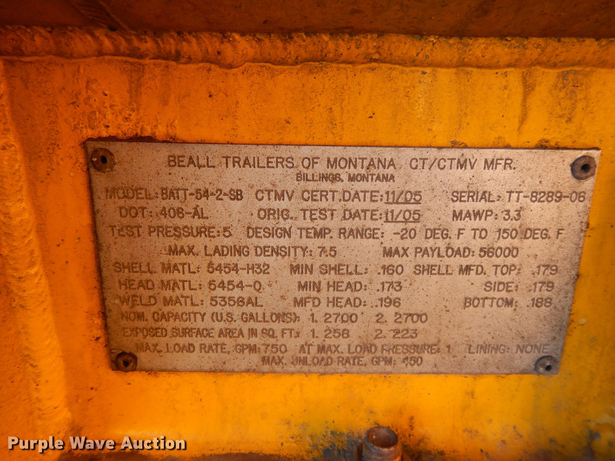 Purple Wave is selling a used Tank Trailer in Utah. This item is a 2006 Beall BATT-54-2-SB tank trailer with the following: 34'L x 98"W overall, 23'L tank, 5,400 gallon capacity, Stainless steel construction, (2) compartments, (2) baffles, (2) 5" diameter outlet valves, (2) 18"W manways, Full length walkway, Single leg landing gear, Spring suspension, Air brakes, Quad axle, Aluminum wheels, 445/50R22.5 tires, GVWR 68,000 lbs, GAWR 17,000 lbs, VR test valid until April 30 2020, Inspection documents available upon request, Unit# 553