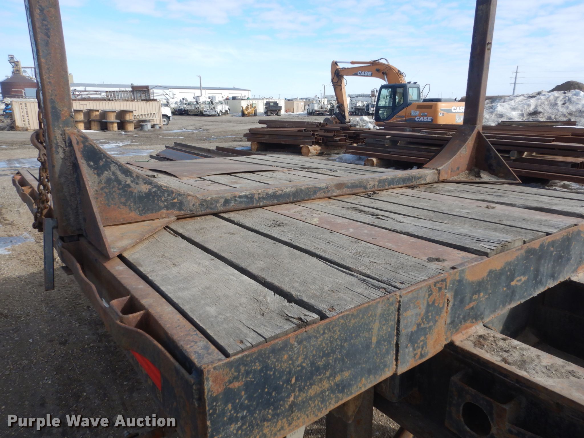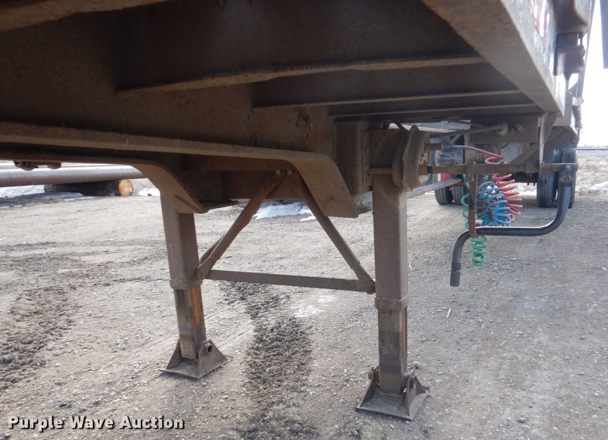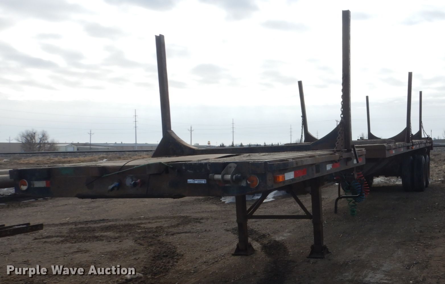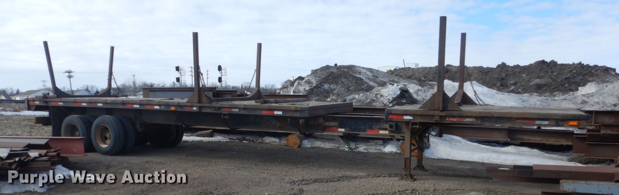 Purple Wave is selling a used Flat or Drop Deck Trailer in North Dakota. This item is a 1972 Fontenelle expandable pole trailer with the following: 40'L x 95"W overall, Expands to 75'L, Air lock pins, (3) bunks, Dual leg landing gear, Spring suspension, Electric brakes, Tandem axle, 11R22.5 tires