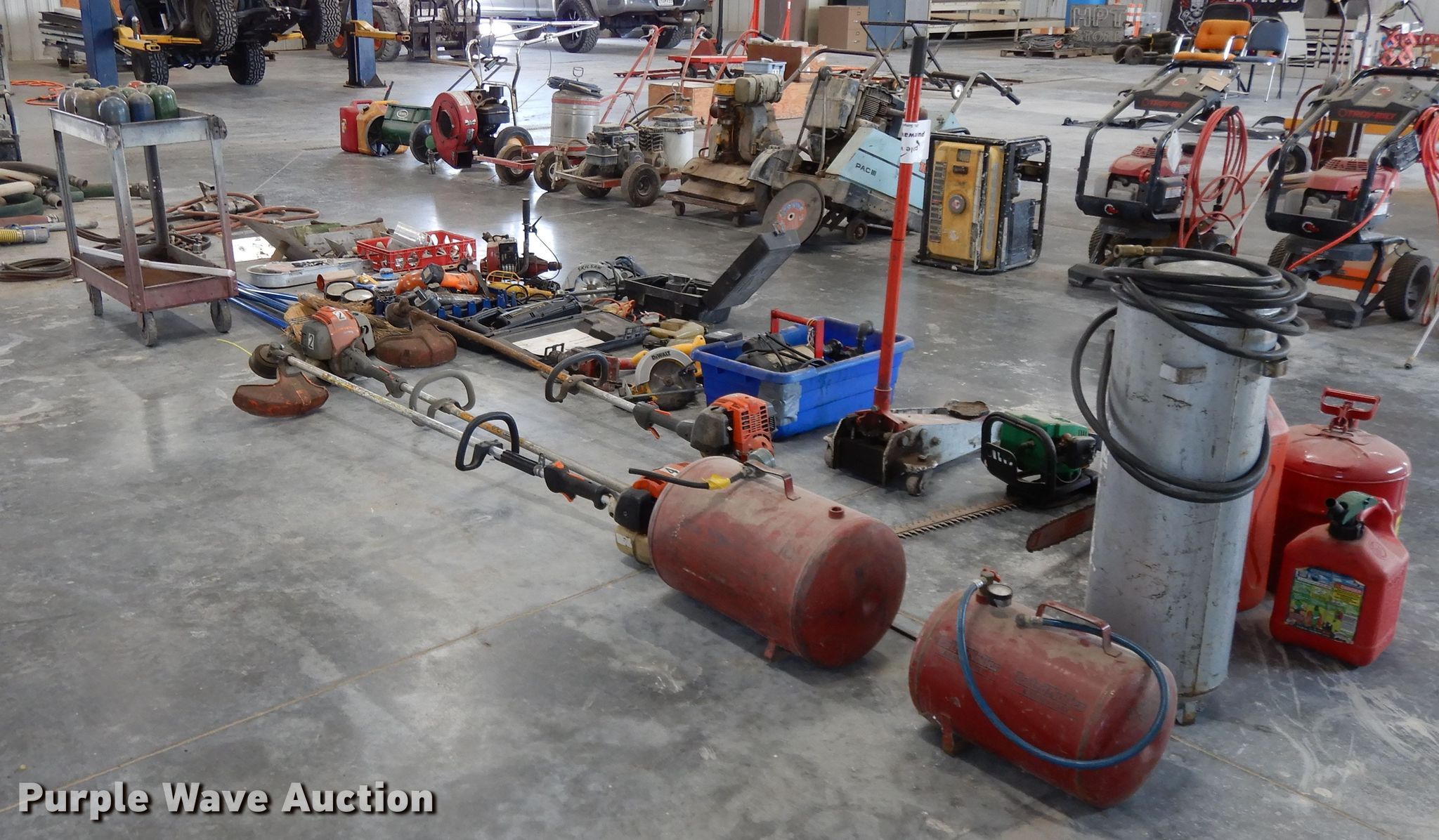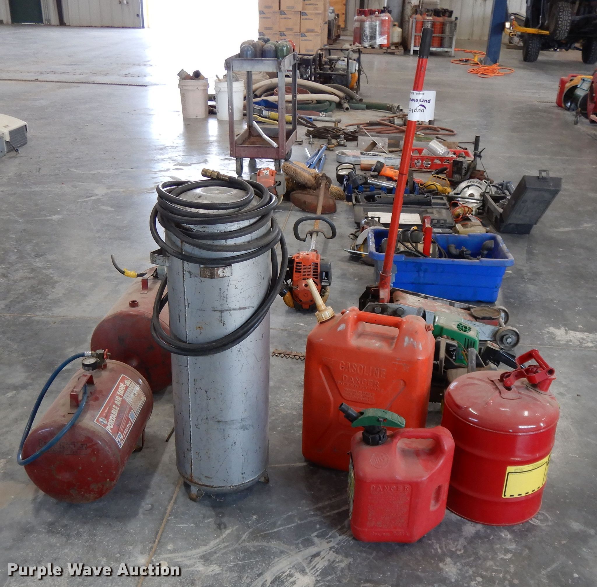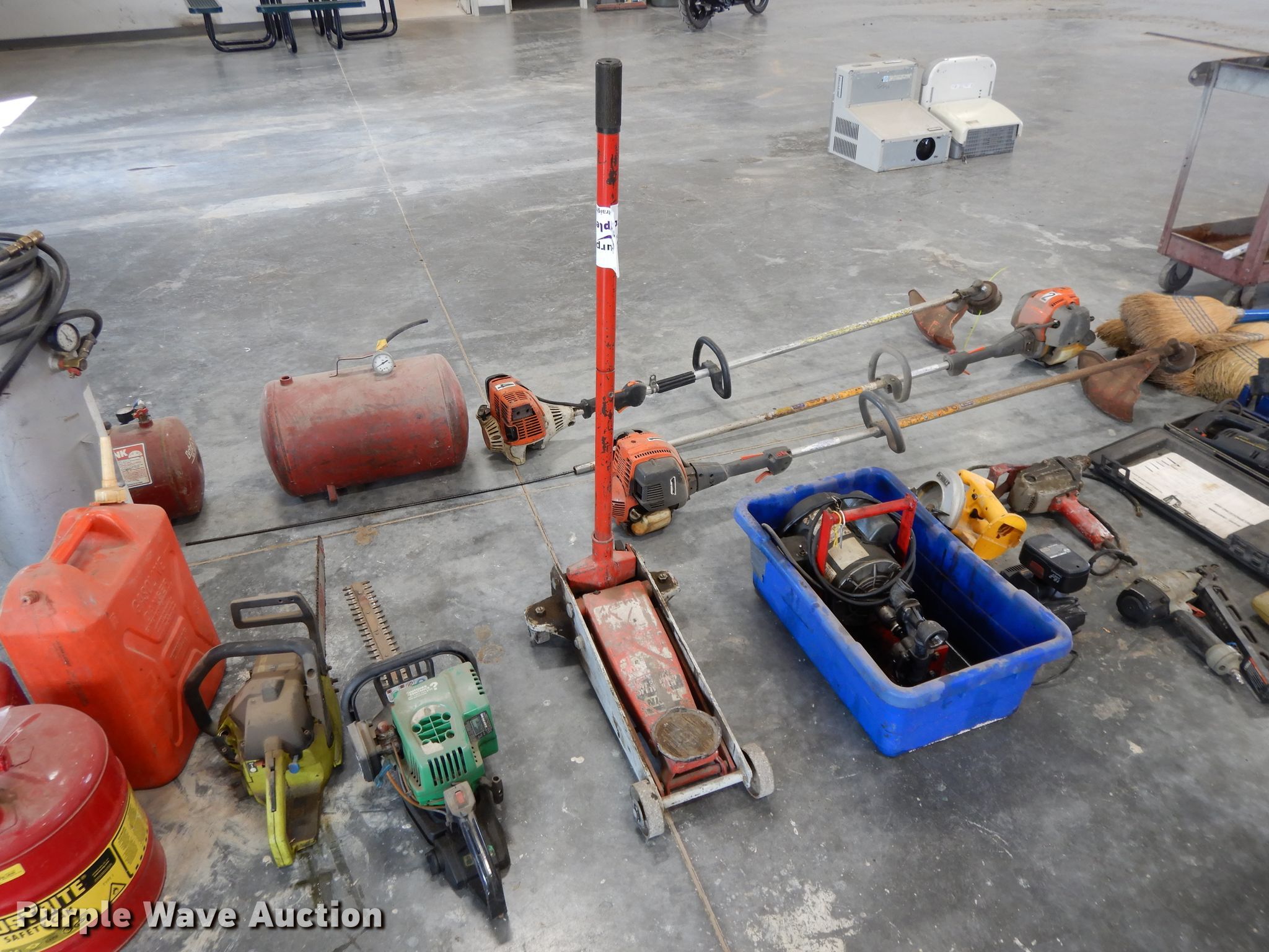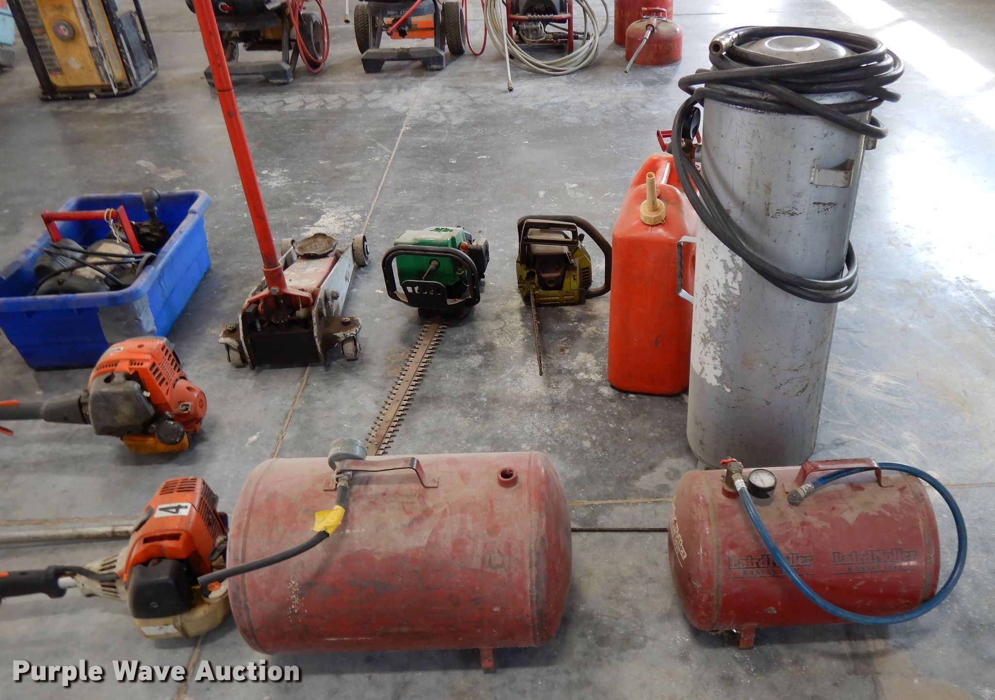 Purple Wave is selling a used Tools in Kansas. This item is a Tools with the following: (6) brooms, (16) bottle caps, Ingersoll impact, Trowels, Grease guns, Skillsaw, Craftsman sawzall, Craftsman sander, Drills, DeWalt circular saw, Floor Jack, Hedge trimmer, Poulan 2150 Chainsaw, (3) air bubbles, (3) fuel cans, (3) Stihl string trimmers, Unknown operating condition