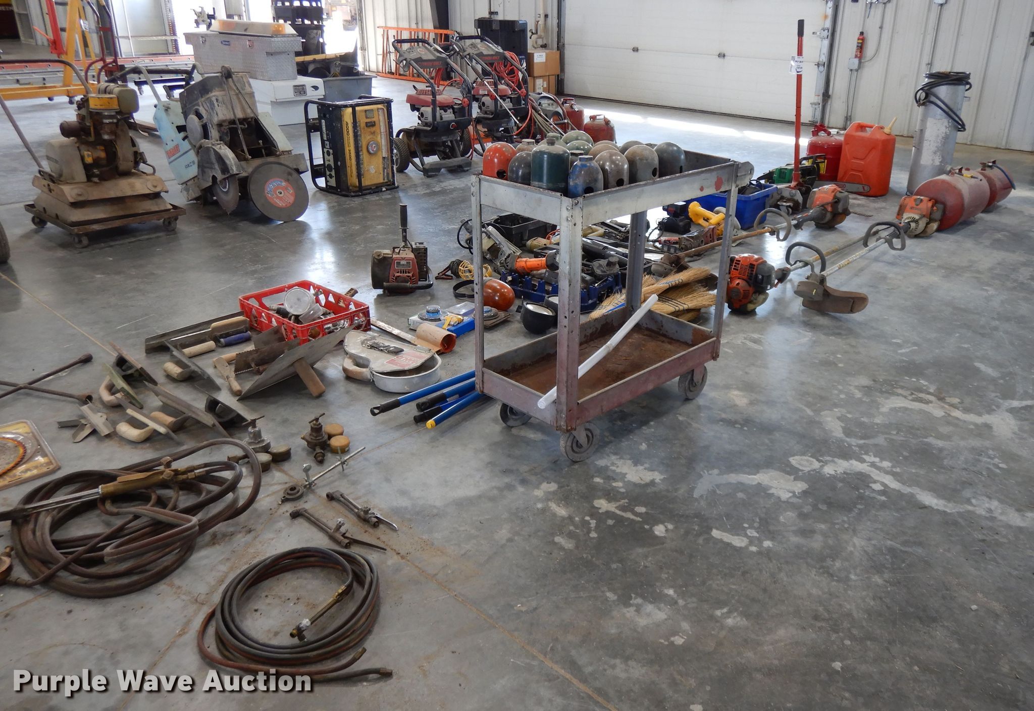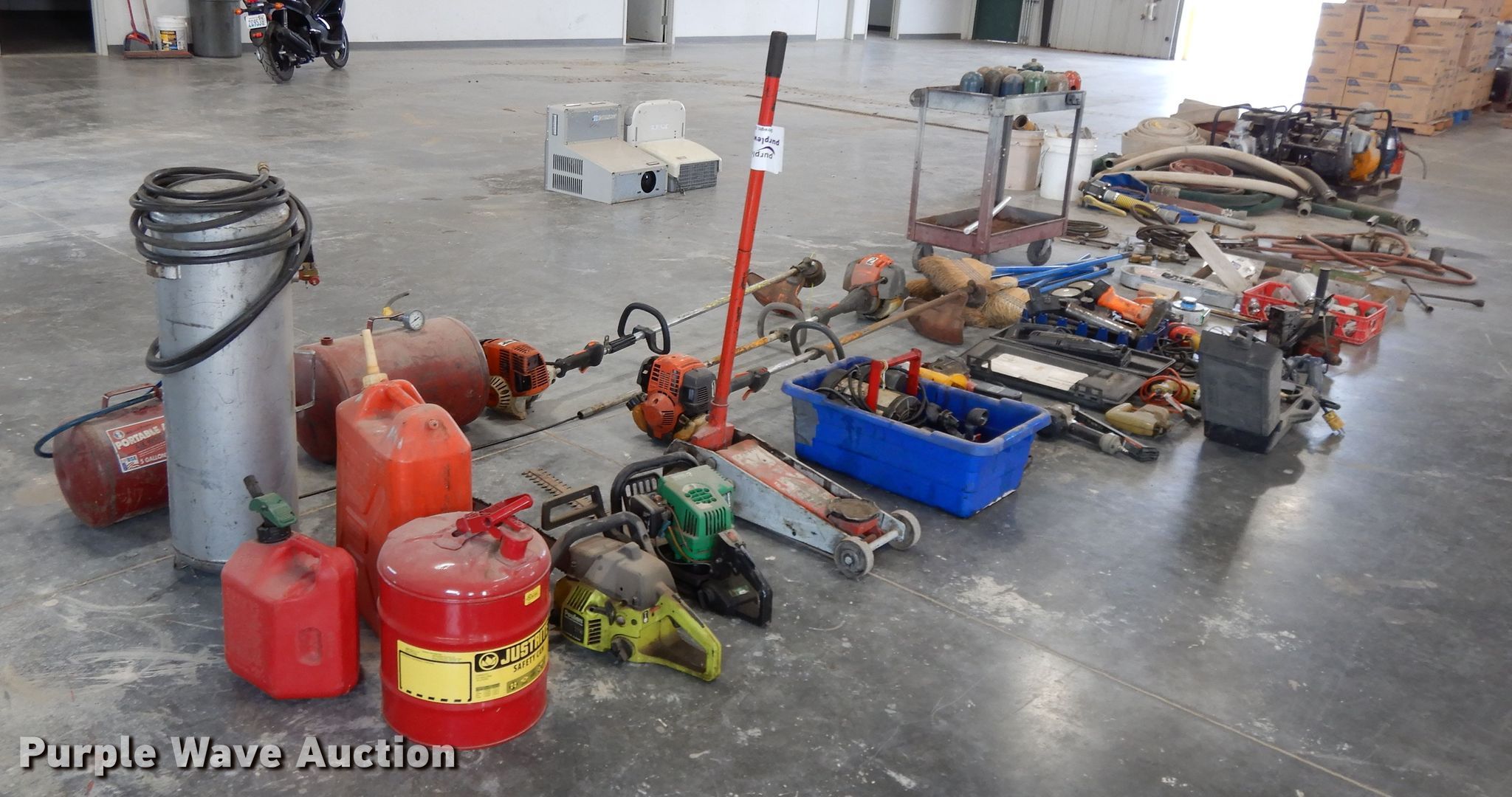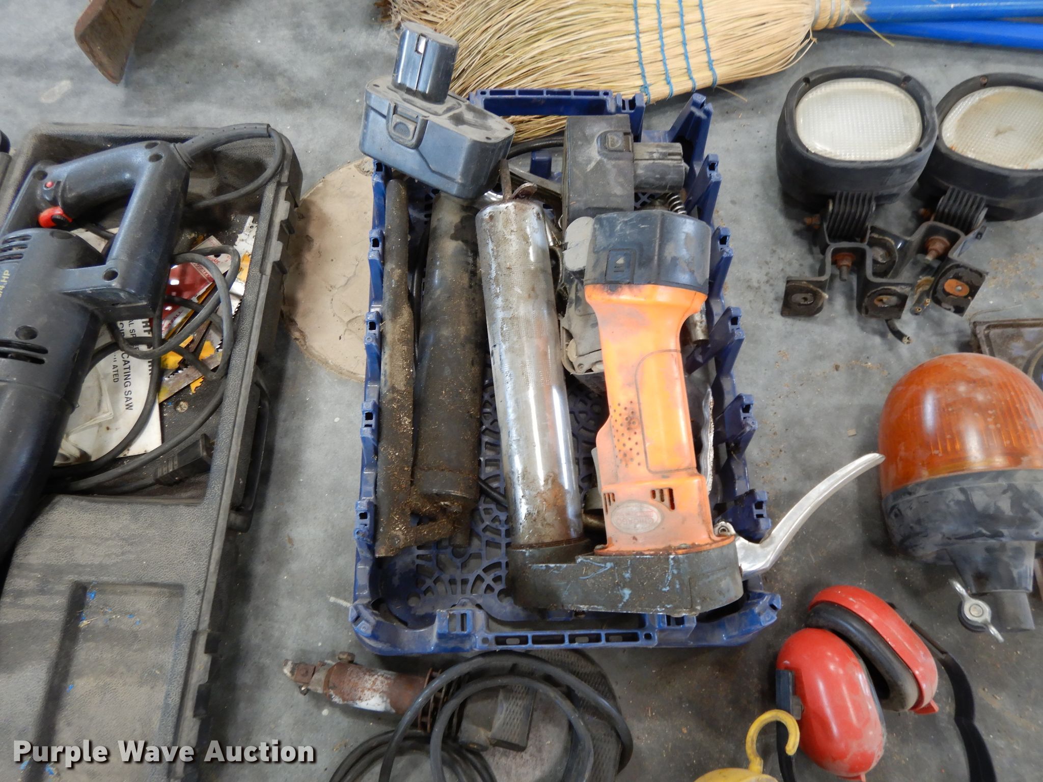 Purple Wave is selling a used Tools in Kansas. This item is a Tools with the following: (6) brooms, (16) bottle caps, Ingersoll impact, Trowels, Grease guns, Skillsaw, Craftsman sawzall, Craftsman sander, Drills, DeWalt circular saw, Floor Jack, Hedge trimmer, Poulan 2150 Chainsaw, (3) air bubbles, (3) fuel cans, (3) Stihl string trimmers, Unknown operating condition