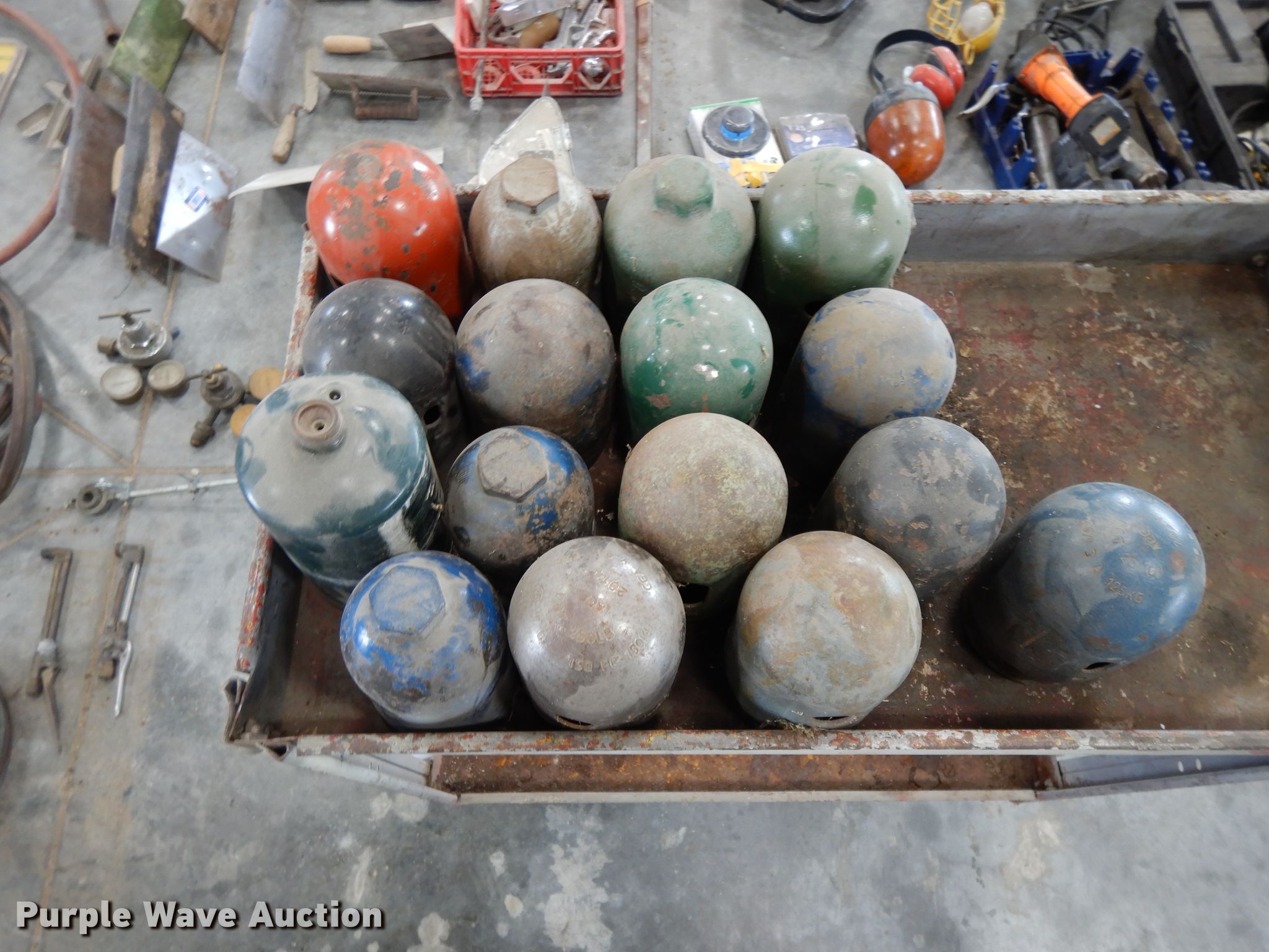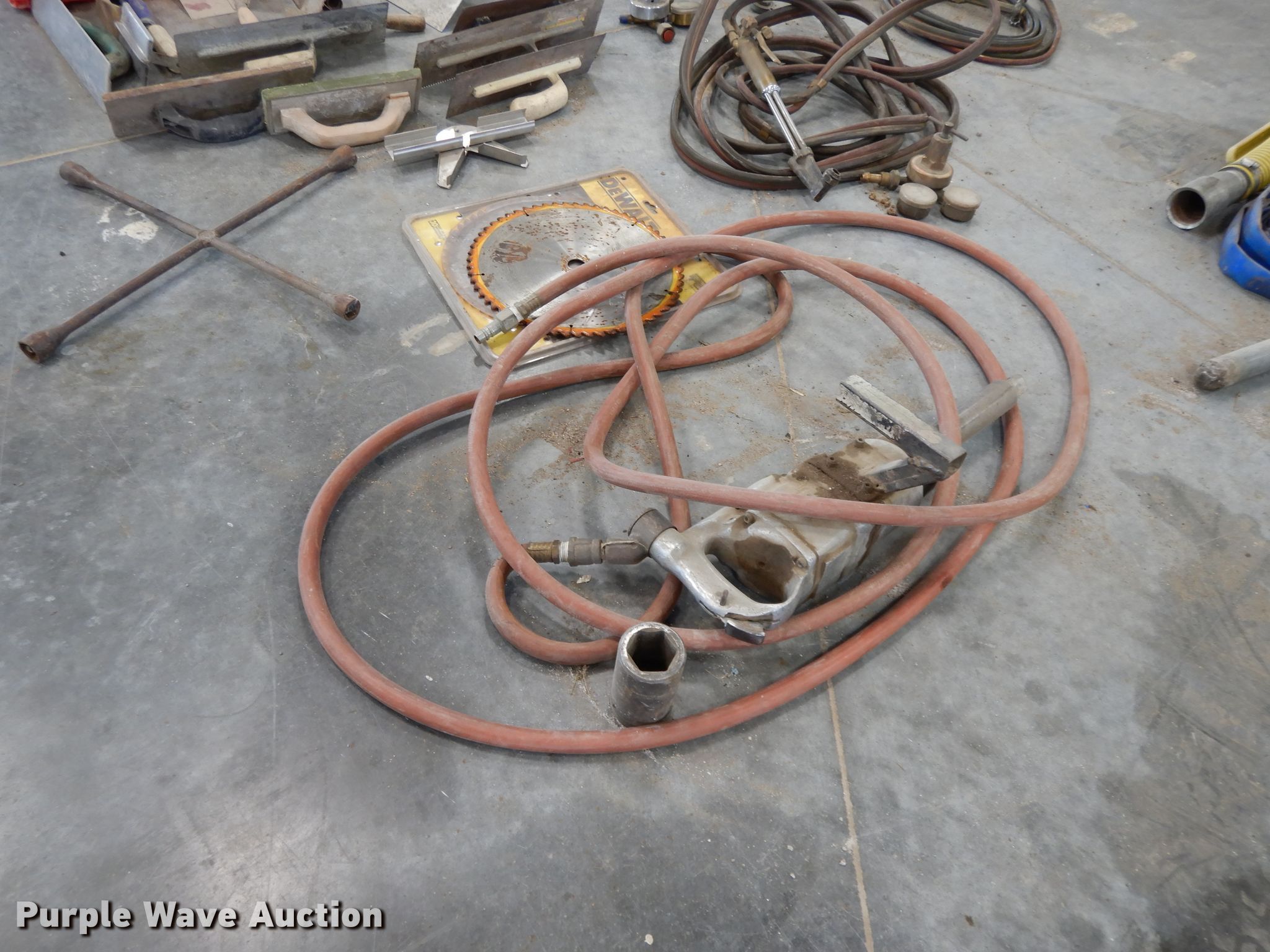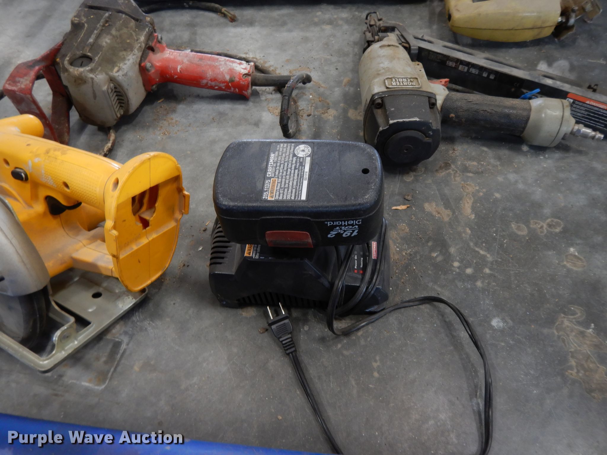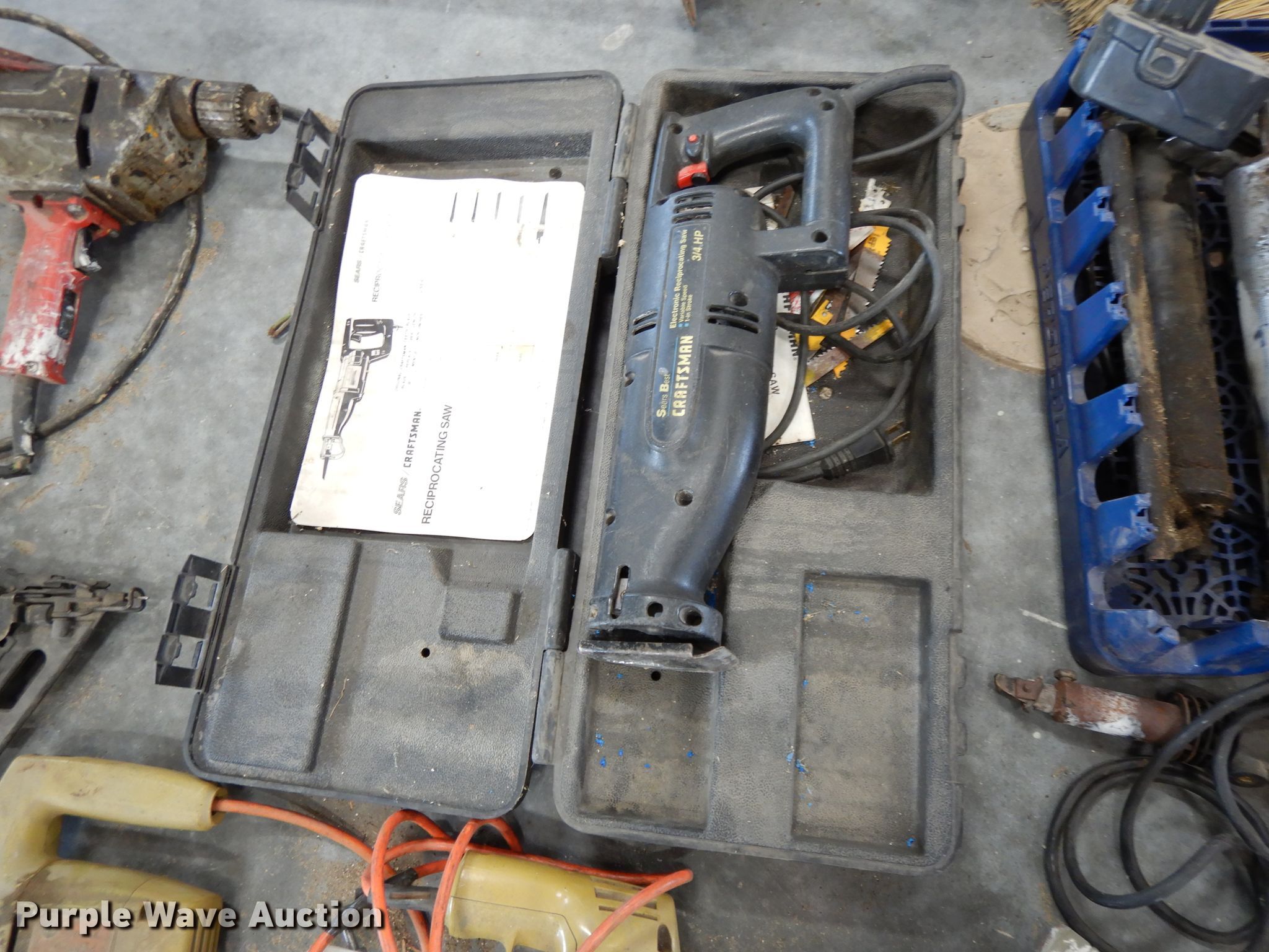 Purple Wave is selling a used Tools in Kansas. This item is a Tools with the following: (6) brooms, (16) bottle caps, Ingersoll impact, Trowels, Grease guns, Skillsaw, Craftsman sawzall, Craftsman sander, Drills, DeWalt circular saw, Floor Jack, Hedge trimmer, Poulan 2150 Chainsaw, (3) air bubbles, (3) fuel cans, (3) Stihl string trimmers, Unknown operating condition