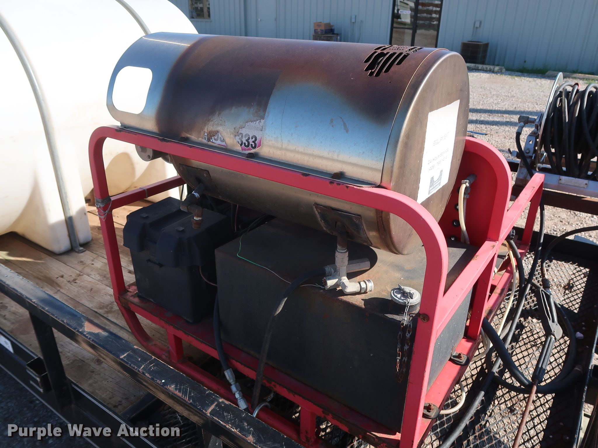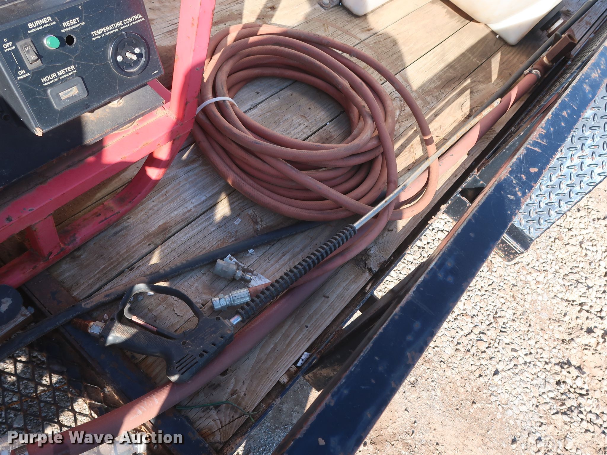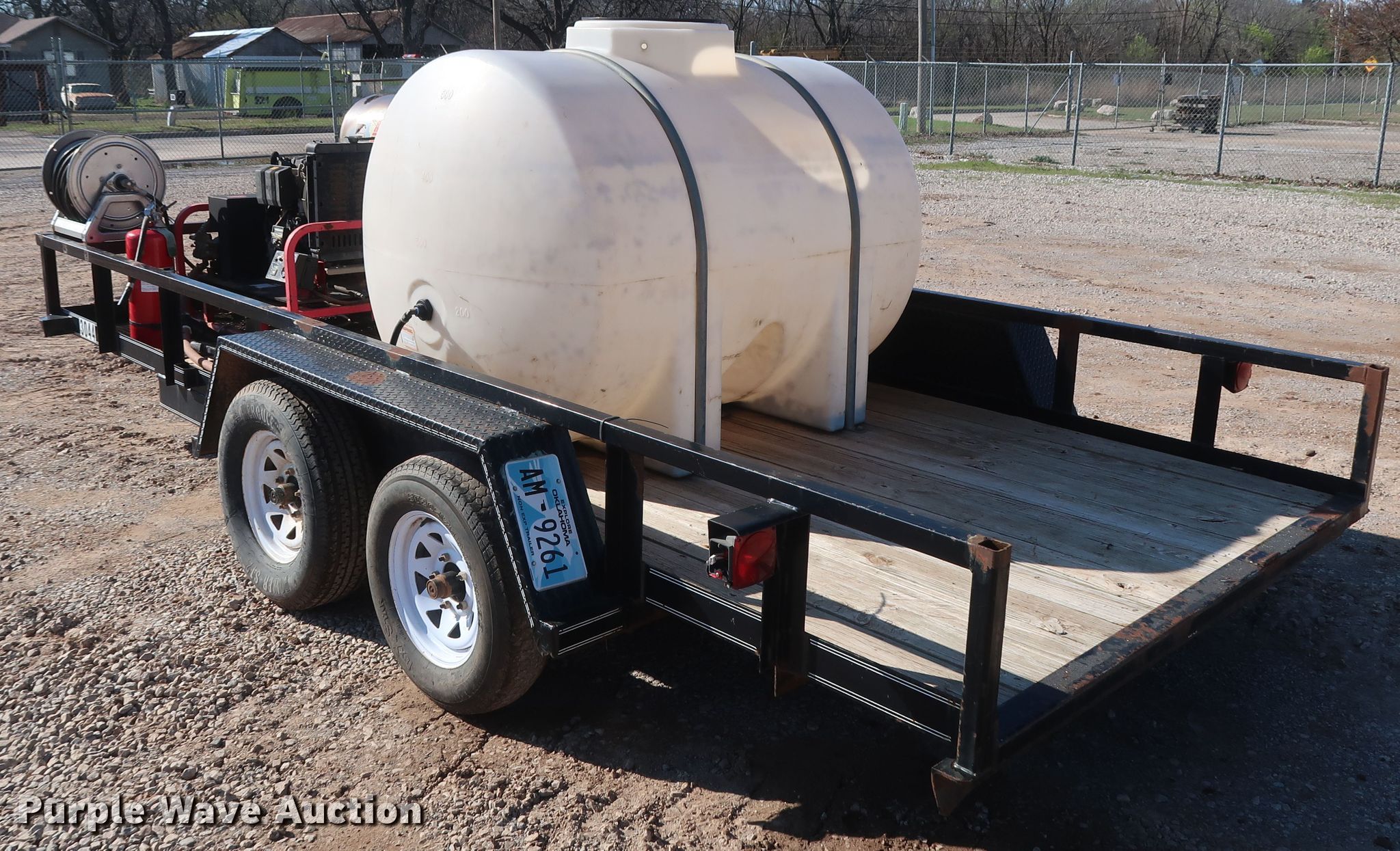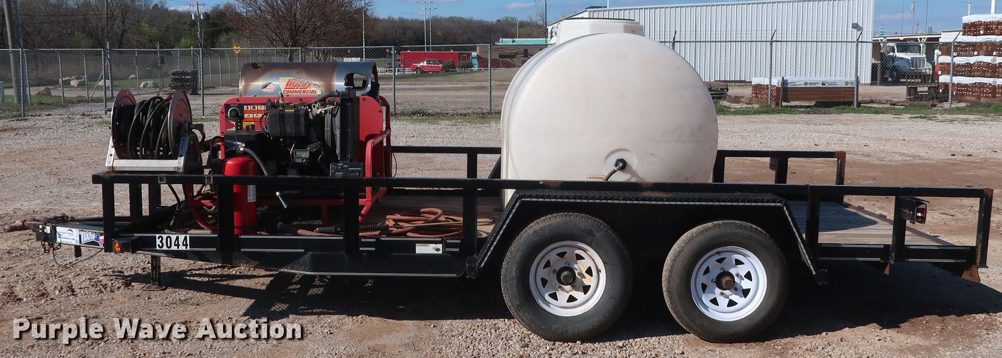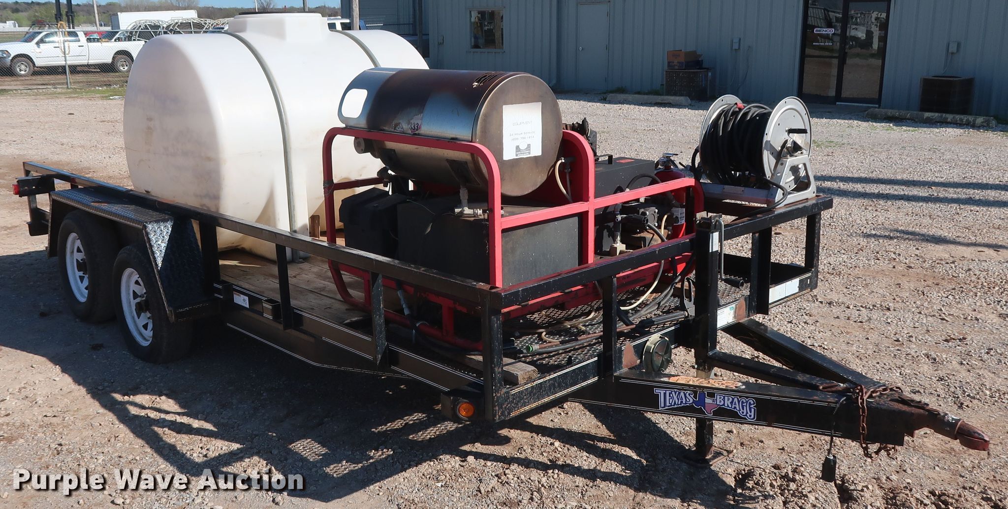 Purple Wave is selling a used Trailer Other in Oklahoma. This item is a 2010 Texas Bragg utility trailer with pressure washer with the following: 19.5'L x 96"W overall, 16'L x 76"W wood deck, Hotsy HCD-503069E pressure washer, Lombardini FOCS Plus two cylinder diesel engine, Hotsy HM4035R.3 pump, 3,500 psi, 4.8 gallon per minute capacity, Beckett ADC oil burner, 411,000 BTU per hour capacity, 500 gallon tank, Hose, Reel, Wand, Electric brakes, Tandem axle, 2" ball hitch, ST205/75R15 tires, ST225/75R15 tires