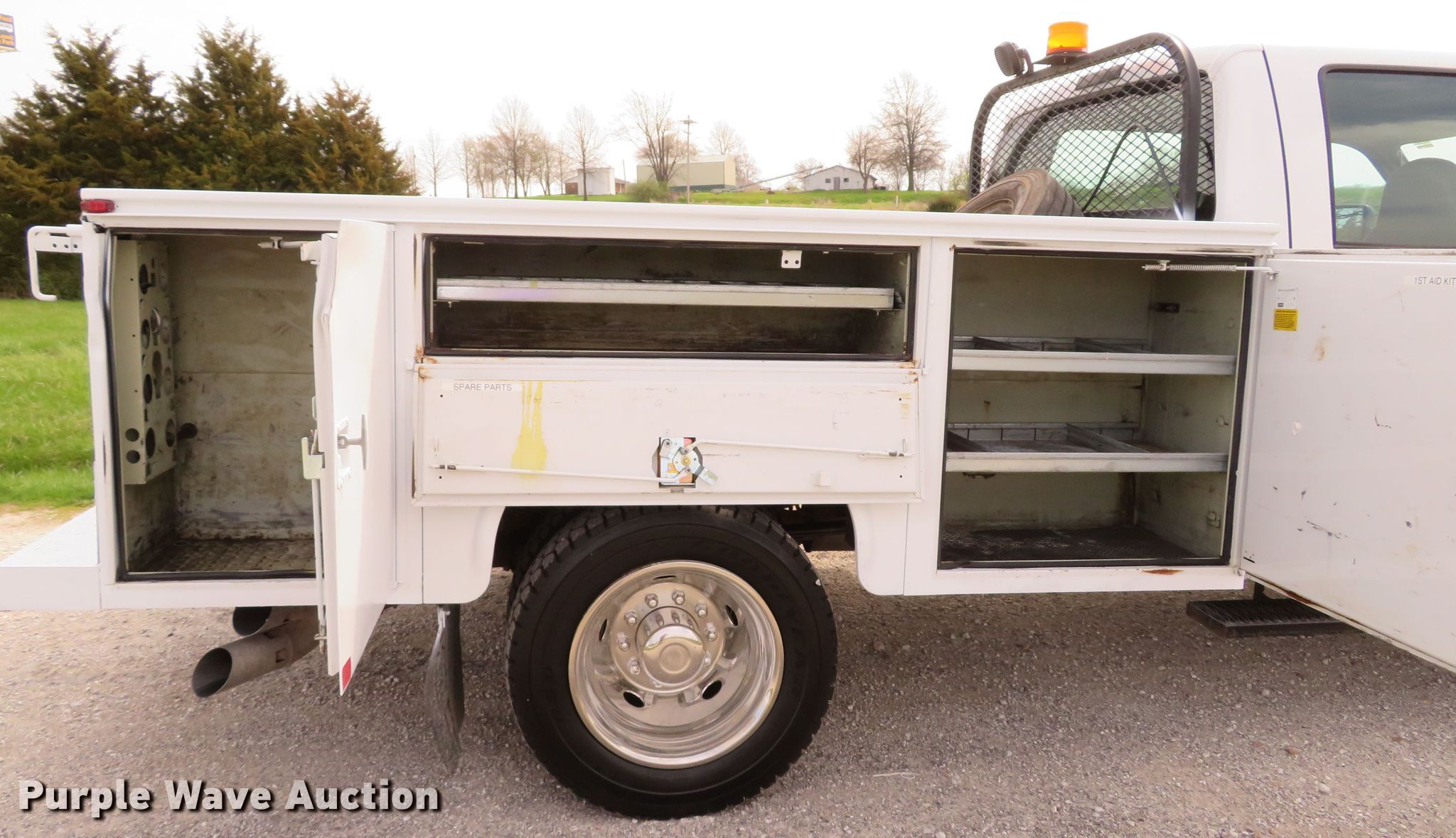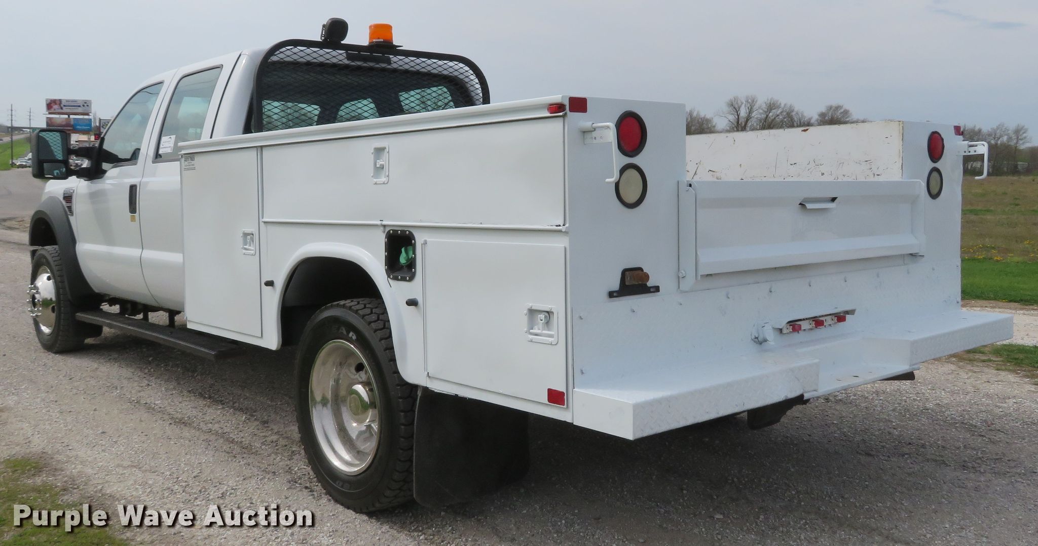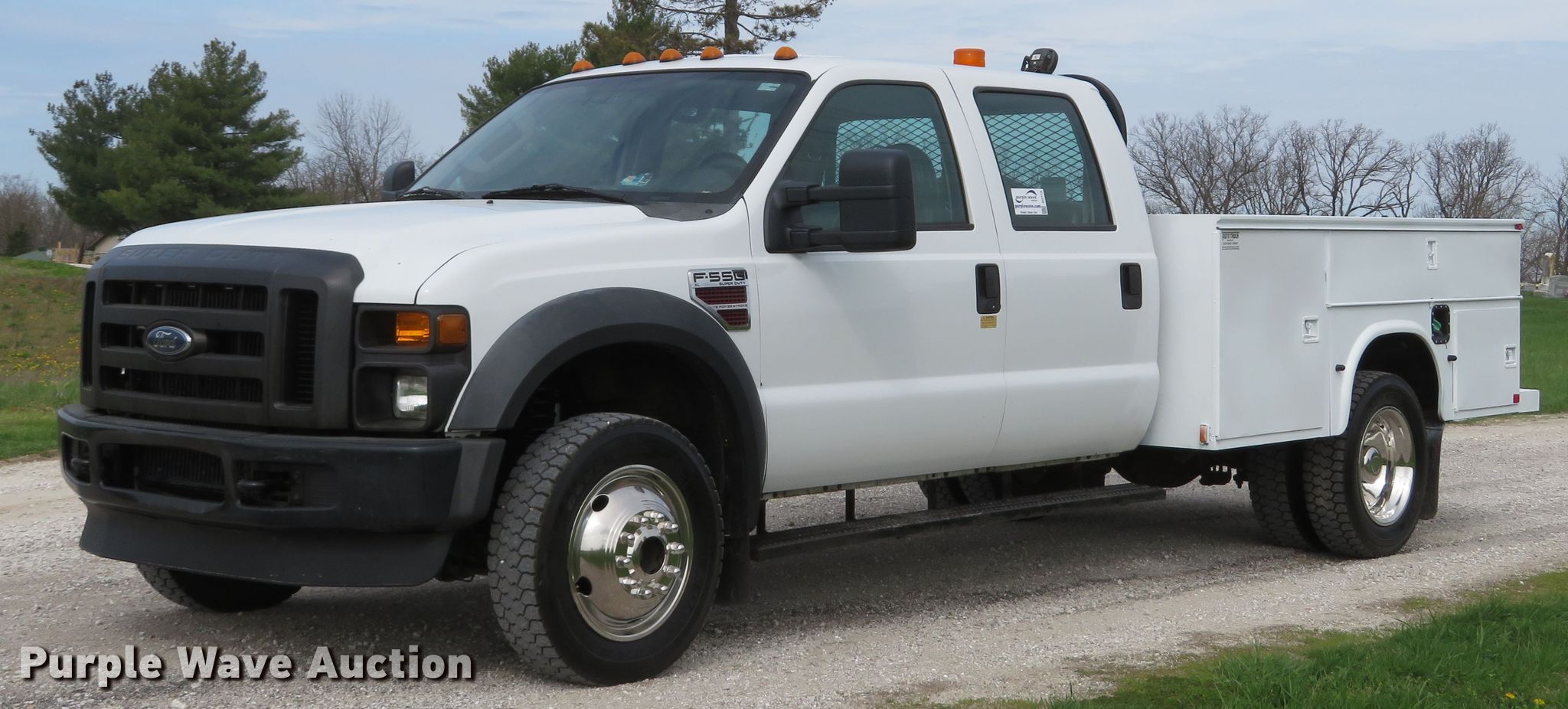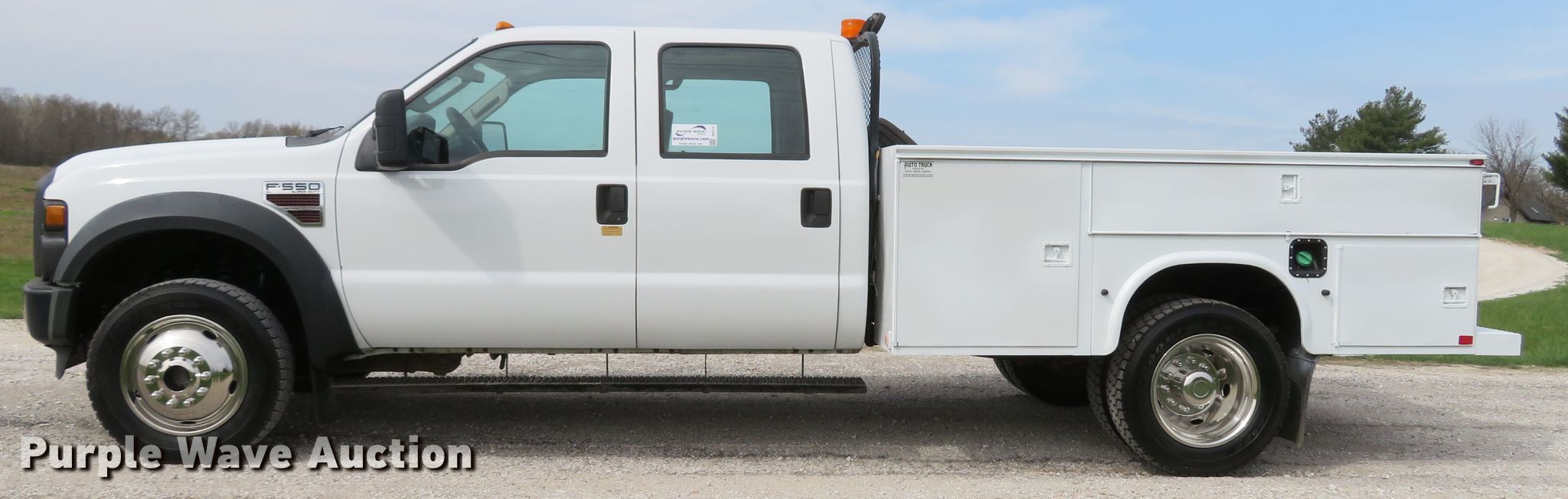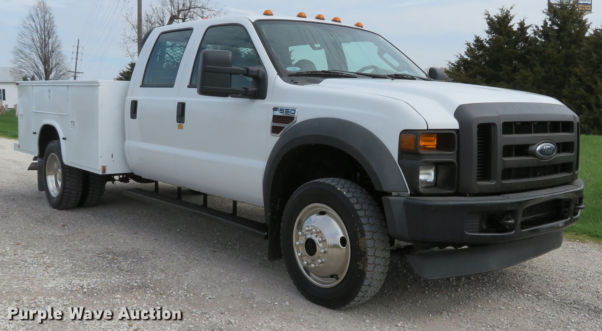 Purple Wave is selling a used Service Truck in Missouri. This item is a 2008 Ford F550 Super Duty XL Crew Cab utility truck with the following: 184,881 miles on odometer, 6.4L V8 OHV 32V diesel engine, Automatic transmission, Single axle, Four wheel drive, AC and heat, Knapheide 7108D54LPRJ utility bed, 9'L, Spring suspensino, Hydraulic brakes, 225/70R19.5 tires