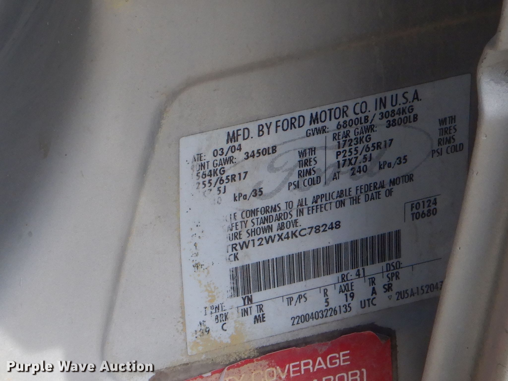 2004 Ford F150 SuperCrew pickup truck. Unknown miles on odometer. Engine Displacement: 4.6L V8 SOHC 16V, Cylinders: 8, Fuel type: Gas. Transmission Automatic. Interior AC, Heat, Powered windows, Powered locks, Cruise control. Tires Size: 255/65R17. Notes Non-operational unit, Unit# 02. Kansas title. 1FTRW12WX4KC78248. O'Brien Ready Mix, Inc.. 791 E 590th Ave. Frontenac, KS 66763