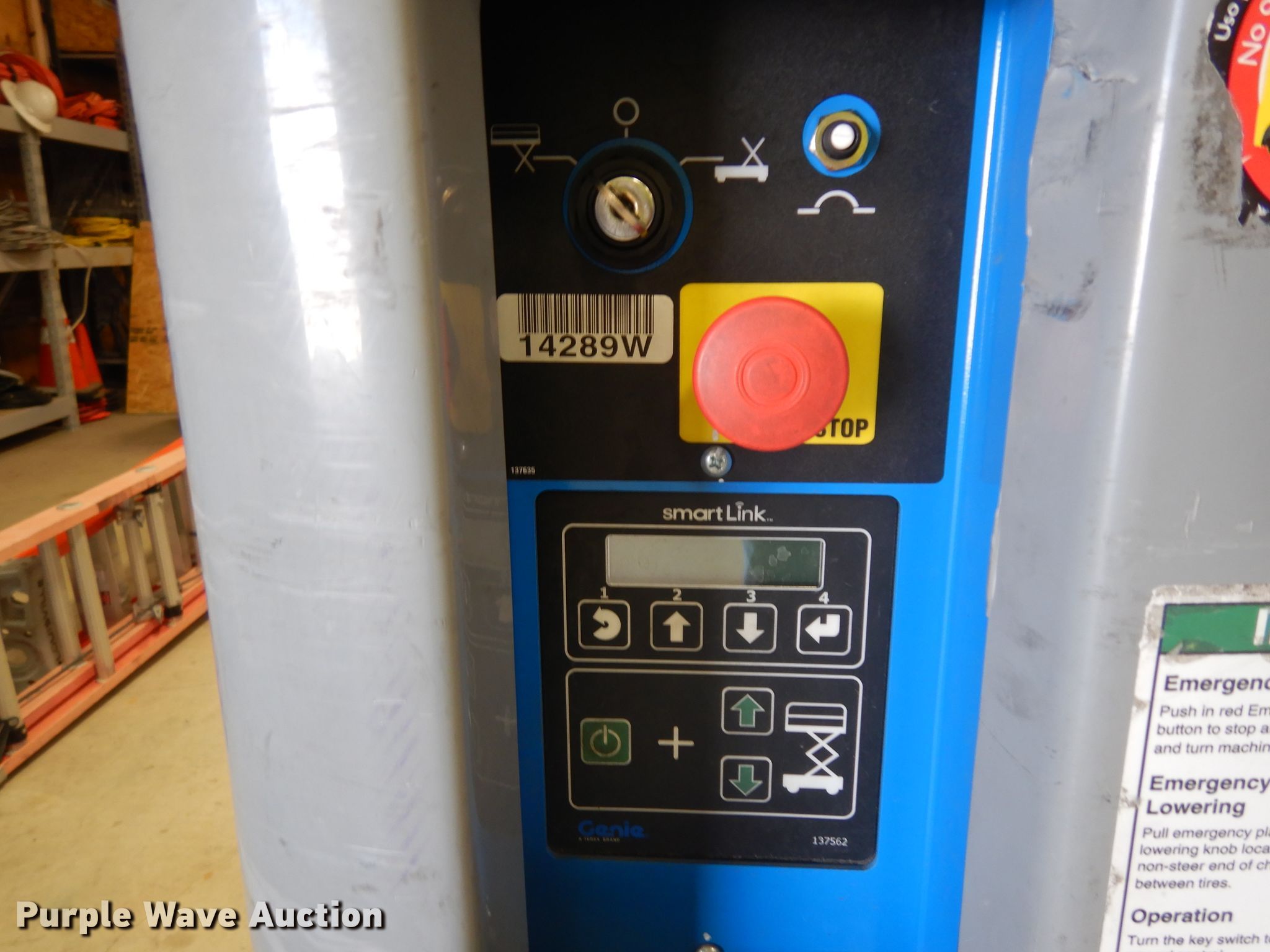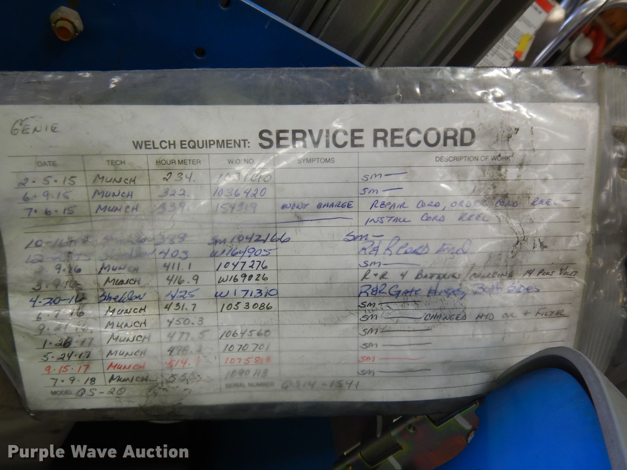 Purple Wave is selling a used Scissor or Vertical Lift in Kansas. This item is a 2014 Genie QS-20 vertical lift with the following: 635 hours on meter, Serial: QS14-1541