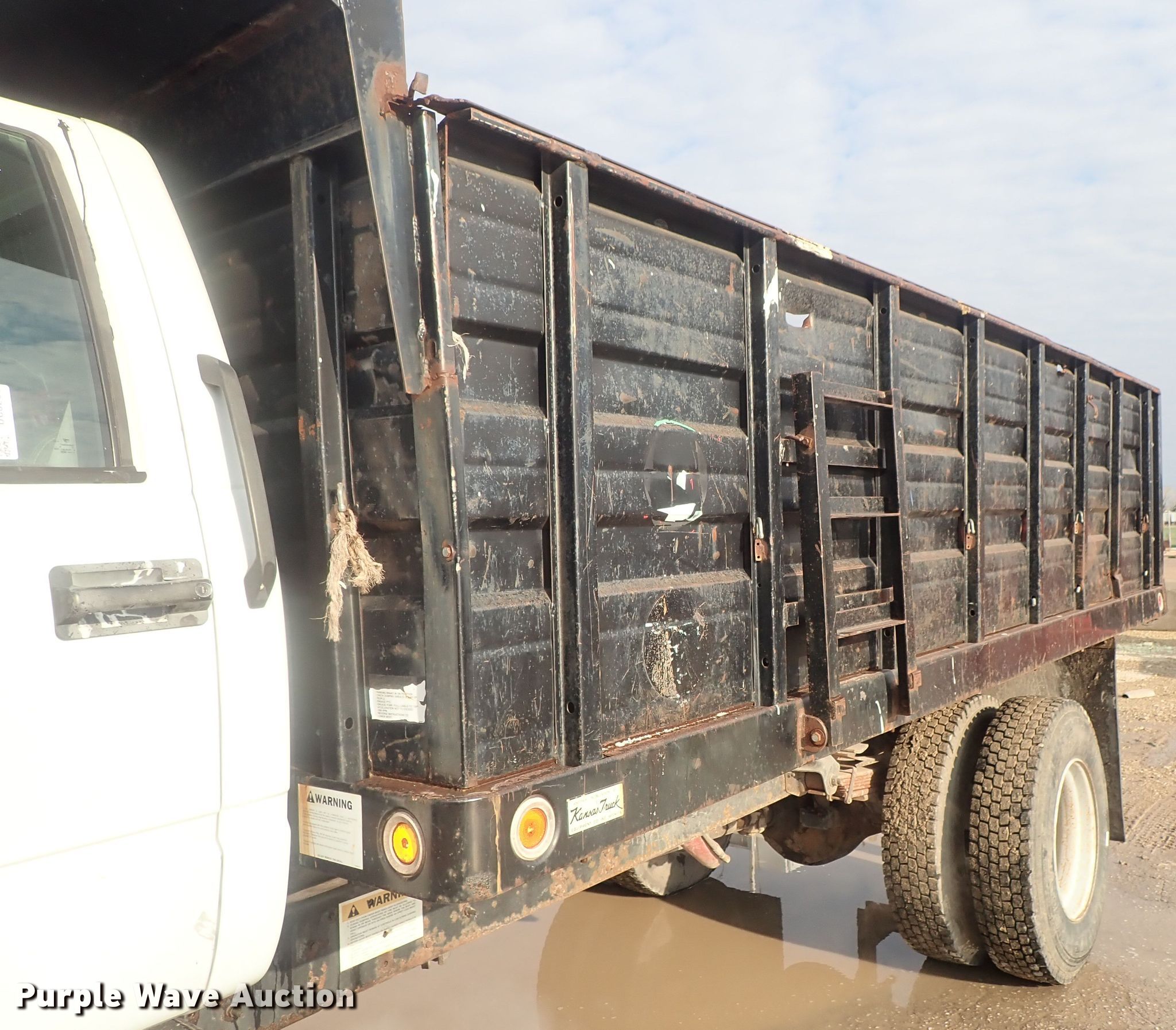 Purple Wave is selling a used Construction Dump Truck in Kansas. This item is a 2000 GMC 7500 dump truck with the following: 82,749 miles on odometer, 7.4L V8 OHV 16V gas engine, Five speed manual transmission, Two speed rear end, Single axle, Heat, PTO, 16'L x 96"W steel dump bed, 40" side height, Spring suspension, Hydraulic brakes, 11R22.5 tires, GVWR 30,000 lbs, FAWR 11,000 lbs, RAWR 19,000 lbs