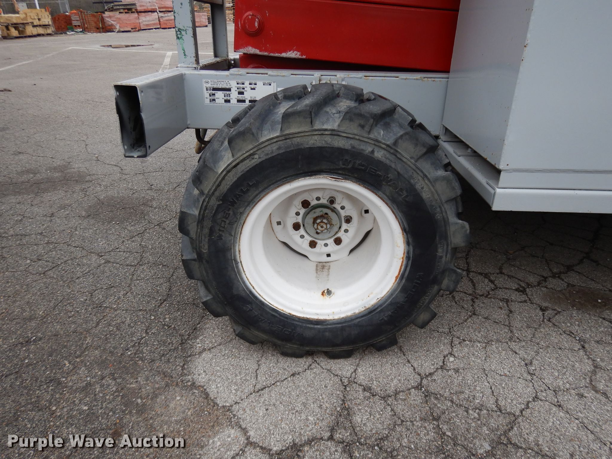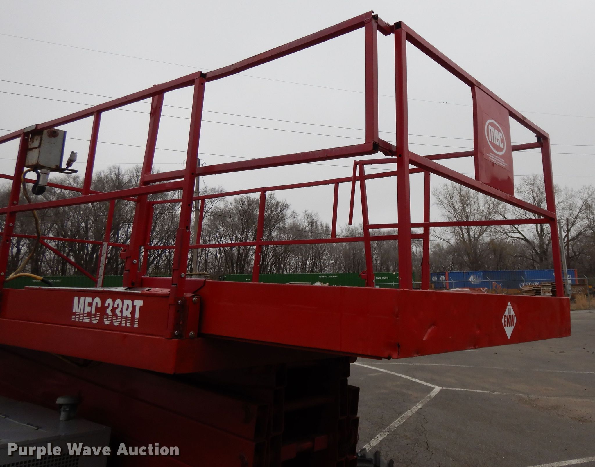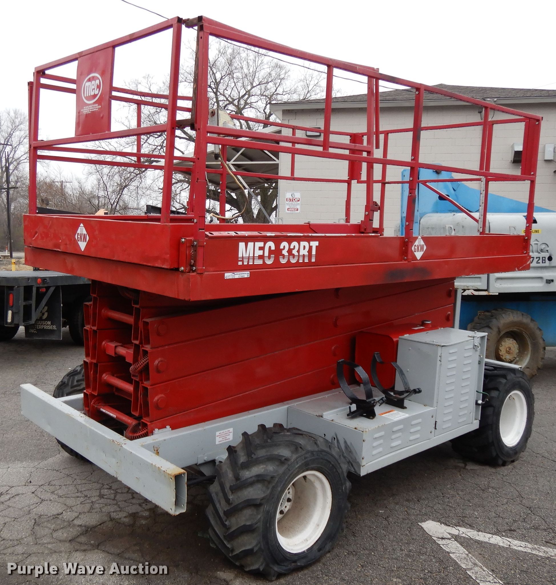 1996 Mec 33RT scissor lift. 1,713 hours on meter, Serial: 10800340. Engine Kubota WG750, Cylinders: 3, Fuel type: Dual fuel. Operational Maximum lift capacity: 1,250 lbs, Maximum lift height: 33', Platform: 132" L x 74" W, AC power outlet, Controls: Platform, Ground, Platform extensions: Manual, Safety alarm. Tires Tire size: 31x15.5-15. Notes One brake drags intermittently. GKW Restoration Group. 1100 Guinotte Ave. Kansas City, MO 64120