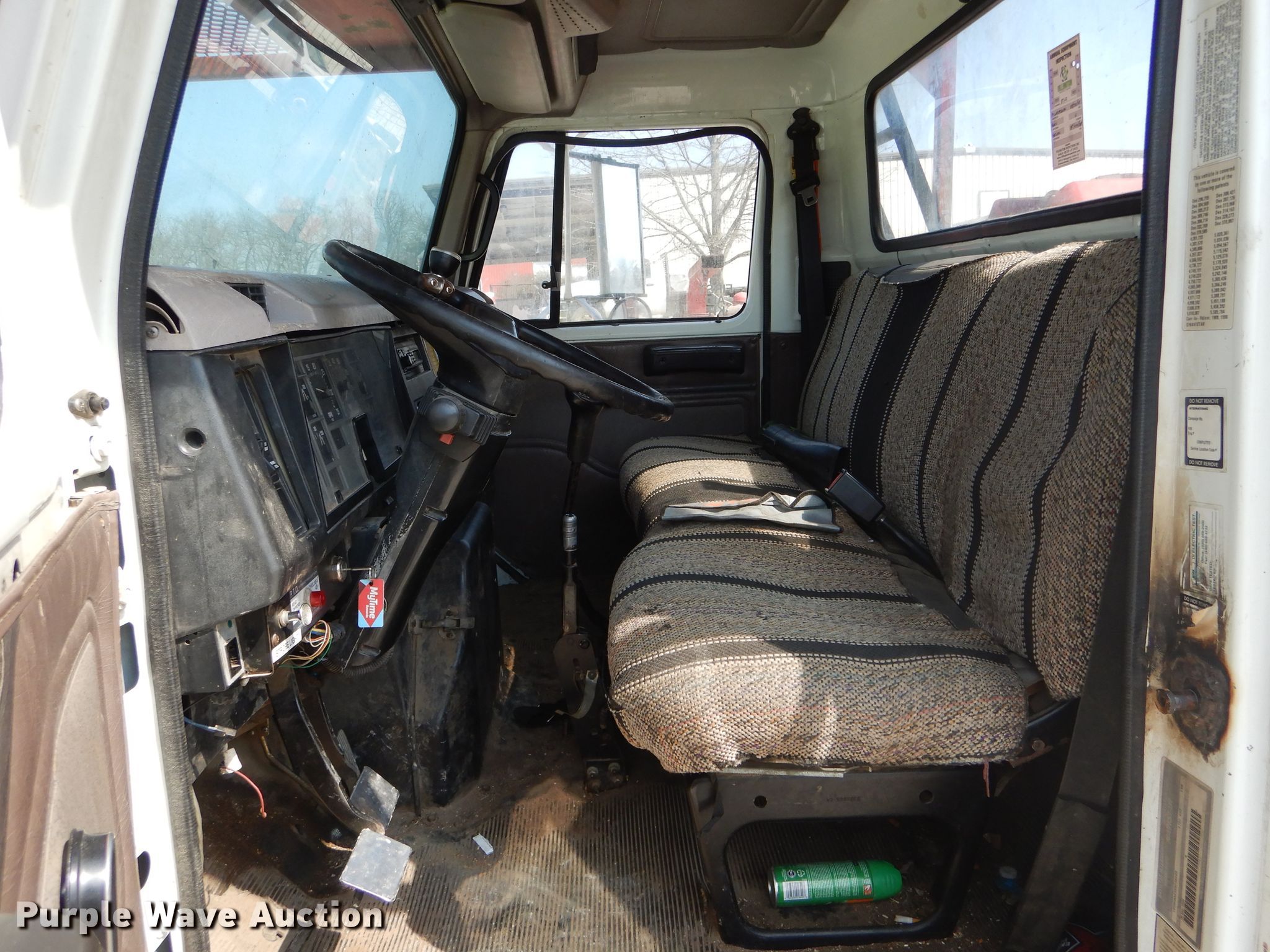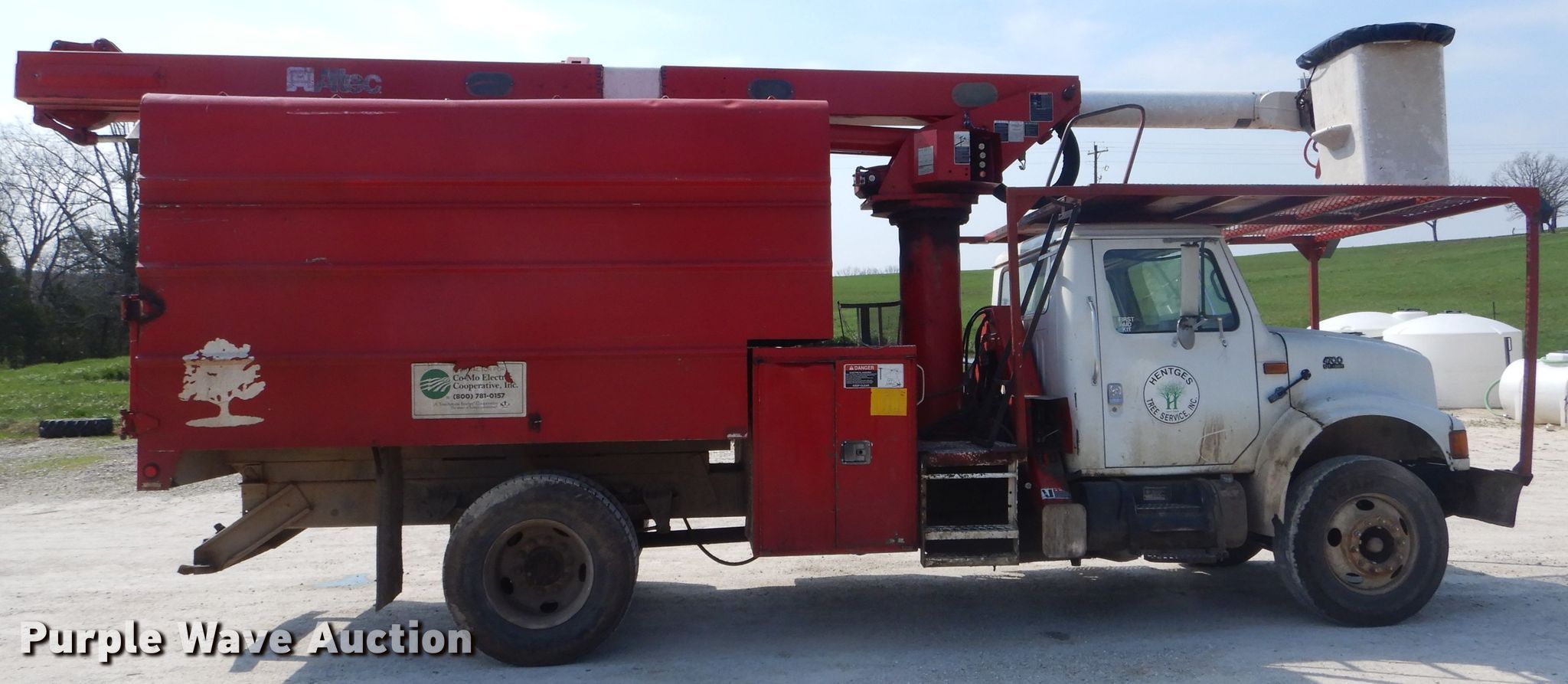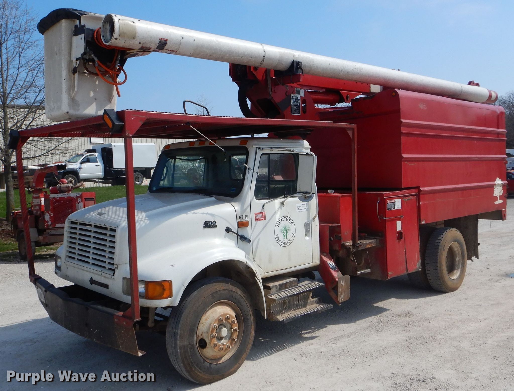 Purple Wave is selling a used Bucket Truck in Missouri. This item is a 2000 International 4700 bucket truck with the following: 63,935 miles on odometer, International DT466E 7.6L L6 diesel engine, Serial 469HM2U1169628, International 6Plus six speed manual transmission, Single axle, Heat, PTO, 14'L utility bed, Altec LRV58 articulating, insulated boom, 350 lbs maximum lift capacity, 58' maximum lift height, Man basket, Platform and ground controls,, Spring suspension, Hydraulic brakes, 188" wheelbase, 10R22.5 front tires, 11R22.5 rear tires, Contents not included, Cylinder leak, Unit# BT19