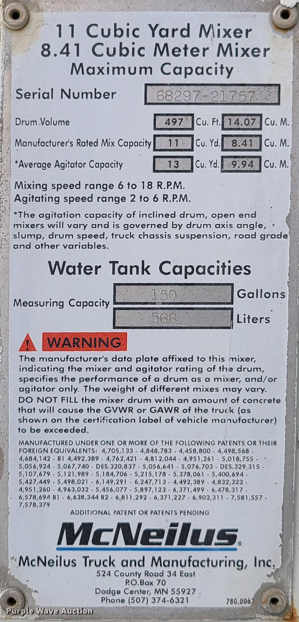 Purple Wave is selling a used Ready Mix or Pump Truck in Missouri. This item is a 2004 Kenworth W900B ready mix truck with the following: 218,198 miles on odometer, Cummins ISM 10.8L L6 diesel engine, Manual transmission, Triple axle, AC and heat, PTO, McNeilus ready mix bed, 11 cu.yd. capacity, In cab controls, Rear drum controls, Rear discharge, 150 gallon water tank, (3) chute extensions, Serial 6829721757, Walking beam suspension, Air brakes, 425/65R22.5 front tires, 255/70R22.5 lift axle tires, 11R22.5 rear tires, GVWR 79,200 lbs, Unit# 210