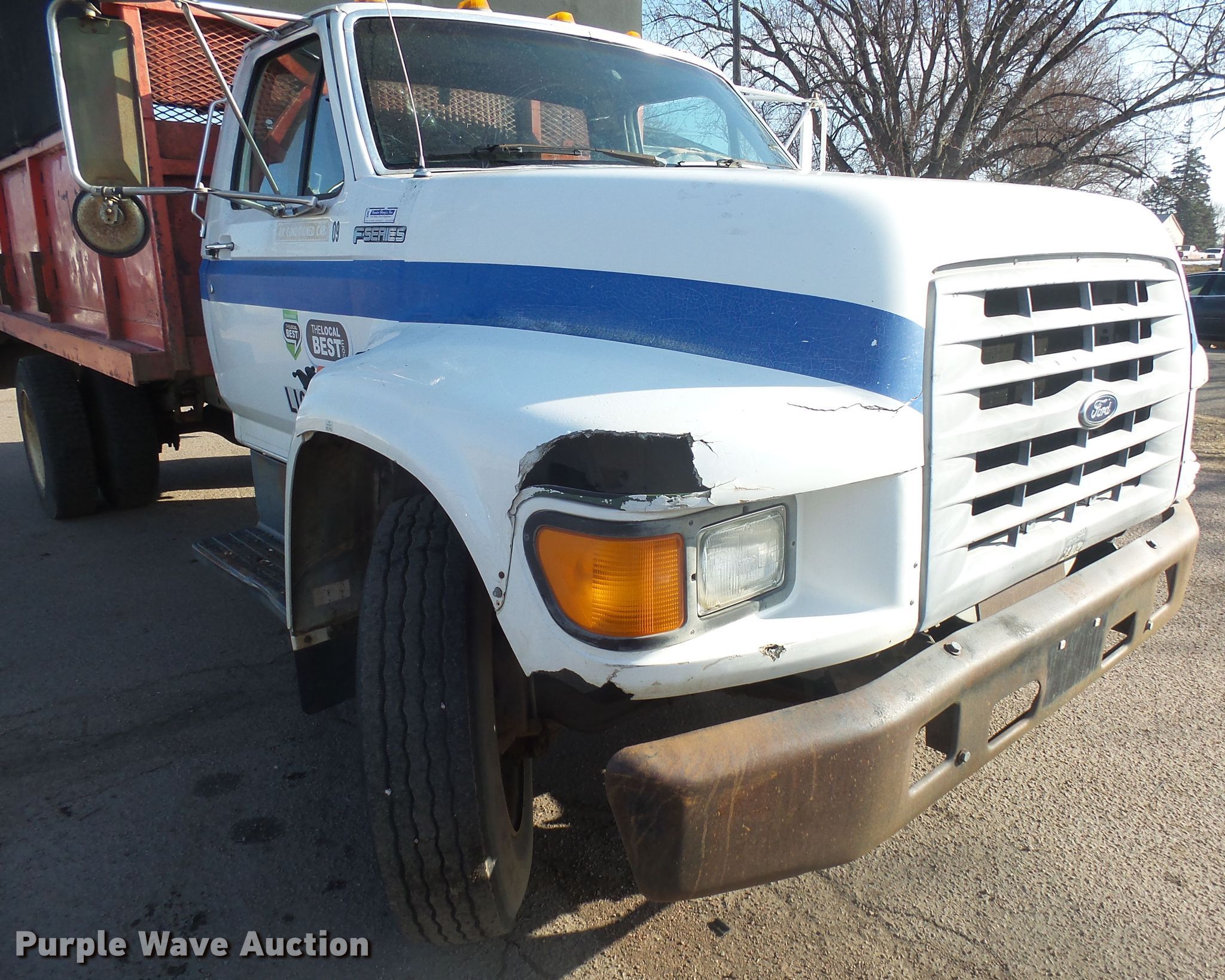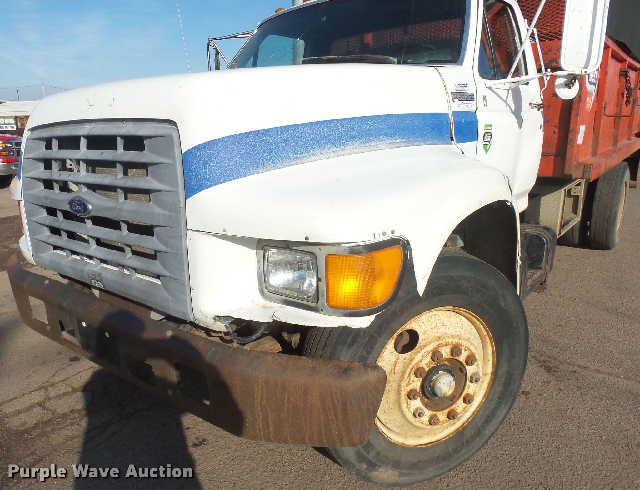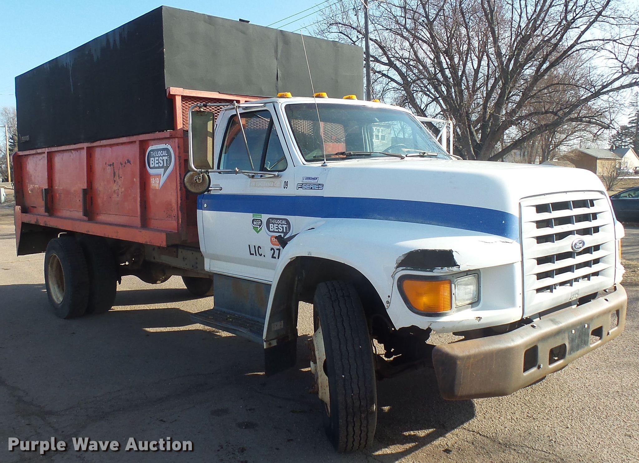 Purple Wave is selling a used Construction Dump Truck in South Dakota. This item is a 1998 Ford F700 chipper bed truck with the following: 158,214 miles on odometer, Ford 7.0L V8 diesel engine, Automatic transmission, Single axle, Heat, PTO, 14'L steel chipper bed, 32" side height, 38" side board height, Single ram hoist, Spring suspension, Hydraulic brakes, 10R22.5 tires, GVWR 26,000 lbs, FAWR 8,500 lbs, RAWR 17,500 lbs, Windshield cracked