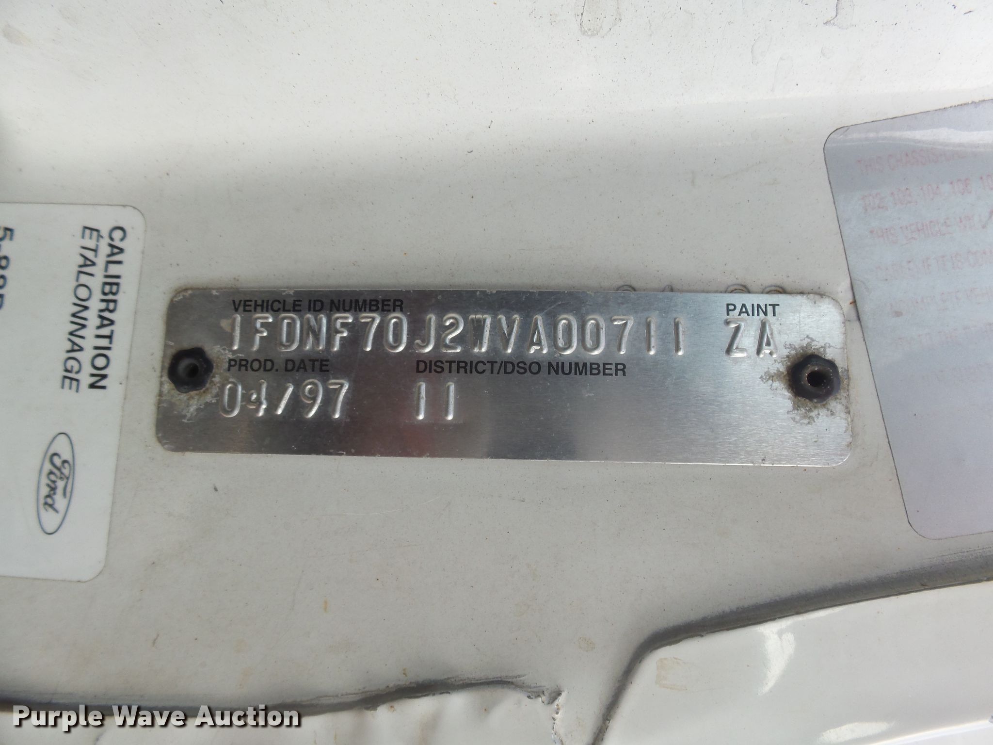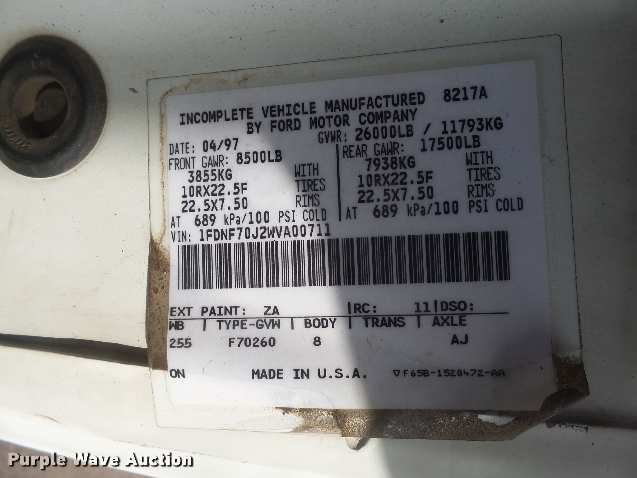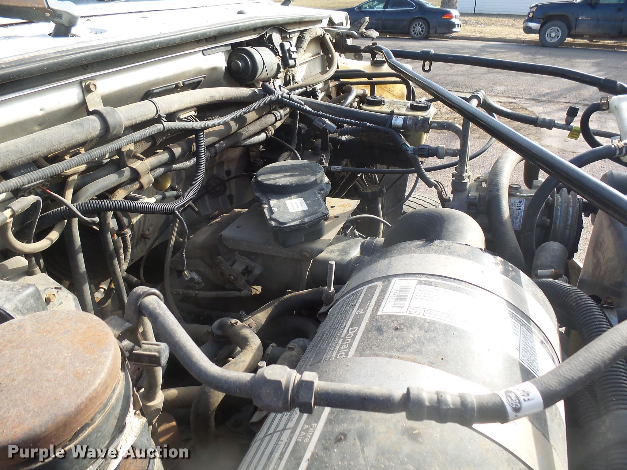 Purple Wave is selling a used Construction Dump Truck in South Dakota. This item is a 1998 Ford F700 chipper bed truck with the following: 158,214 miles on odometer, Ford 7.0L V8 diesel engine, Automatic transmission, Single axle, Heat, PTO, 14'L steel chipper bed, 32" side height, 38" side board height, Single ram hoist, Spring suspension, Hydraulic brakes, 10R22.5 tires, GVWR 26,000 lbs, FAWR 8,500 lbs, RAWR 17,500 lbs, Windshield cracked