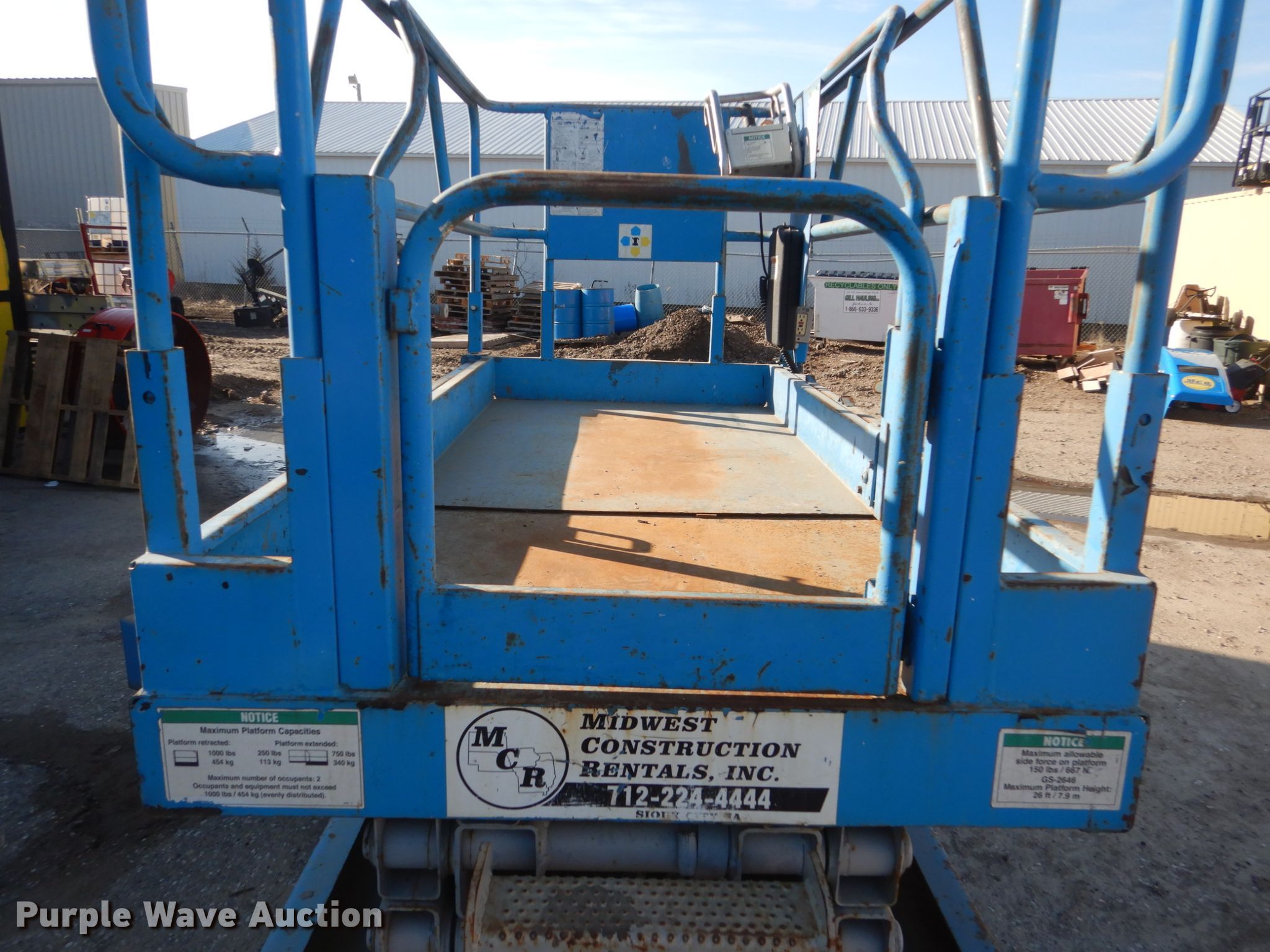 Genie GS-2646 scissor lift. 738 hours on meter, Serial: 8038. Electric motor. Operational Maximum lift capacity: 1,000 lbs, Maximum lift height: 32' 1", Platform: 89" L x 45.5" W, AC power outlet, Controls: Platform, Platform extensions: Manual. Tires Tire size: 15x5x11 1/4, Non marking. Midwest Construction Rentals, Inc.. 2100 4th St. Sioux City, IA 51101