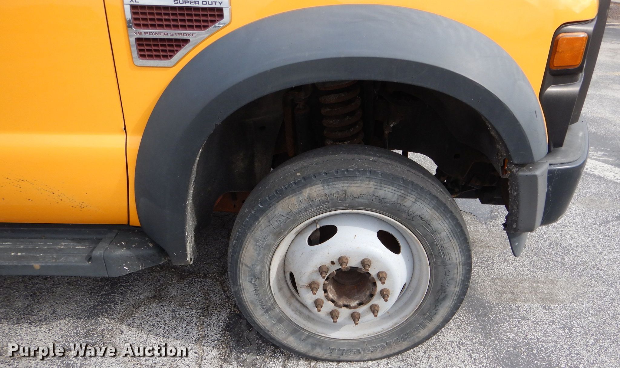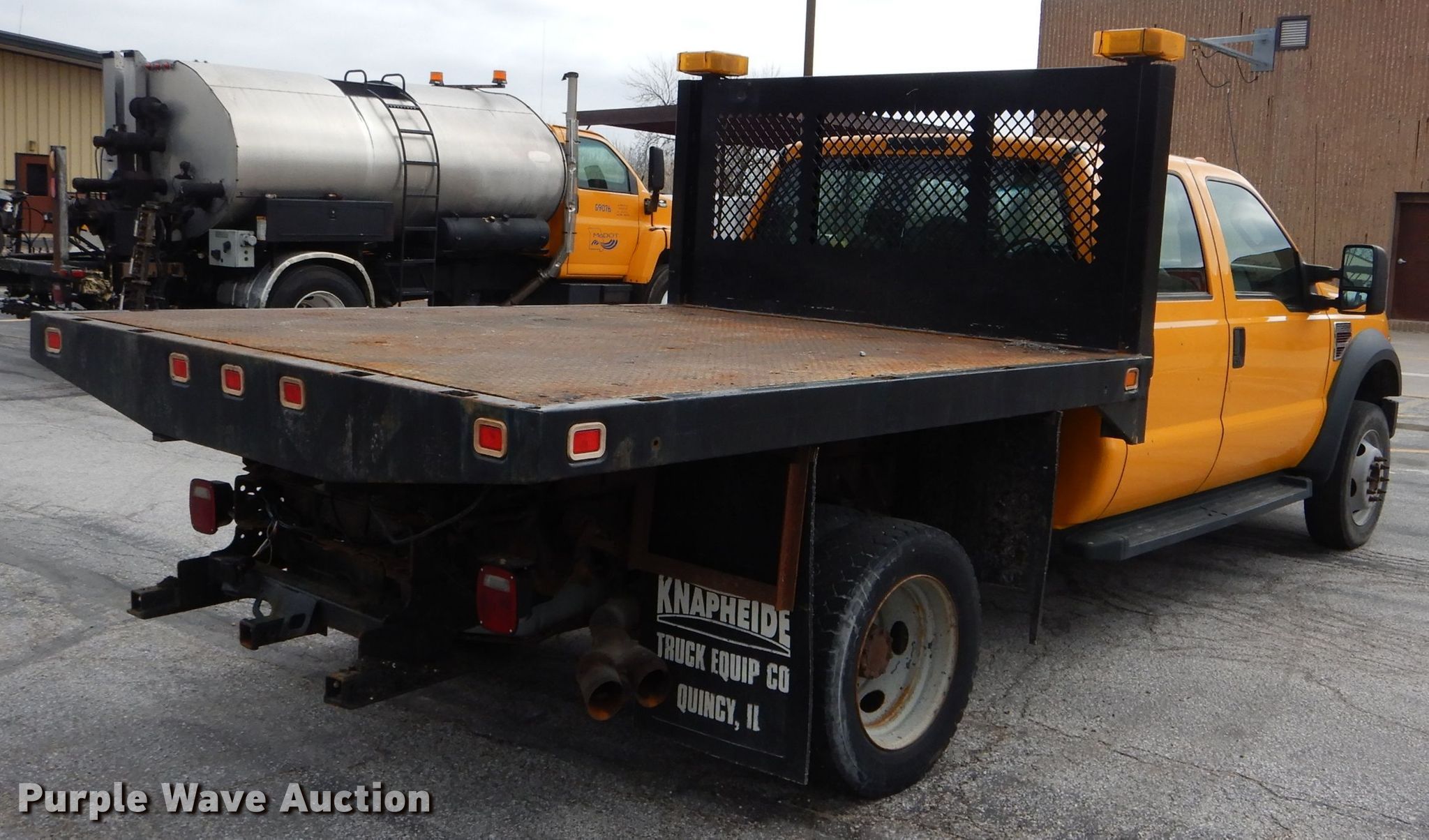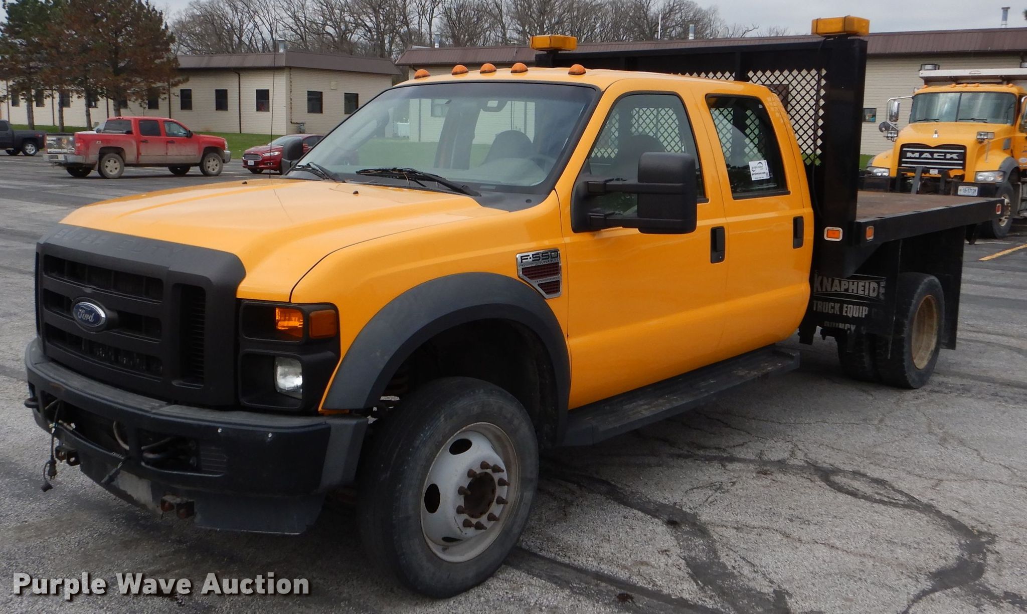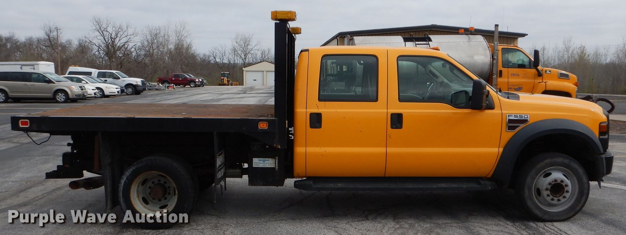 Purple Wave is selling a used Flat Bed Truck in Missouri. This item is a 2008 Ford F550 Super Duty XL Crew Cab dump flatbed truck with the following: 159,378 miles on odometer, 6.4L V8 OHV 32V diesel engine, Automatic transmission, AC and heat, Cruise, Knapheide PVMXT-93C dump flatbed, 9'L x 96"W, Single ram hoist, 225/70R19.5 tires, Hydraulic leak, MODOT ID 8149