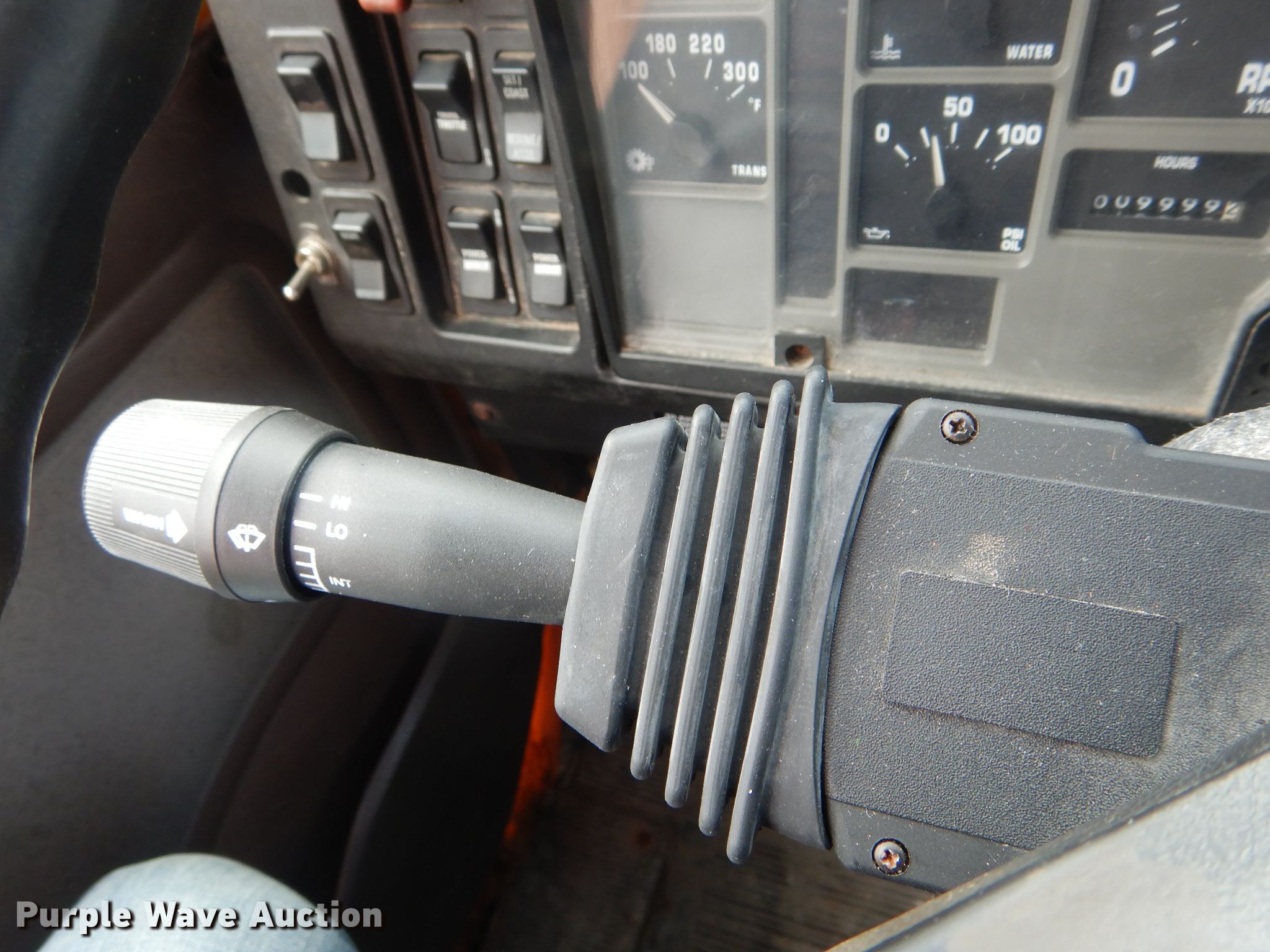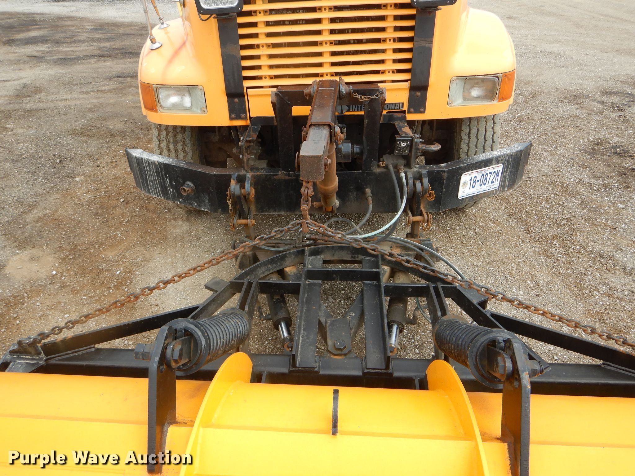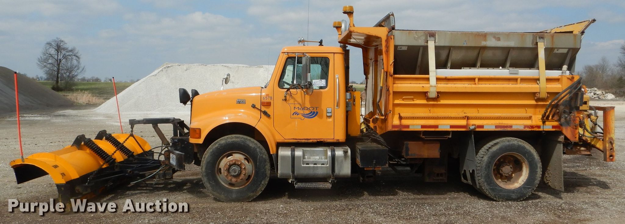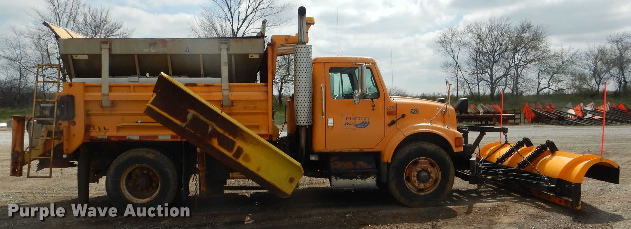 Purple Wave is selling a used Construction Dump Truck in Missouri. This item is a 2002 International 4900 dump truck with the following: 176,279 miles on odometer, 9,999 hours on meter, International DT466E 7.6L L6 diesel engine, Automatic transmission, Single axle, AC and heat, Cruise, Heated mirrors, Front mounted PTO, 10'L x 96"W steel dump bed, 34" side height, Single ram hoist, Air operated end gate, Unattached end gate included,, 144"W plow, 96"W wing plow, Spring suspension, Air brakes, 172" wheelbase, 315/80R22.5 front tires, 11R22.5 rear tires, MODOT ID 6578