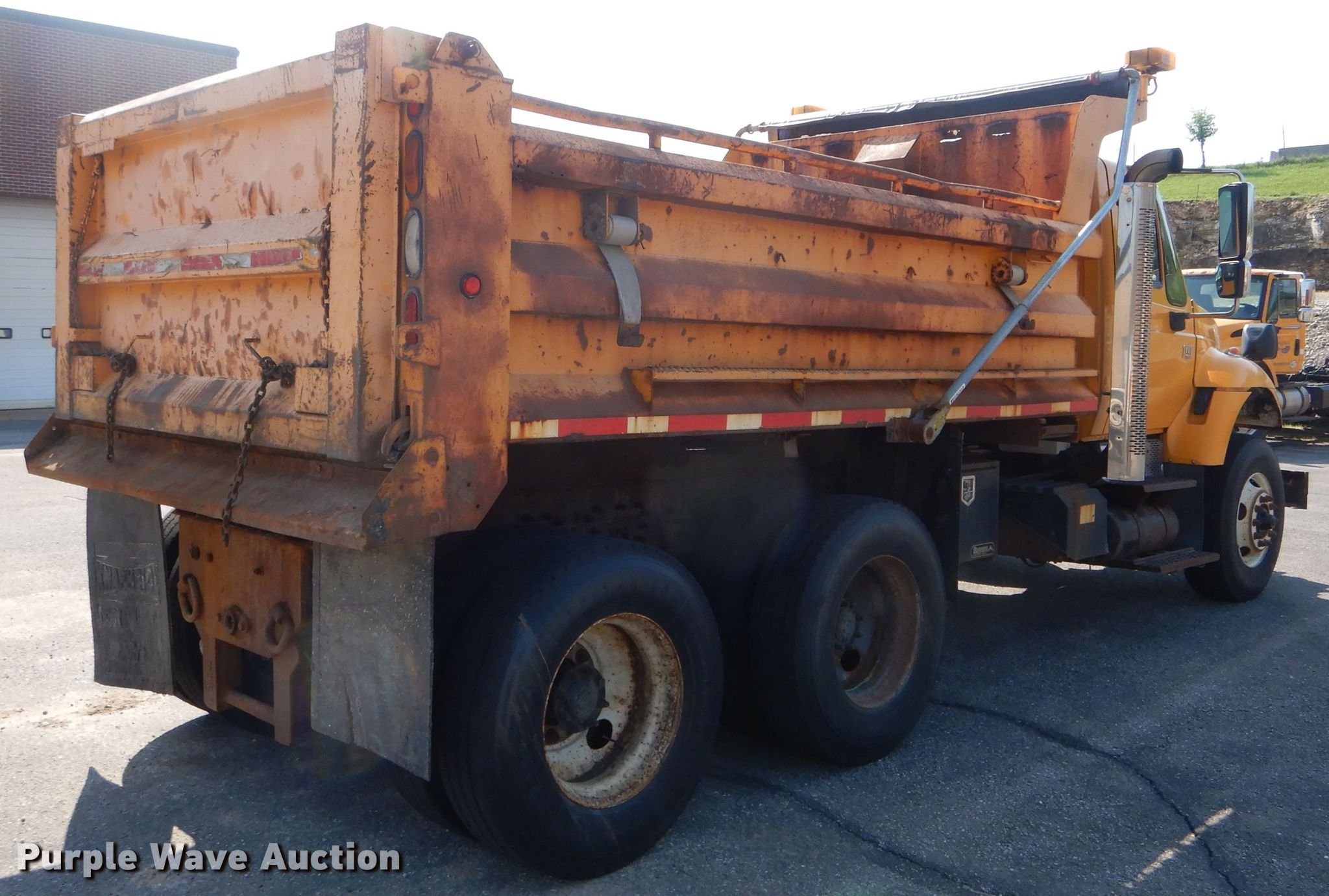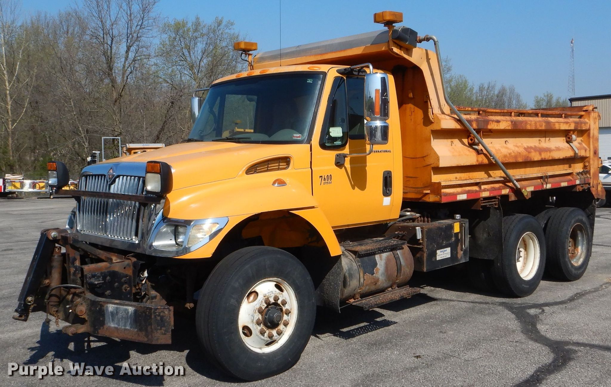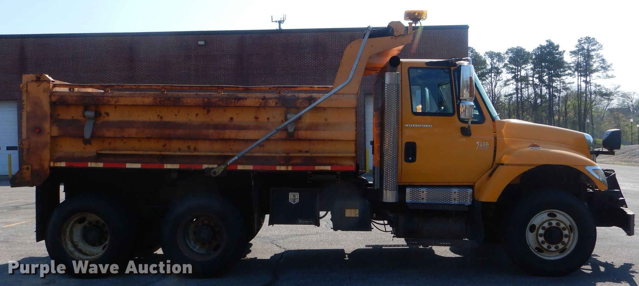 Purple Wave is selling a used Construction Dump Truck in Missouri. This item is a 2004 International 7400 dump truck with the following: 212,917 miles on odometer, 11,111 hours on meter, 8.7L L6 diesel engine, Automatic transmission, Inter-axle differential lock, Tandem axle, AC and heat, Cruise, Power windows, Heated mirrors, PTO, 13'L x 96"W steel dump bed, 36" side height, Single ram hoist, Air operated end gate, Roll tarp, Double frame, Spring over walking beam suspension, Air brakes, 315/80R22.5 front tires, 11R22.5 rear tires, MODOT ID 7161