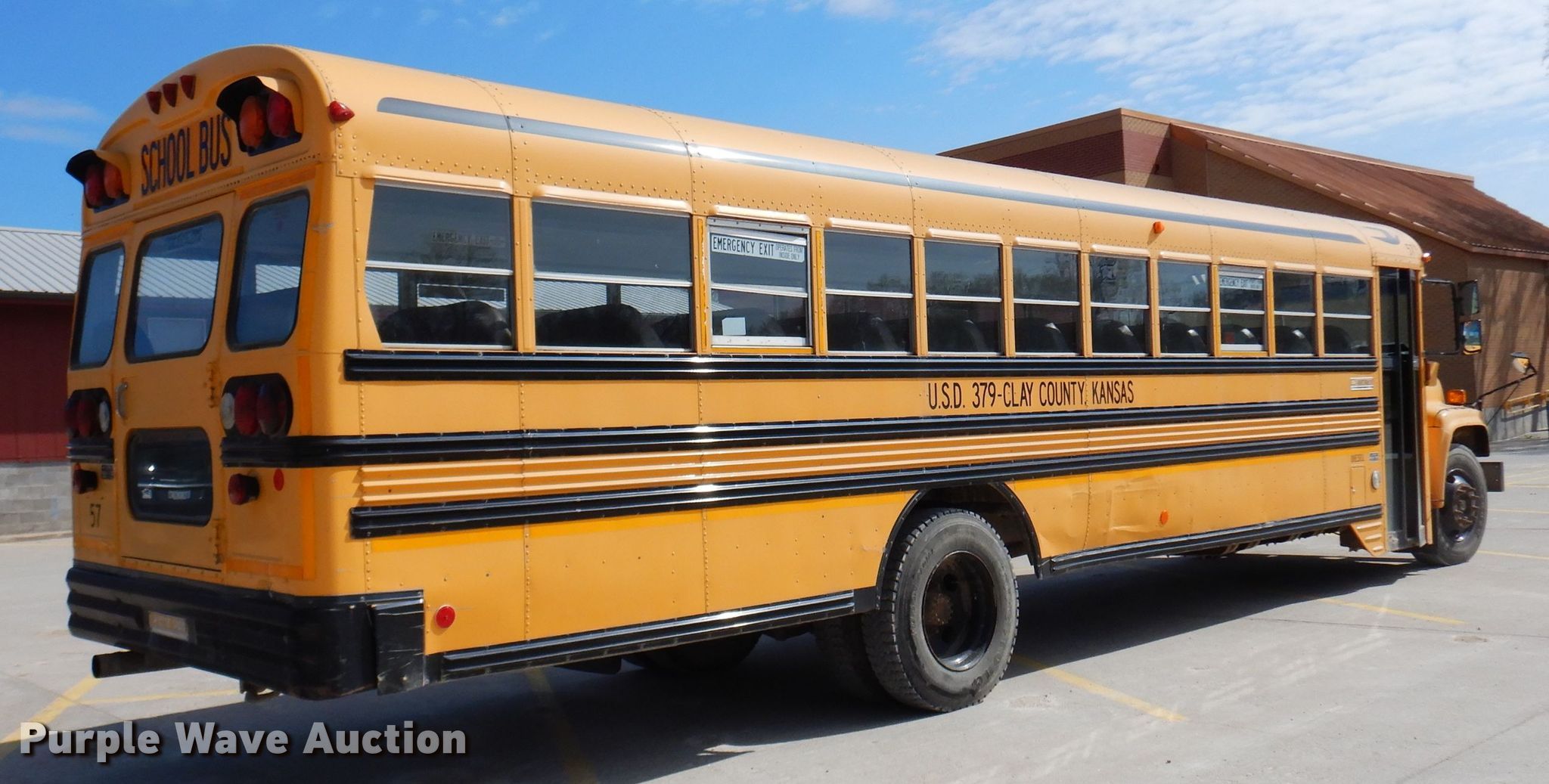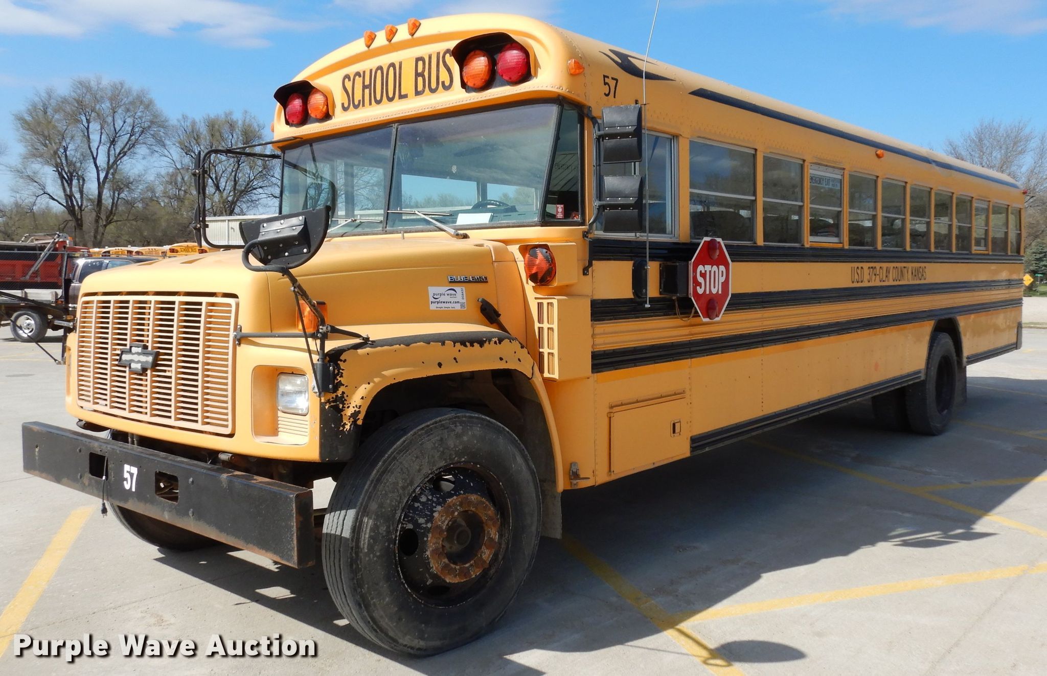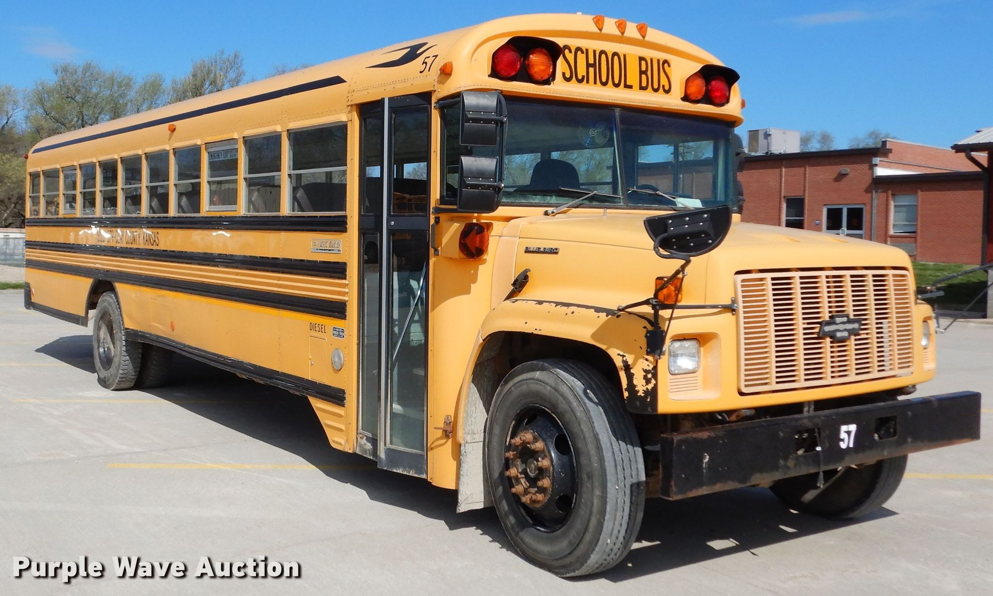 Purple Wave is selling a used Bus in Kansas. This item is a 1999 Chevrolet CV2000 school bus with the following: 209,315 miles on odometer, Caterpillar 3126 7.2L L6 diesel engine, 190 HP, Serial 7A552361, Automatic transmission, Single axle, Heat, Heated mirrors, 65 passenger capacity, Spring suspension, Hydraulic brakes, 261" wheelbase, Firestone 10R22.5 tires, GVWR 27,960 lbs, Decals will be removed prior to auction, Unit# 57