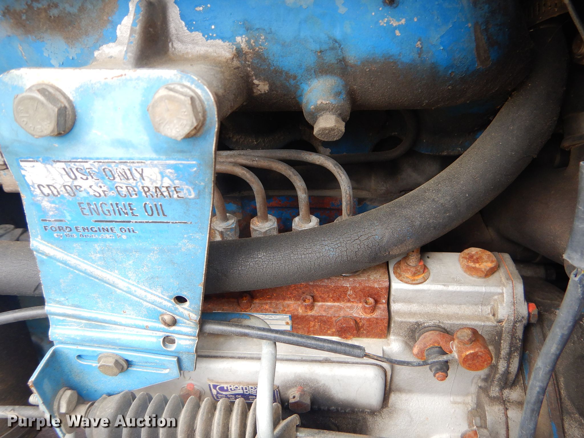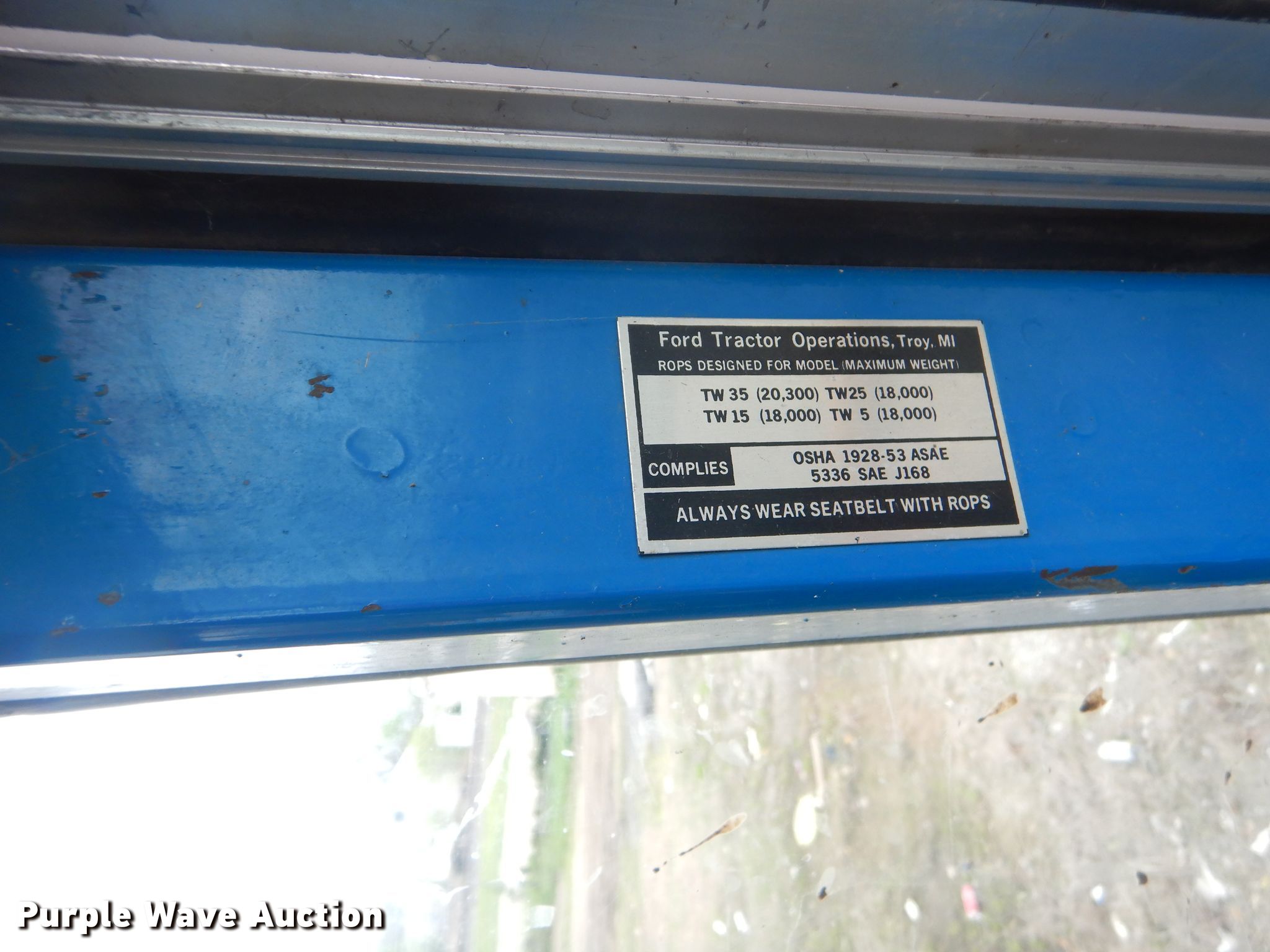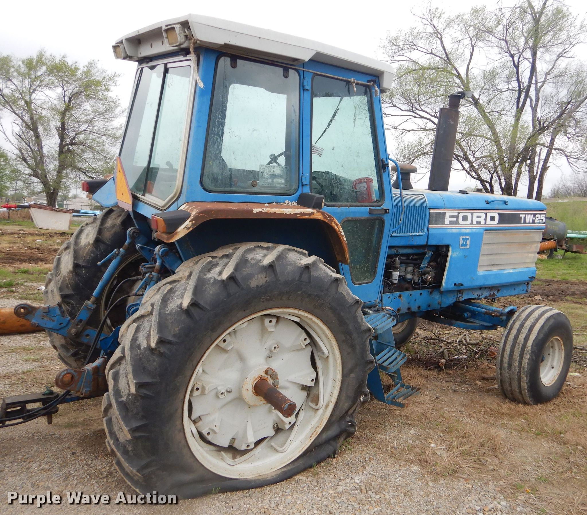 Purple Wave is selling a used Tractor in Kansas. This item is a 1987 Ford TW-25 tractor with the following: Unknown hours on meter, Ford six cylinder diesel engine, Serial 7F03A, Powershift transmission, 16F-4R gears, Serial 7F18B, AC and heat, Three point, Seven pin outlet, 540/1000 PTO, (2) rear hydraulic remote sets, 14L-16.1 front tires, 18.4-38 rear tires, Unattached dual rear tire included, Oil leaking out of freeze plug, Unknown operating condition, Serial A918371