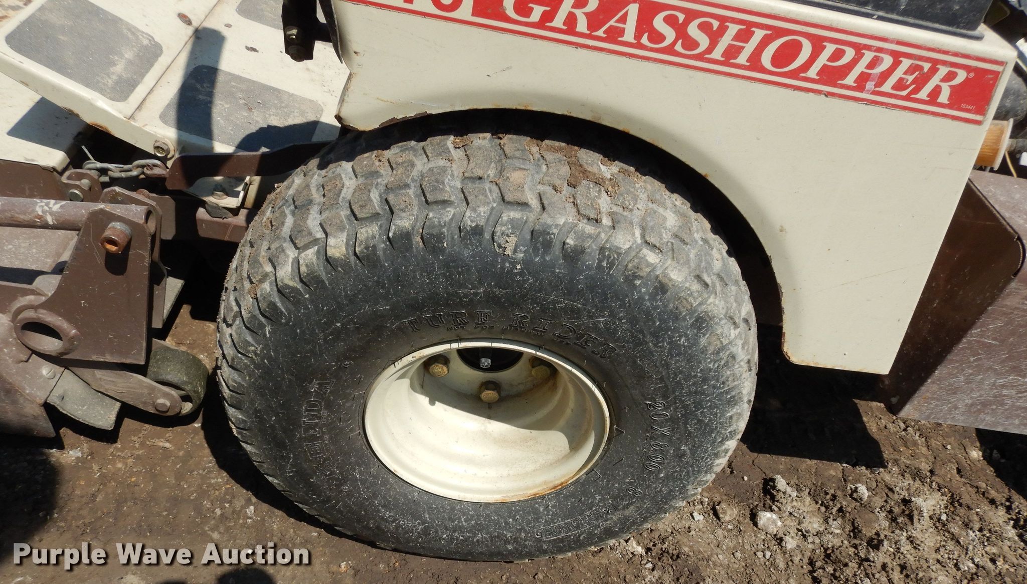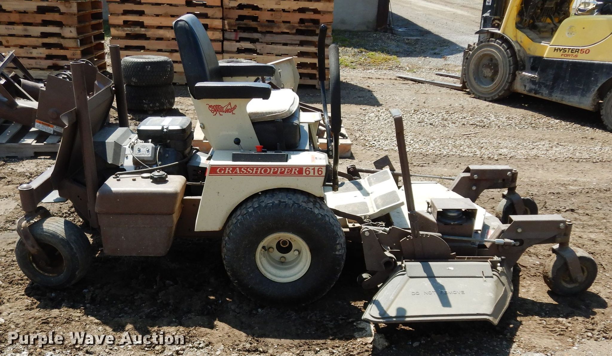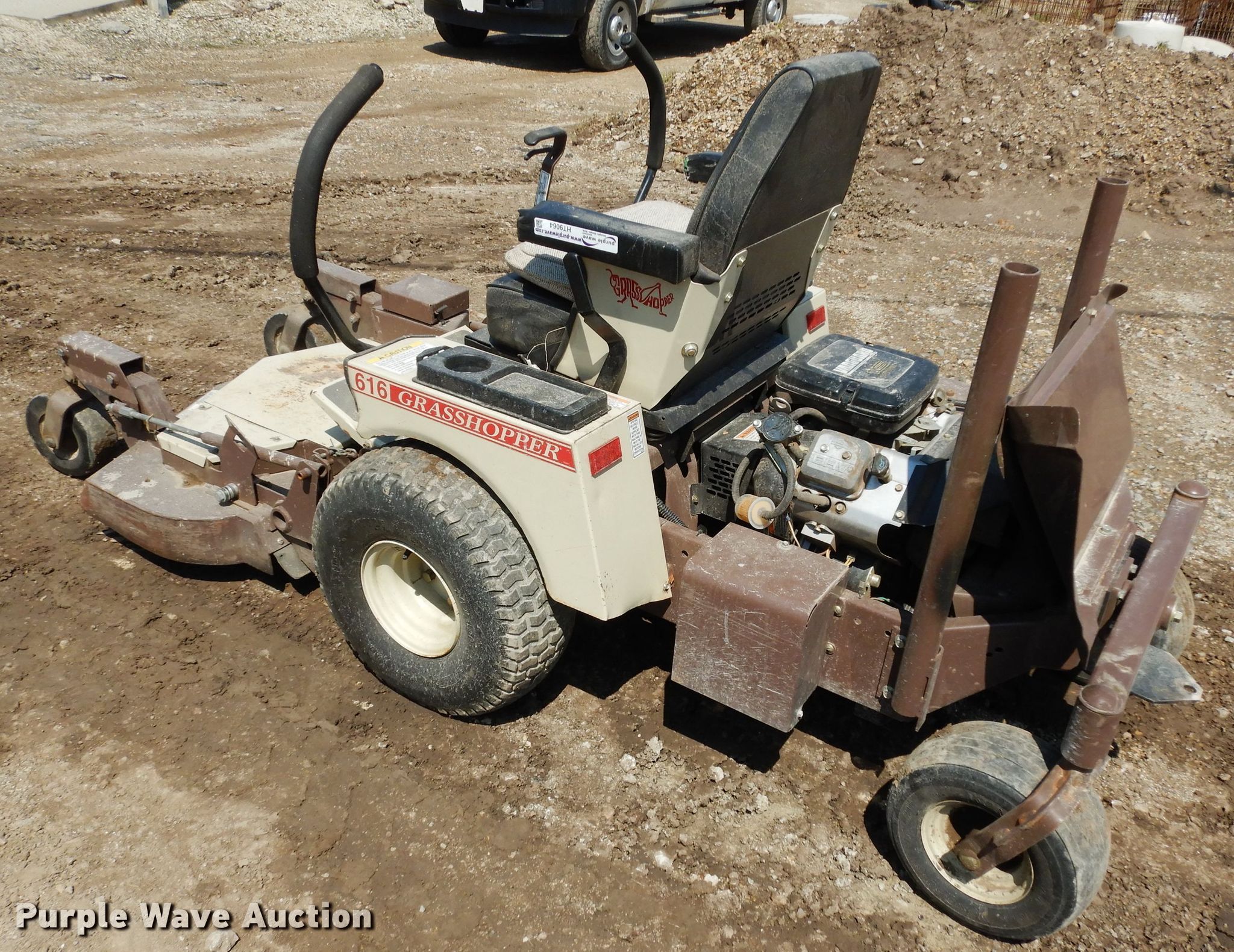 Purple Wave is selling a used Lawn Mower in Kansas. This item is a Grasshopper 616T2 lawn mower with the following: 42" cutting width, Briggs & Stratton two cylinder gas engine, 16 HP, Additional 48" blade, Model 480, Serial 5571153, Bagger, Kenda 20 x 8.00-8 front tires, Kenda 13 x 6.50-6 rear tires, Hole in bagger, Serial 5811280