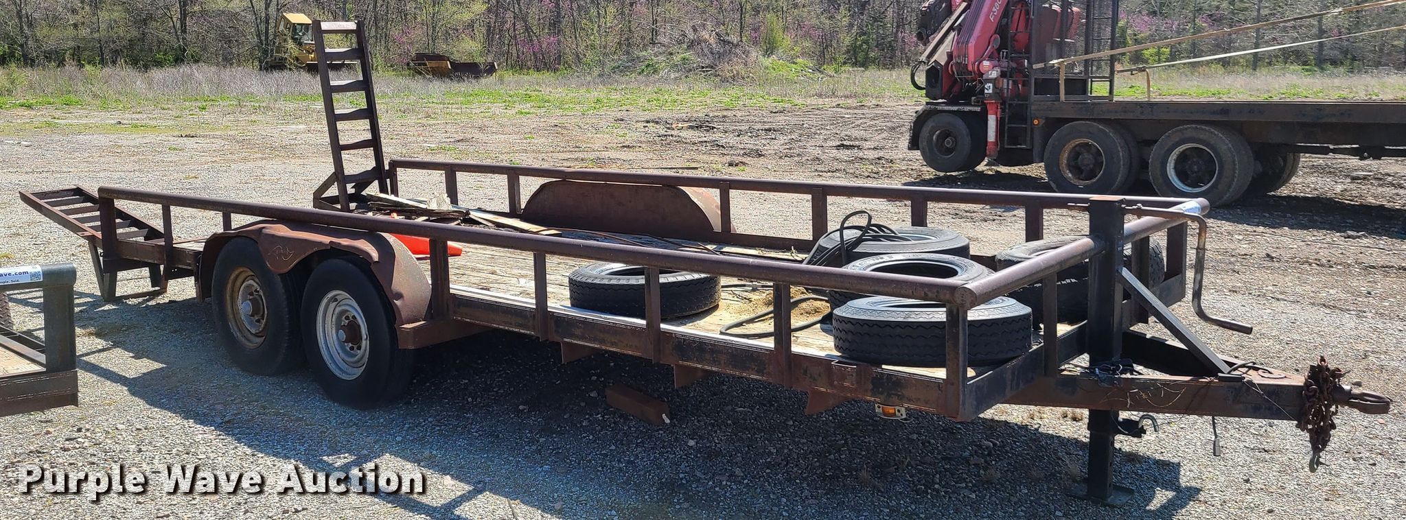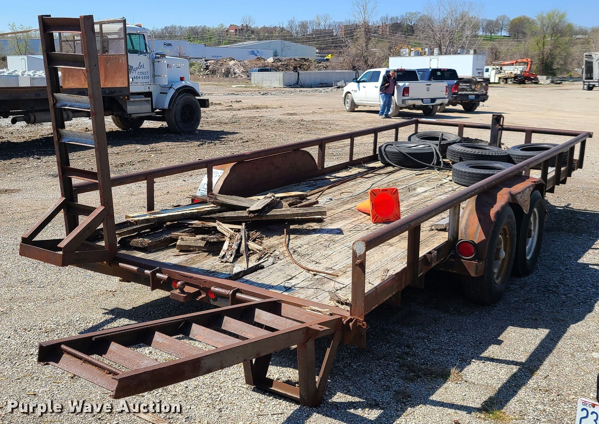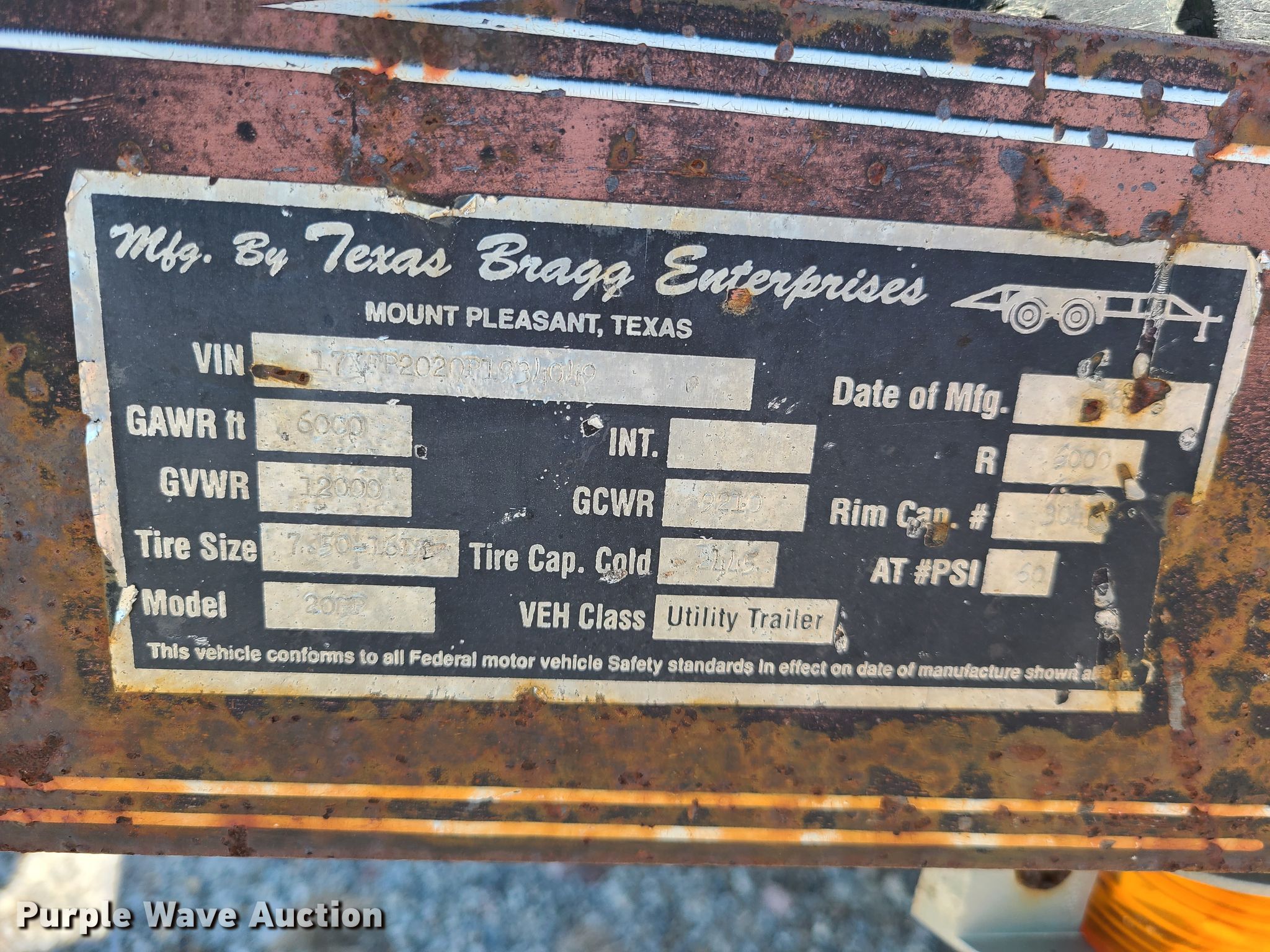 Purple Wave is selling a used Car or Utility Trailer in Missouri. This item is a 1993 Texas Bragg utility trailer with the following: 23'L x 102"W overall, 20'L x 82"W deck, 5'L ramps, Wood deck, Single leg landing gear, Spring suspension, Electric brakes, Tandem axle, 235/85R16 tires, GVWR 12,000 lbs, GAWR 6,000 lbs, Contents not included, Left rear tire and wheel not included, will be replaced with matching wheel