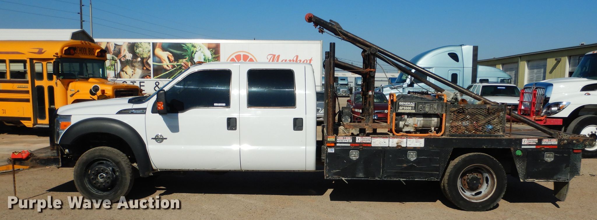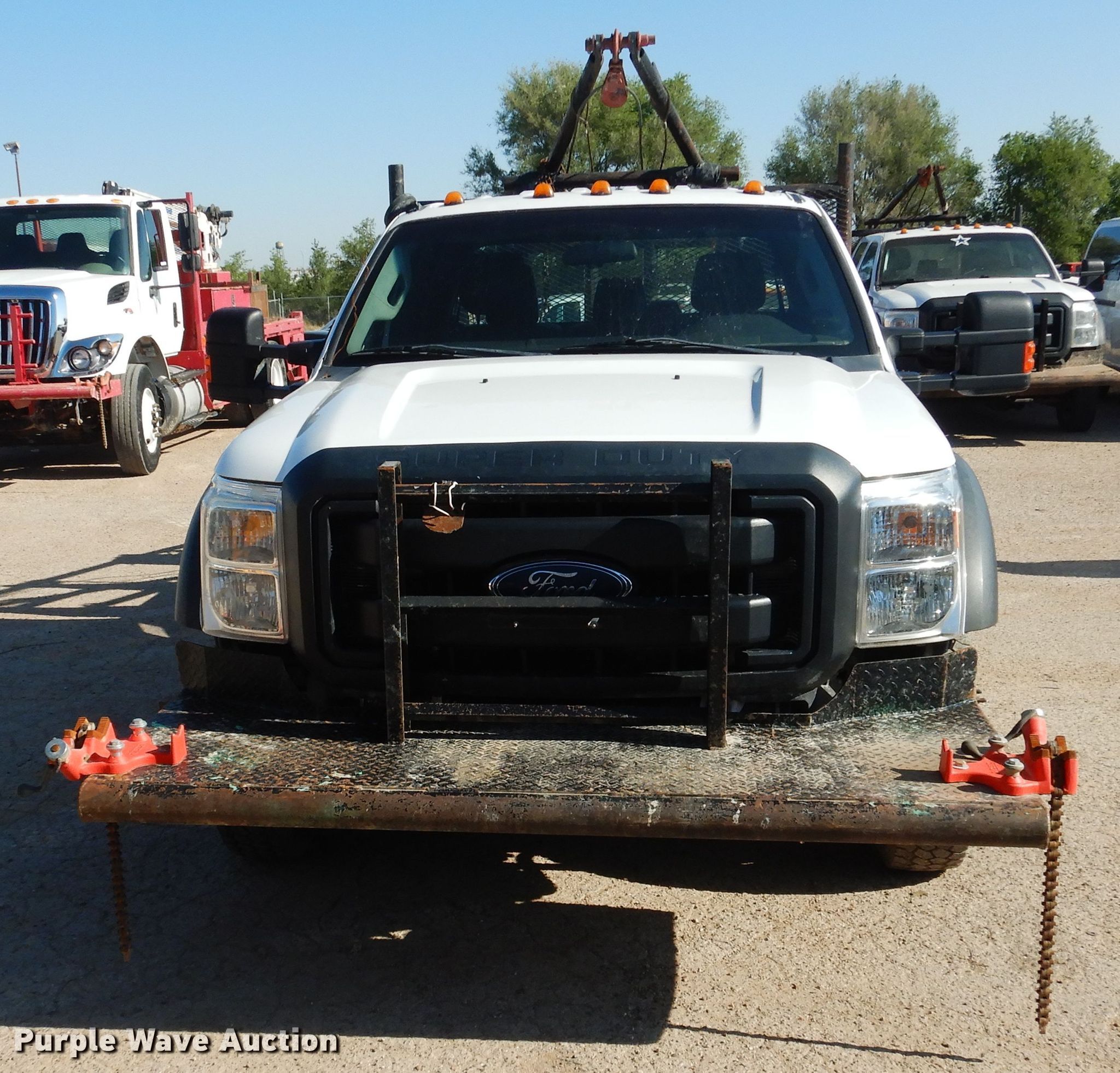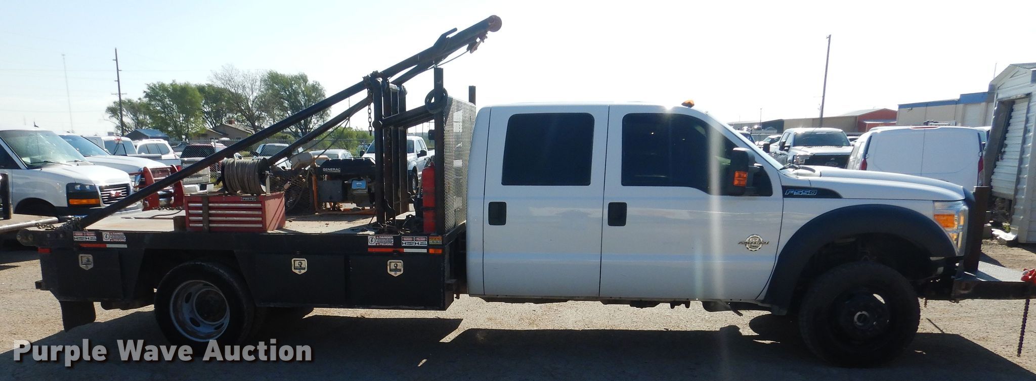 Purple Wave is selling a used Oilfield Truck in Texas. This item is a 2015 Ford F550 Super Duty winch truck with the following: 179,427 miles on odometer, 6.7L V8 OHV 16V diesel engine, Automatic transmission, Single axle, Four wheel drive, AC and heat, Power windows and locks, Flatbed, 11.5'L, 13'L gin poles, Spring suspension, Hydraulic brakes, 225/70R19.5 tires, GVWR 19,500 lbs, FAWR 7,000 lbs, RAWR 14,706 lbs