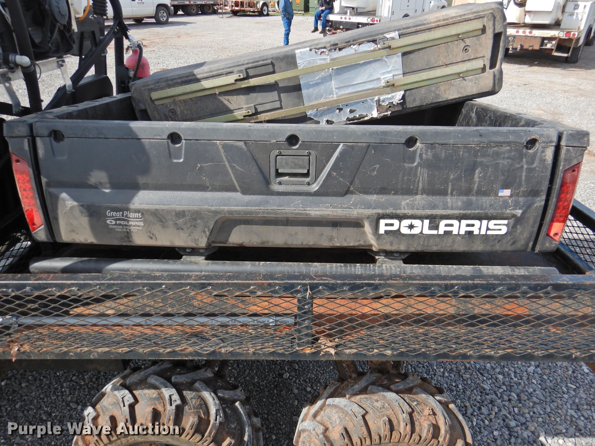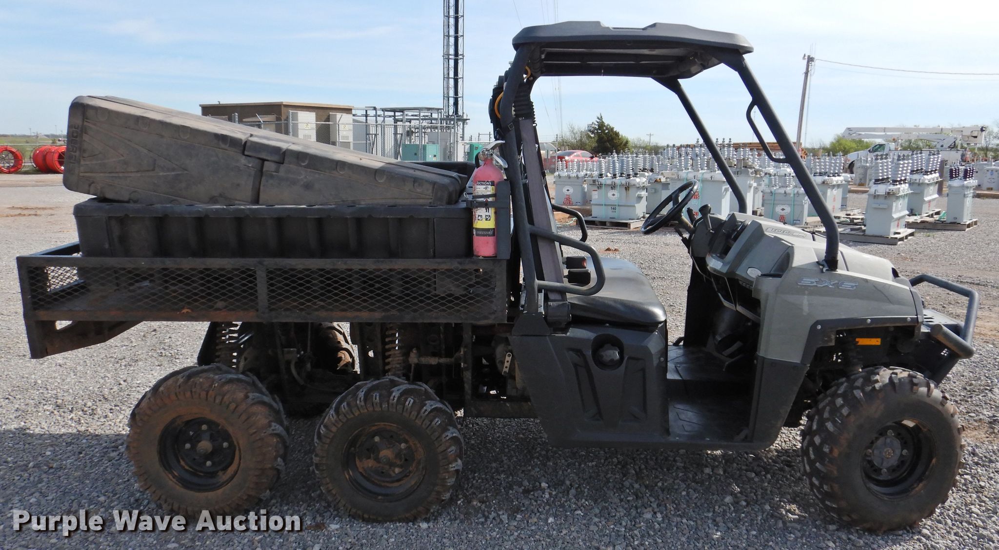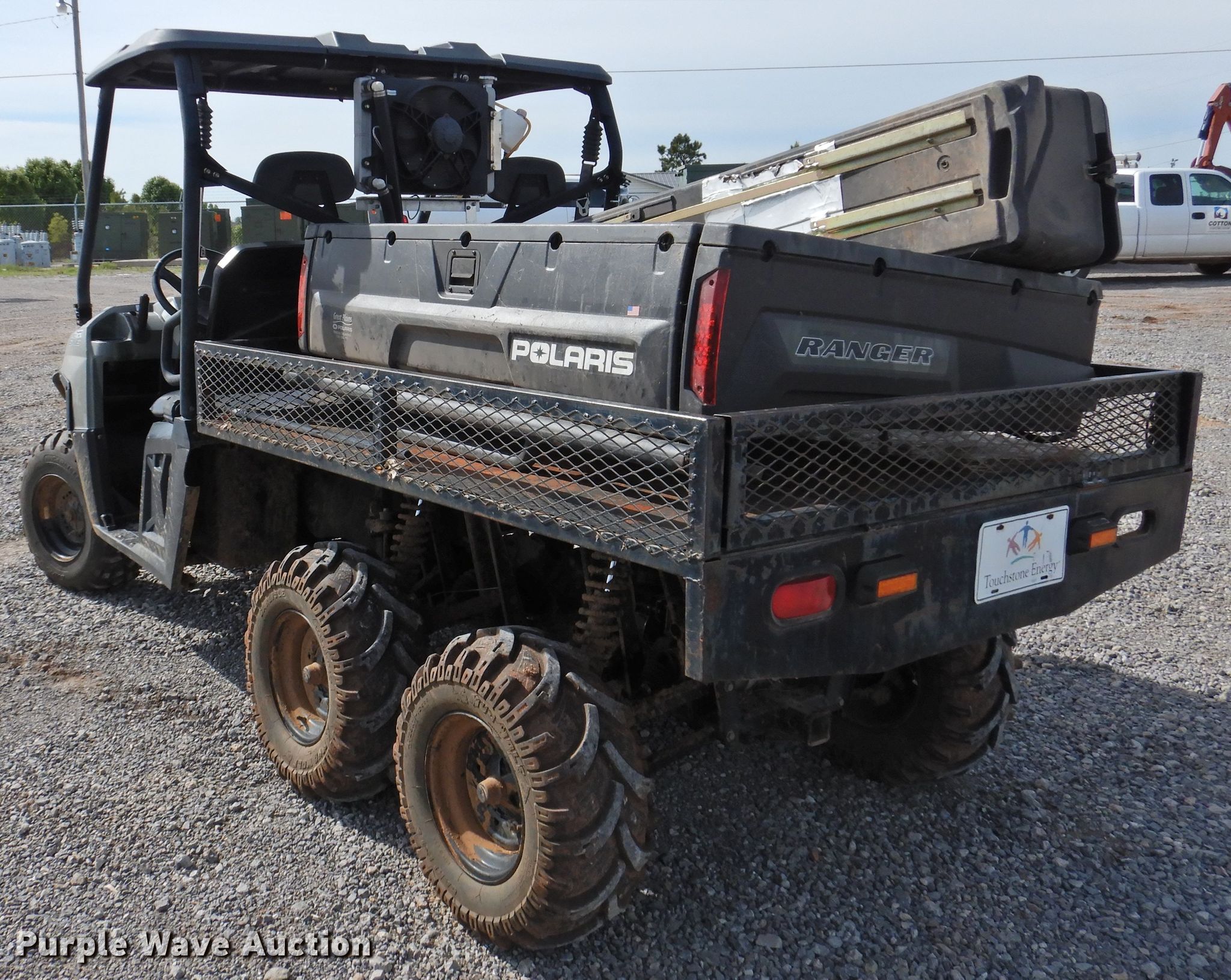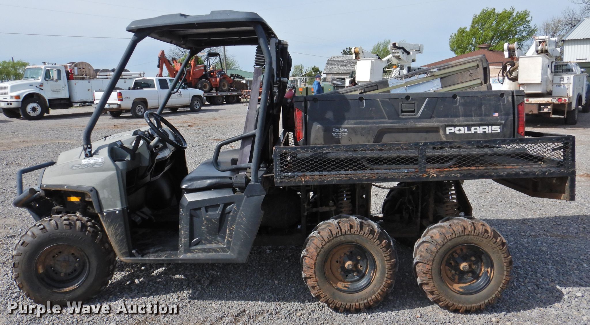 Purple Wave is selling a used Utility Vehicle in Oklahoma. This item is a 2011 Polaris Ranger utility vehicle with the following: 2,332 miles on odometer, 550 hours on meter, Polaris 800cc gas engine, Polaris CVT transmission, Six wheel drive, OROPS canopy, Three passenger capacity, Electric start, Grill guard, Winch, 54" x 42.5" x 11.5" dump bed, Manual dump, Receiver hitch, 25x10.00-12 front tires, AT25x11-12 rear tires