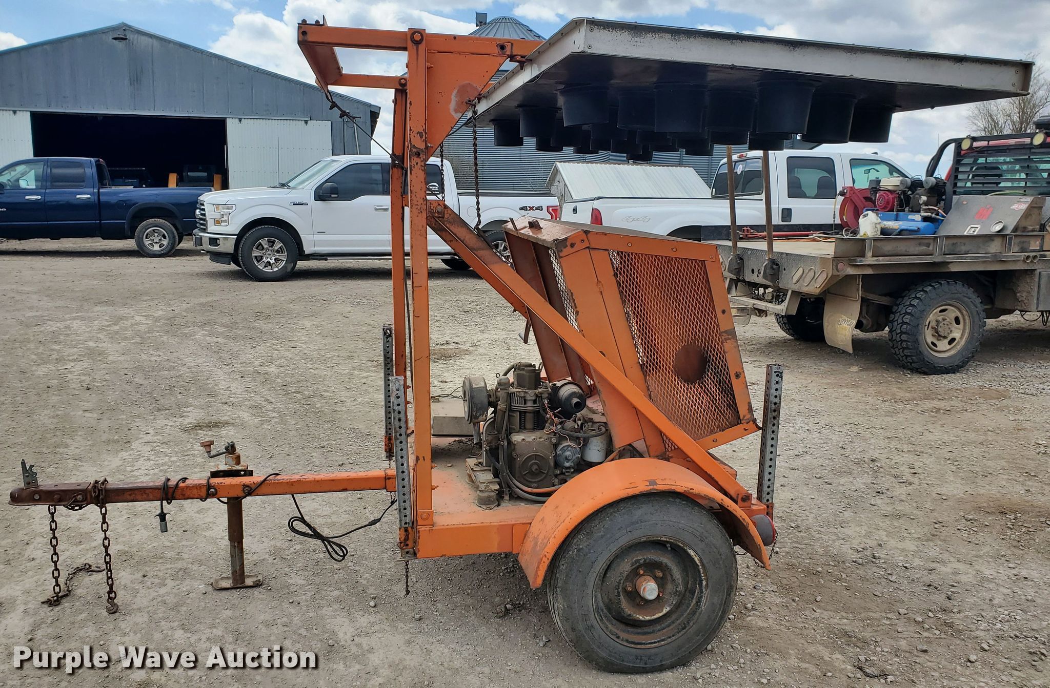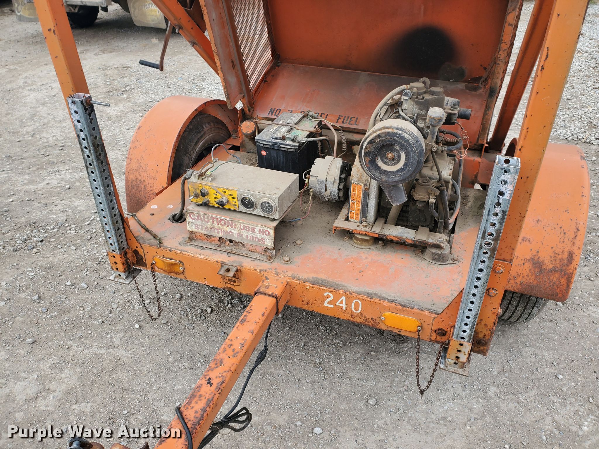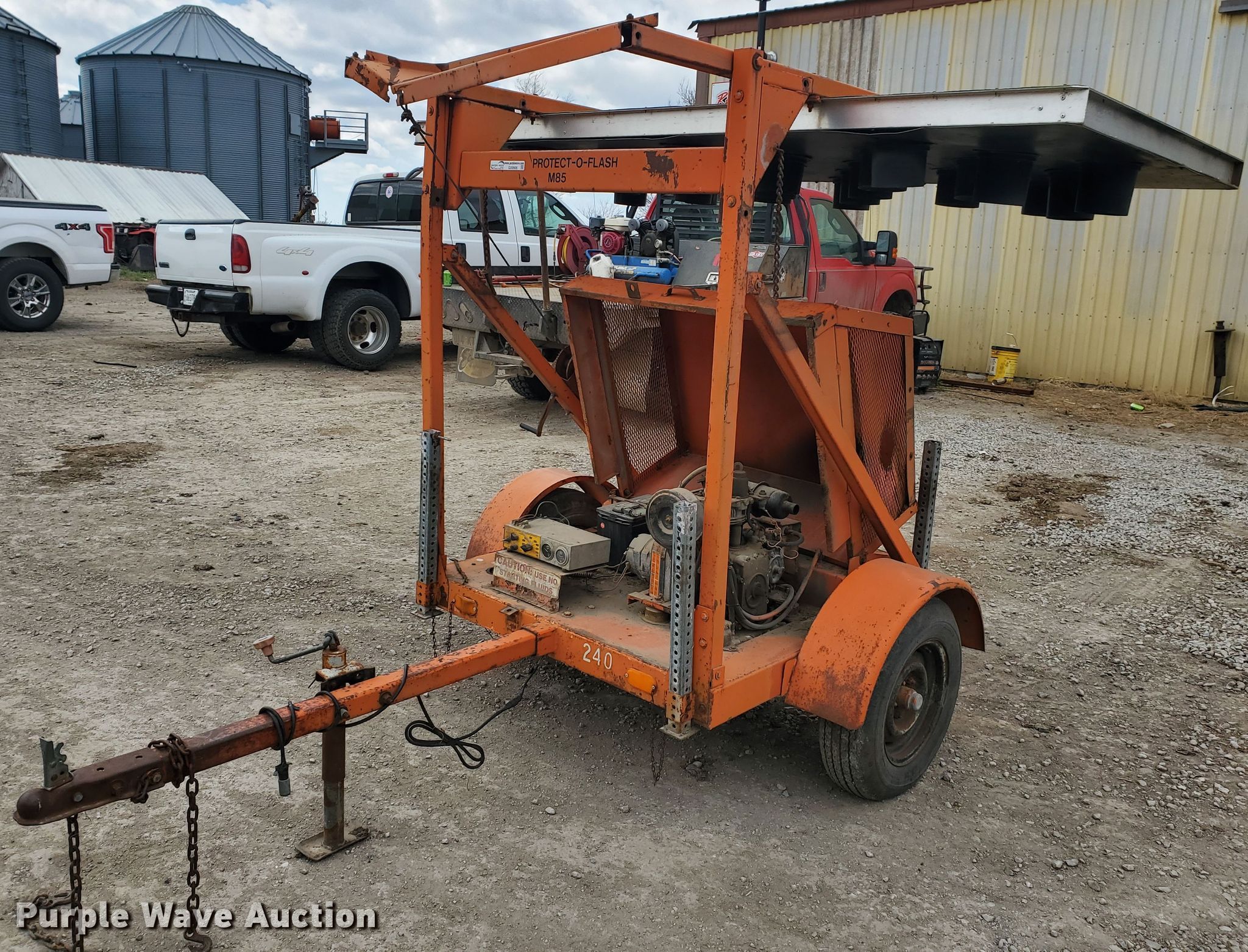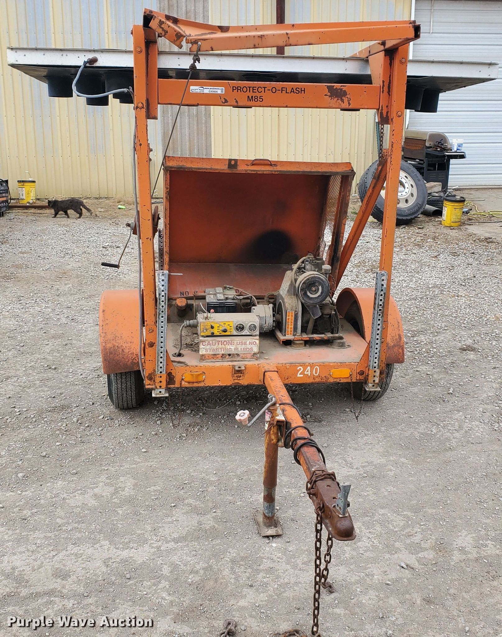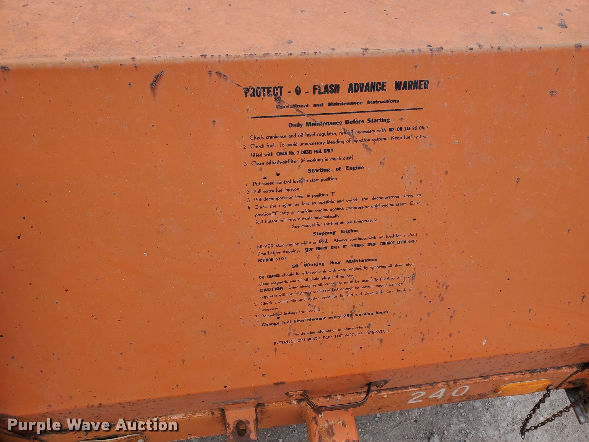 Purple Wave is selling a used Road Safety Equip. in Kansas. This item is a Protect-O-Flash arrow board trailer with the following: Lombardini single cylinder diesel engine, Light controller switches, 2" ball hitch, 185/75R14 tires, Some bulbs may need to be replaced, Serial 2862121