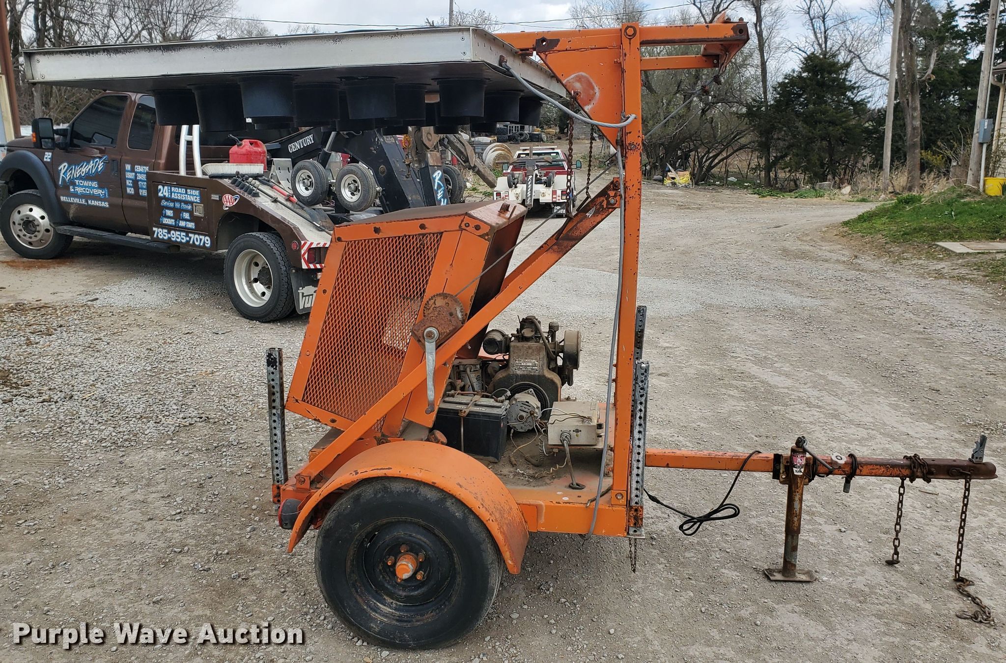 Protect-O-Flash arrow board trailer. Lombardini single cylinder diesel engine, Light controller switches, 2" ball hitch, 185/75R14 tires, Some bulbs may need to be replaced, Serial 2862121. Transfer of ownership documentation will be a bill of sale. Renegade Towing & Recovery. 1882 190th Rd. Belleville, KS 66935