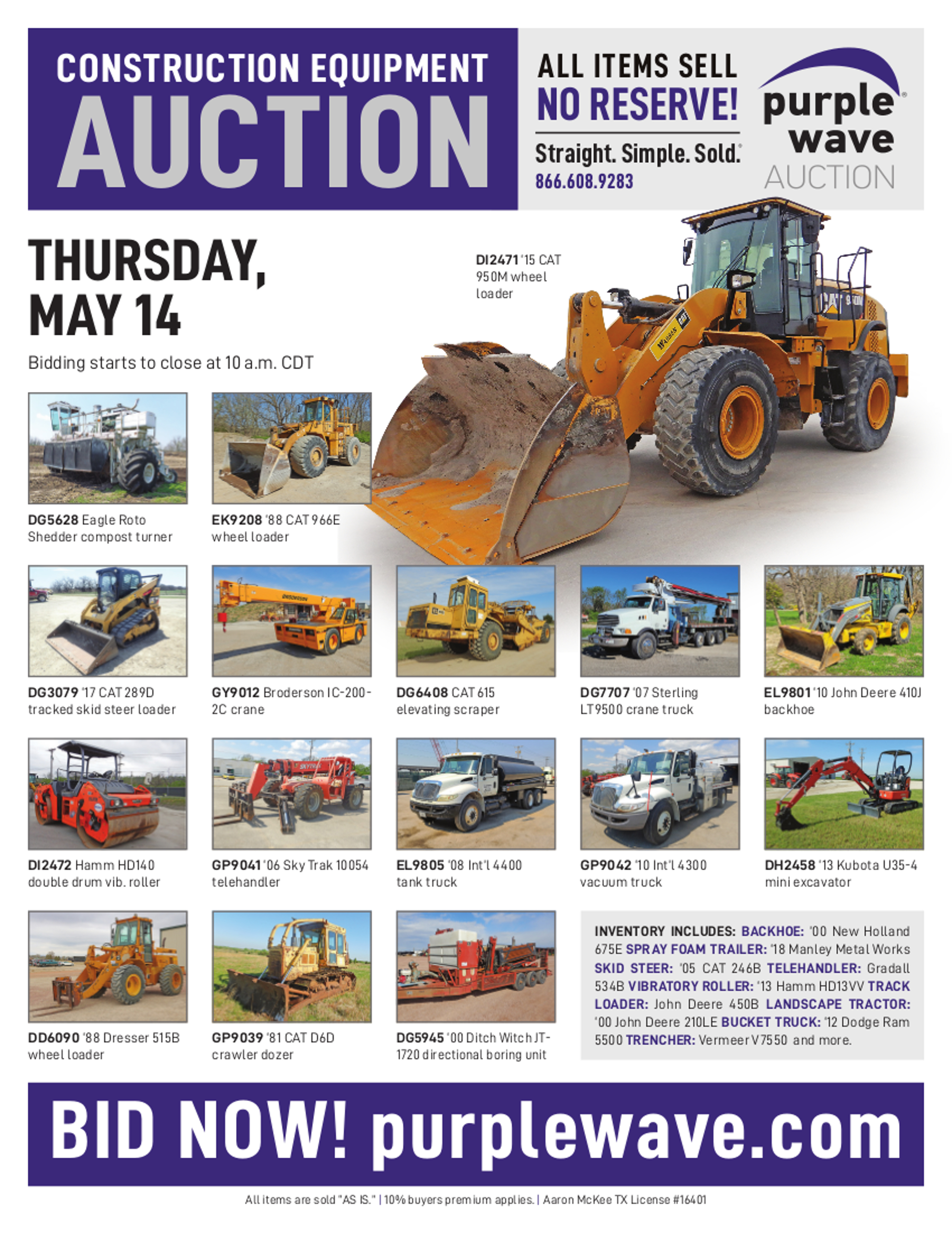 This auction is conducted by Purple Wave, Inc., whose home office is 825 Levee Drive, Manhattan, Kansas. Aaron McKee, Texas auctioneer license # 16401, operates Purple Wave, Inc. Complaints against us may be directed to the Texas Department of Licensing and Regulation, P.O. Box 12157, Austin, Texas 78711, (512) 463-6599. For additional required information, see the attached document.