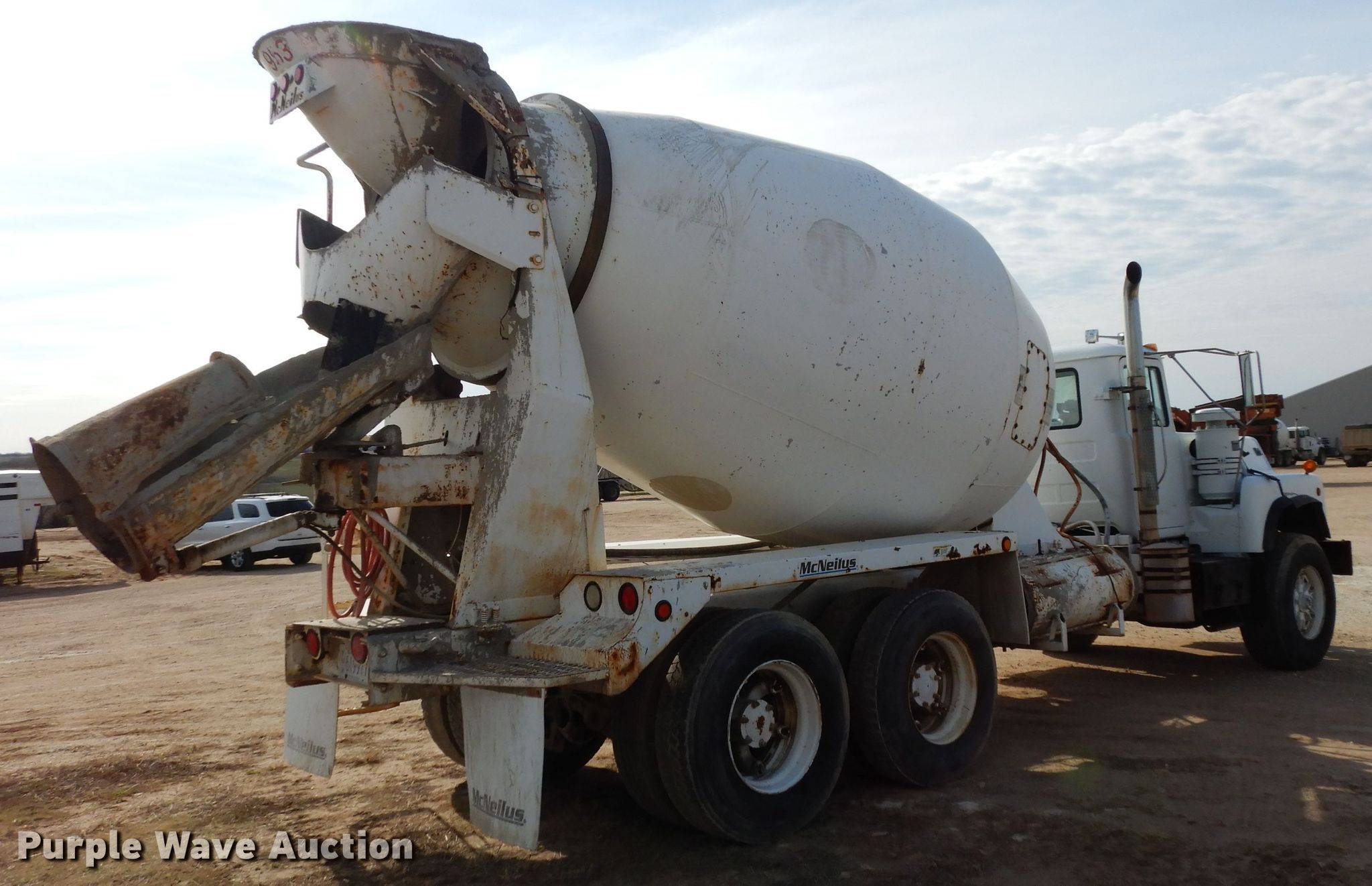 Purple Wave is selling a used Ready Mix or Pump Truck in Kansas. This item is a 1995 Mack DM690S ready mix truck with the following: 65,944 miles on odometer, 22,281 hours on meter, Mack 12.0L L6 diesel engine, Maxitorque 10 speed manual transmission, Tandem axle, AC and heat, McNeilus ready mix bed, Nine cu.yd. capacity, Rear discharge, Rear drum controls, 150 gallon water tank, (3) steel chute extensions, Camelback suspension, Air brakes, 214" wheelbase, 425/65R22.5 front tires, 11R22.5 rear tires, Non-operational AC