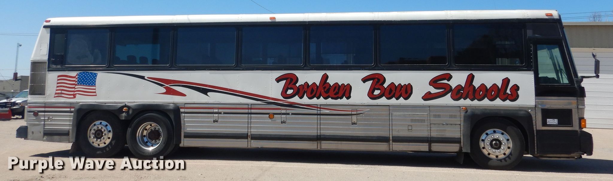 1989 MCI 102A3 coach bus. 997,366 miles on odometer, Detroit Diesel 8V92TA 12.1L V8 diesel engine, Five speed manual transmission, Tandem axle, AC and heat, Heated mirrors, Brake controller, Electric passenger sliding door, On-board restroom, 47 passenger capacity, Air suspension, Air brakes, 285" wheelbase, Continental 315/80R22.5 tires, GVWR 40,000 lbs, Unused replacement front window included, Additional parts, Maintenance and parts manuals, Cracked windshield, Passenger climate control issues, CB not included, Tools not included. Nebraska title. 1TUFCH8AXKR007212. Broken Bow Public Schools. 323 N 7th Ave. Broken Bow, NE 68822